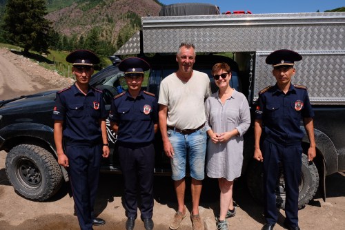 Om 14.30 uur zijn we weer terug in het groene dal maar vinden het nog te vroeg om een plekje te zoeken. We twijfelen: strand en zon of bergen en koelte? Uiteindelijk rijden we toch de vallei van Jeti-Oguz in. Hmm, best een beetje druk hier. Omdat we al wat later zijn en er donkere wolken boven de rest van de vallei hangen, gaan we op een picknickplek aan de rivier staan. Aan belangstelling geen gebrek! Zwaaien, toeteren en op de foto, gezellig. We peuzelen de gescoorde gegrilde kip op met een Red Velvet biertje en de bijzondere ashlyanfu-salade (koude noodles in een pittige zure saus, jammie). Helaas wordt het weer slechter en gaat het regenen. Het blijkt een drukke weg en dat houdt nog lang aan en begint weer vroeg. Na het ontbijt rijden we toch nog wat verder op de vallei niet te kort te doen. Als we bij de commerciële yurt-kampen zijn aangekomen, worden we aangesproken door een agent. Hij zegt in keurig Engels dat hij van de toeristenpolitie is en “can you spare a moment?”. Tuurlijk. En voor we het weten staan we oog in oog met een televisiecamera een interview te geven over Kirgistan, de veiligheid van reizigers en de voordelen van toeristenpolitie. Erg grappig!