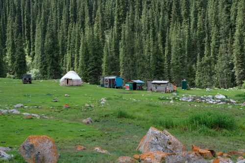 Maandag 1 juli blijven we nog een dagje in het weiland bij Arslanbob staan, samen met Daan & Clarine en de Duitse Udo en Kristien. We besteden de dag aan inlezen van de westkant van Kirgizië. Dat is een deel waar nauwelijks toeristen komen (‘off the beaten track”), met veel natuur, daar hebben we wel zin in. D&C hebben vandaag gewandeld in de walnotenbossen, waar Arslanbob bekend om zijn. ’s Avonds delen we ons eten. Joost heeft niet zo’n trek meer want die werd bij het hout sprokkelen onderschept door een oma, die hem volgestopt heeft met bietensalade en brood. Laat ik dat nou ook gemaakt hebben! Ook hebben we van Kristien ‘geburtstagkuchen’ gekregen. ’s Avonds hebben we een mooi kampvuur en komen Udo en Kristien niet met wijn, maar met prima wodka en Heineken bier aanzetten. Samen met de Iraanse pistanchenoten van Clarine, een waar feest en gezellig.