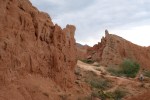 Op zondag 21 juli vertrekken we uit Karakol naar de grens met Kazachstan. Hier zijn we al doorheen geweest op de heenweg maar dan westelijker. Door de groene heuvels rijden we Kirgistan uit. Het weer wordt minder en aan de grens is het maar liefst 13 graden en het regent! Dat is even geleden. De beambtes zijn heel vriendelijk en het is zo gepiept. In Kegen kopen we een sim-kaart bij een meneer die geen Russisch wil praten. In Kazachstan doen ze vreselijk hun best afscheid te nemen van de Russische geschiedenis, maar ook weer niet. Ze proberen zowel Europa, als de VS en Rusland en China te vriend te houden. Het lukt ook om bij een mannetje met een auto-onderdelen-winkel een autoverzekering te kopen, al moeten we wel even wachten tot hij zijn sigaretje op heeft. We rijden richting de Charyn Canyon, een van de bekendste highlights van Kaz. Een soort kleine Grand Canyon, maar dan midden in het lege steppe landschap. Op iOverlander staan een paar mooie wildplekken aan de zuidkant van de canyon, waar Herman enthousiast over vertelde. We besluiten het plekje beneden in de canyon op te zoeken. Het is 20 km van de doorgaande weg en langs een heel steil pad naar beneden. Het is bloedheet, maar wel prachtig. In de canyon is het pad, een rivierbedding, af en toe erg smal. Ook verliezen we een spatlap. Als we aan de rivier komen zijn we alleen! Er staan 3 overdekte picknicktafels en het koele water lonkt om even in te badderen. Wat een mooie stek! ’s Avonds in het donker horen we gepiep om ons heen. Met de zaklantaarn schijnen we in twee paar ogen van iets wat op een marter lijkt. Gezellig. Om 7 uur staan we op en rijden met het vroege licht de canyon door en er weer uit. Grappig hoe de terugweg er altijd anders uit ziet! We rijden boven nog even naar een uitkijkpunt over de Charyn Canyon en rijden dan via de doorgaande weg naar de Moon-canyon. Het is niet zo spectaculair als de naam doet vermoeden, maar wel heel anders dan de Yellow canyon. Voor de lunch rijden we naar de Charyn rivier, daar waar de canyon begint. We kunnen aan het water staan. Helaas ligt er nogal wat afval van de zondagse picknick waarschijnlijk. We nemen een dip in het koele water, eten tonijnsalade en lezen wat. Dan komt er een fietser water halen, het blijkt een Amerikaan. Z’n vrouw komt ook en we kletsen wat. Om 16 uur rijden we naar de Charyn Canyon, de officiële ingang zeg maar. Bij de entree komen we 5 Nederlandse jongens tegen in een gehuurde 4×4. Ze willen kamperen in de canyon, want volgens de Lonley Planet kan dat. Dus niet meer. We wijzen ze de weg naar de plek waar wij gisteren gestaan hebben, dat vinden ze wel cool. De canyon is inderdaad indrukwekkend van bovenaf, maar er zijn nogal wat toeristen en dan is het toch gelijk een andere ervaring dan die wij gisteren hadden. We maken wat foto’s en raken aan de praat met Otto, die vreselijk z’n best doet om spectaculaire foto’s op zijn Landcruiser te maken op de rand van de canyon. Hij reist alleen en vraagt me nog wat navigatie tips, want z’n vrouw (der Sjef, ha, ha waar kennen we die van?) volgt later pas. We rijden terug naar de plek aan de rivier waar de Amerikanen zich inmiddels geïnstalleerd hebben. We staan nu vlak aan de rand en na het eten begint het helaas flink te waaien, onweren en regenen. We doen zelfs even het dak dicht en gaan voorin zitten (1ekeer!). Toch altijd een beetje oppassen in een rivierbedding, dus ’s nachts kijken we af en toe met de zaklamp of het water niet omhoog komt. Is goed gegaan.