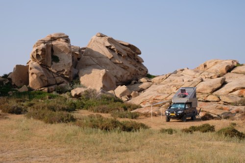 We vinden verderop een verlaten weggetje en gaan daar maar ontbijten. Wat een gedoe. Gelukkig wordt de weg wel beter en kunnen we snelheid maken. Het lukt om 300 km te overbruggen en we stoppen om 15 uur in Bektauata. Een hele bijzondere plek omdat daar midden in de vlakke steppe grote, mooi gevormde granietheuvels zijn ontstaan. Even ontspannen na een inspannende rit (vooral voor Joost dan hè). Wel leuk om klauterend over de rotsen wat foto’s te maken. Het is er ongelofelijk stil en we zien niemand.