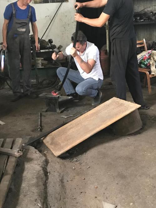 Vrijdag pakken we alles in en gaan met de taxi naar Toyota. Opgelucht dat de auto klaar is! We betalen en nemen afscheid. Bij het hotel bouwt Joost alles weer terug rondom de kachel, en we ruimen de auto in. Flink boodschappen doen en off we go! Ik heb al diverse pogingen gedaan om een plek te vinden waar we propaan kunnen scoren, maar alleen LPG kunnen we vinden. Ineens ziet Joost zijn scherpe oog een banner met propaanflessen er op en in de schuur staat een tankwagen geparkeerd. Dat zoeken we! Ik bel het nummer en even later arriveert een jonge man die geroutineerd onze fles pakt en ‘m begint te vullen. Hopsa. Ook gelukt. Even later worden we aangehouden omdat we geen licht aan hebben. Moest dat dan in Kirgizië?? Was ons nog niet opgevallen. Gelukkig kletst Joost ons er uit. In de bergen worden we nog een keer aangehouden. Dit blijkt een notoir stuk te zijn waar je maar 60 mag. De agent wil 1000 som (13 Euro). Als ik zeg dat we een bonnetje willen wordt het ineens 500. Voor een echte bon heeft hij onze papieren nodig. Daar hebben we geen trek in, dus we betalen maar. Hij zegt nog tegen Joost: “OK?”, Joost: “Not OK messing with tourists!”. We willen een mooie offroad route rijden door de bergen vlak onder Kochkor. Als we een stukje de vallei inrijden zien we een mooi plekje aan de rivier. ’s Middags had ik al wat vette spatjes gezien op de bumper en het opstapje, maar ik wil nu even geen garage meer, dus negeerde dat. Omdat ik zoiets al eens met mijn Mini heb meegemaakt, voel ik toch even met mijn vingers onder de stootbalk. Ja hoor, olie. Sodeju!!! Joost springt in de overall en onder de auto. Inderdaad, differentieel, reservewiel en uitlaat onder de olie. Niet goed. We zijn 250km van Bishkek maar besluiten direct terug te gaan. In Kochkor hebben we bereik en bellen Mirlan. Hij belooft ons op te wachten om 22.30 uur zodat we op het terrein kunnen overnachten. De rit is inspannend, grotendeels in het donker. We komen veilig bij Toyota aan en direct duiken er twee monteurs onder de auto. Nu even niet! We installeren ons op het terrein en nemen een biertje. Het is nog 30 graden, dus slapen gaat niet erg fantastisch. De volgende morgen komt de Master monteur direct op ons af, we krijgen een roombroodje. Het is “normalna” want de vloeibare pakking was waarschijnlijk niet goed uitgehard. Ach, ik zal jullie de rest besparen, maar we hebben nog de hele dag bij Toyota gezeten. Ze balen er behoorlijk van dus controleren nu alles extra goed. Joost communiceert er lustig op los met de monteurs via een vertaal-app, erg grappig. ’s Middags komt Peter nog weer langs. Ook hij moet wachten op onderdelen en slaapt in het hotel waar wij eerder zaten. Dat reserveer ik ook maar weer zodat we gezellig samen kunnen optrekken. Het duurt dus nog tot 19.30 uur voordat echt alles gecontroleerd is na een korte proefrit en inspectie op de brug. De Master mechanic is tevreden en dus wij ook. Snel naar het hotel, douchen en naar Navat met Peter.