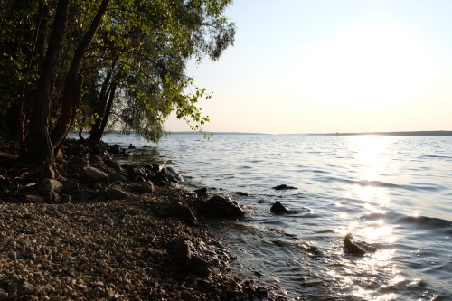 Bij het zien van het meer hebben we zin om te zwemmen, dus we rijden direct naar een yurt-camp aan het water waar je kunt kamperen. Het water is grandioos helder en lekker koel. Even later komt ook de Zwitserse familie op de fiets aan. ’s Avonds koelt het lekker af.