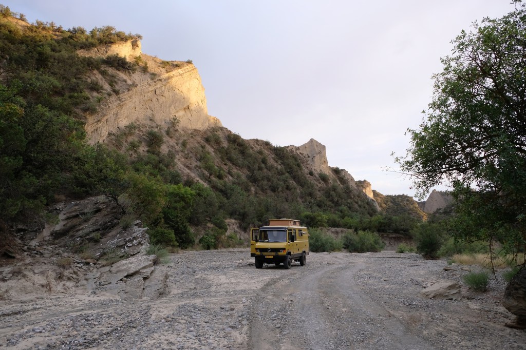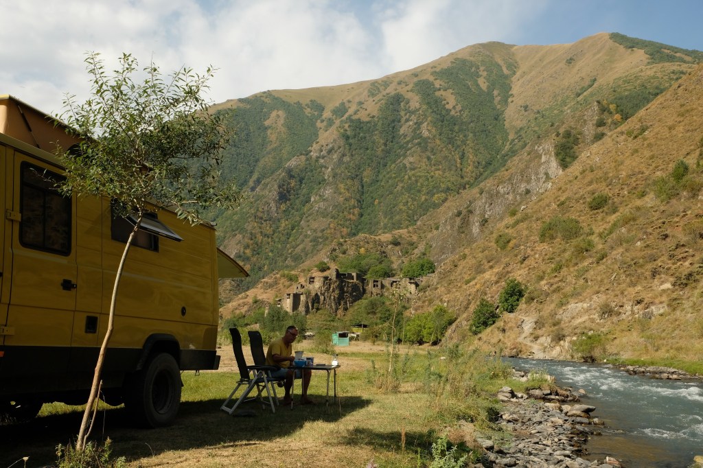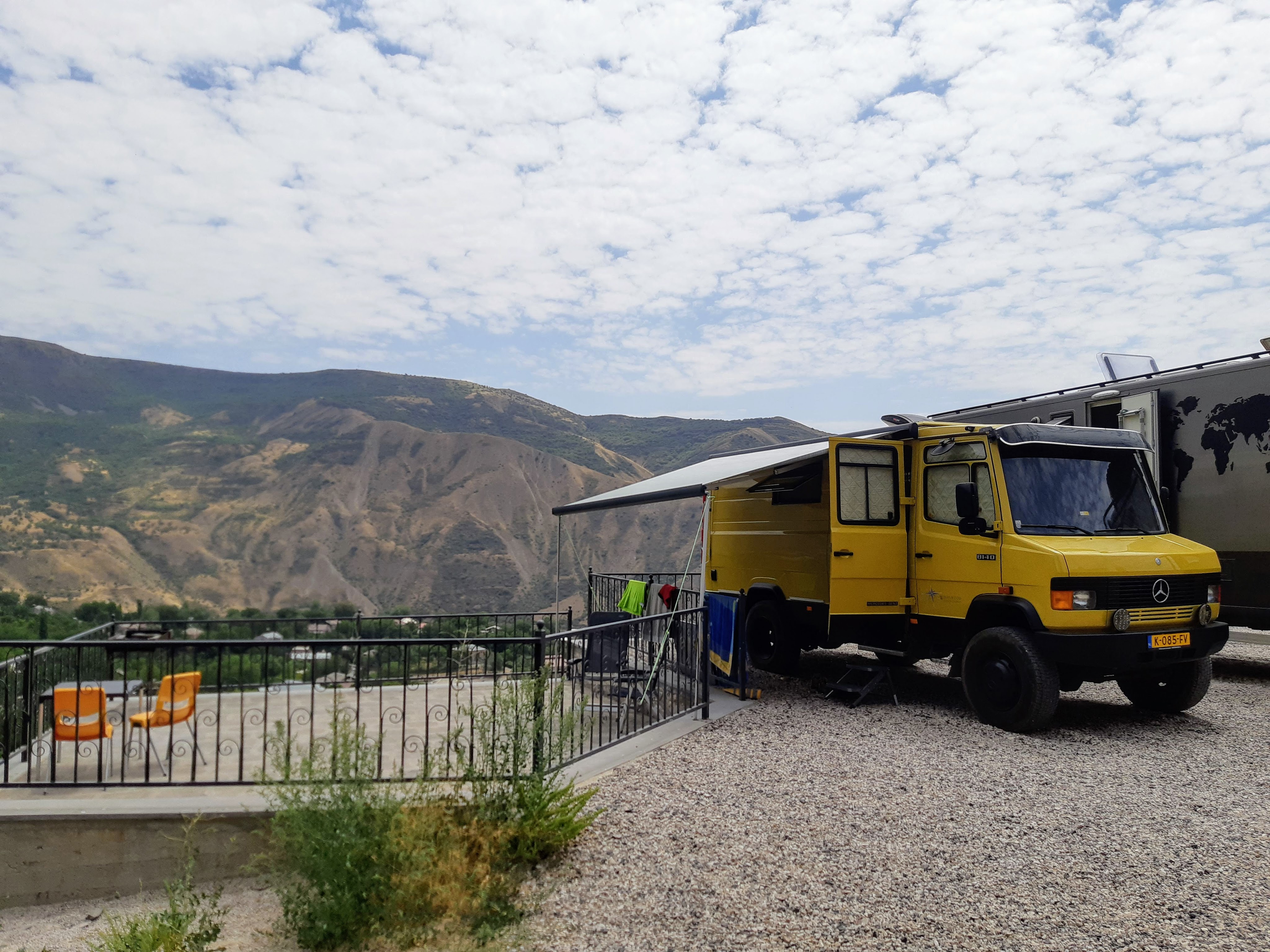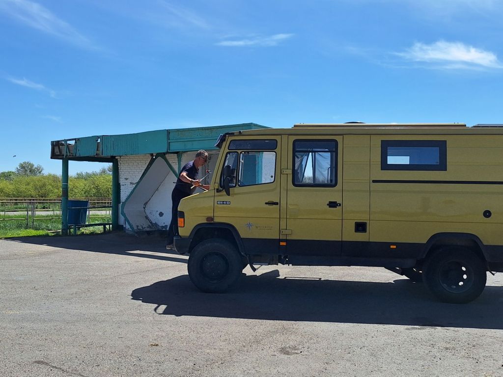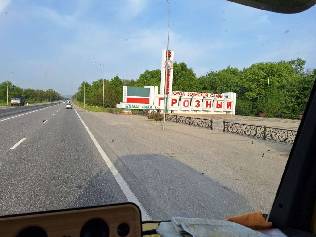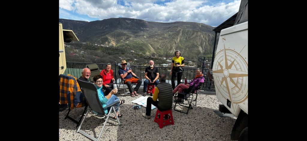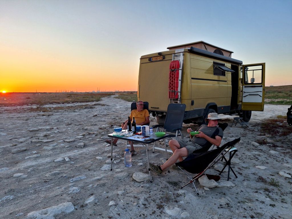 We zijn vlak bij de Russische grens, al maakt een enorme verkeersopstopping bij het verlaten van Atyrau dat het nog wat langer duurt eer we er zijn. Kazachen zijn vriendelijke mensen, tot ze in een auto stappen! Onderweg vinden we nog een mooie douche bij een tankstation en om 15.30 uur staan we aan de grens. En ongelofelijk, we zijn in 65 minuten klaar! We complimenteren de Russische beambten met hun efficiëntie, dat hebben we wel anders meegemaakt. Onze telefoon (e-sim) werkt helaas niet, waar die het op de heenweg nog wel deed in dit gebied. De GPS doet het gelukkig nog. Bij Krasny Jar gaan we weer met de veerpont over de Buzan rivier. De man vraagt nu maar liefst 10 Euro voor een paar minuten varen. Aan de overkant vinden we tussen de bomen een plekje om te overnachten. Het is zowaar warm. De volgende dag willen we een flink eind rijden om zo Astrahan voorbij te komen. Zoals ik al had verwacht gaat de GPS vlak voor de stad heel raar doen. In Google zie je dan ineens dat je op een hele andere plek bent en niet op de weg. Dit doen de Russen uiteraard om eventuele vijandige drones om de tuin te leiden. Het Nederlandse reisadvies voor dit gebied is dan ook rood. Gelukkig had ik het voorbereid en kan ik met een offline kaart langs een goed te volgen rondweg door de stad navigeren. Toch wel spannend. Ook als we de stad gepasseerd zijn blijft de GPS nog lange tijd van slag. We passeren checkpoints als we de autonome republieken Kalmukkië en Dagestan inrijden. Rusland kent 21 autonome republieken en die hebben zo hun eigen zelfbestuur, waaronder vaak een eigen grondwet, regering en parlement. Als je dus zo’n grens overgaat, wordt je gecontroleerd. Bij Sulevkent parkeren we op een stukje oude weg, de andere plekjes ijn veel te nat en modderig. Politieagenten zwaaien vriendelijk en er passeren onverwacht veel auto’s. Niemand valt ons lastig, hoewel……als het donker is horen we twee auto’s aankomen en mannen discussiëren. Dan wordt er op de deur geklopt. De rest kijkt toe, terwijl een van de mannen in het Russisch met me begint te praten. Dat versta ik natuurlijk niet, dus ik draai m’n standaardpraatje af: sorry, ik spreek weinig Russisch, we zijn toeristen uit Nederland op bezoek in Dagestan. Binnen no-time verexcuseren ze zich, z’n vriend legt een hand op z’n hart en ze vertrekken. Die dachten waarschijnlijk, wat doet die gele vrachtwagen hier? toch even checken. Verschillende overlanders zijn naar Sulak Canyon geweest en dat willen wij ook wel zien. Het is heerlijk weer en we zien verschillende kraampjes met druiven onderweg. Joost koopt een flinke zak bij een jonge dame, lekker. We starten het rondje bij het Chirkey Stuwmeer. Mooi uitzicht met de besneeuwde toppen van de Kaukasus op de achtergrond. We rijden door naar Dubki waar we naar een uitzichtpunt wandelen. Het is zowaar een toeristische hotspot met veel nationale toeristen. Het uitzicht over de canyon is prachtig en we zien diverse speedboten rondvaarten maken in de diepte. We belsuiten door te rijden naar een visrestaurant waar je ook kunt overnachten. Op de weg er naar toe lijkt er een omleiding te zijn en worden we tegengehouden door wat mannen. Geen idee waarom, maar het is niet zo prettig. We negeren ze en draaien om. Het is zowaar 25 graden en we nemen plaats op het prachtige terras van het restaurant. Buiten zijn een aantal visbassins dus de vis zal wel vers zijn! We eten inderdaad heerlijk. Na wat overleg mogen we inderdaad op het terrein staan. Joost loopt nog even naar de drukke, kermisachtige boulevard aan de rivier. Gelukkig hebben we daar ’s nachts geen last van.