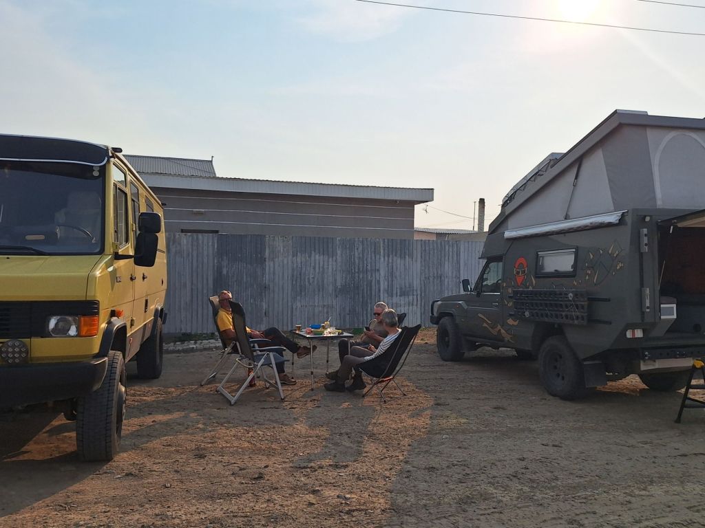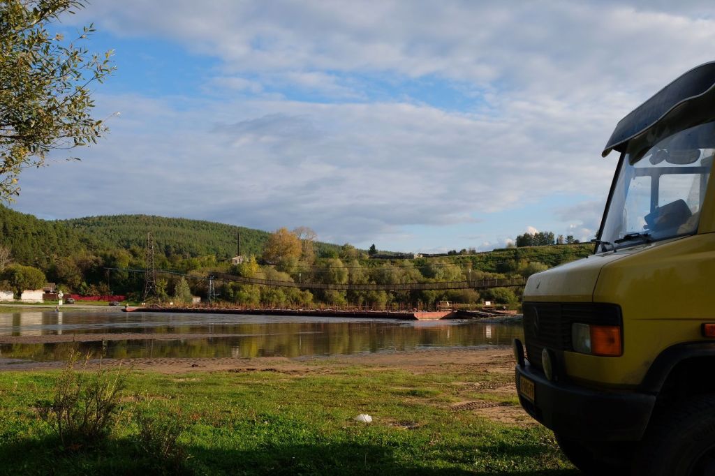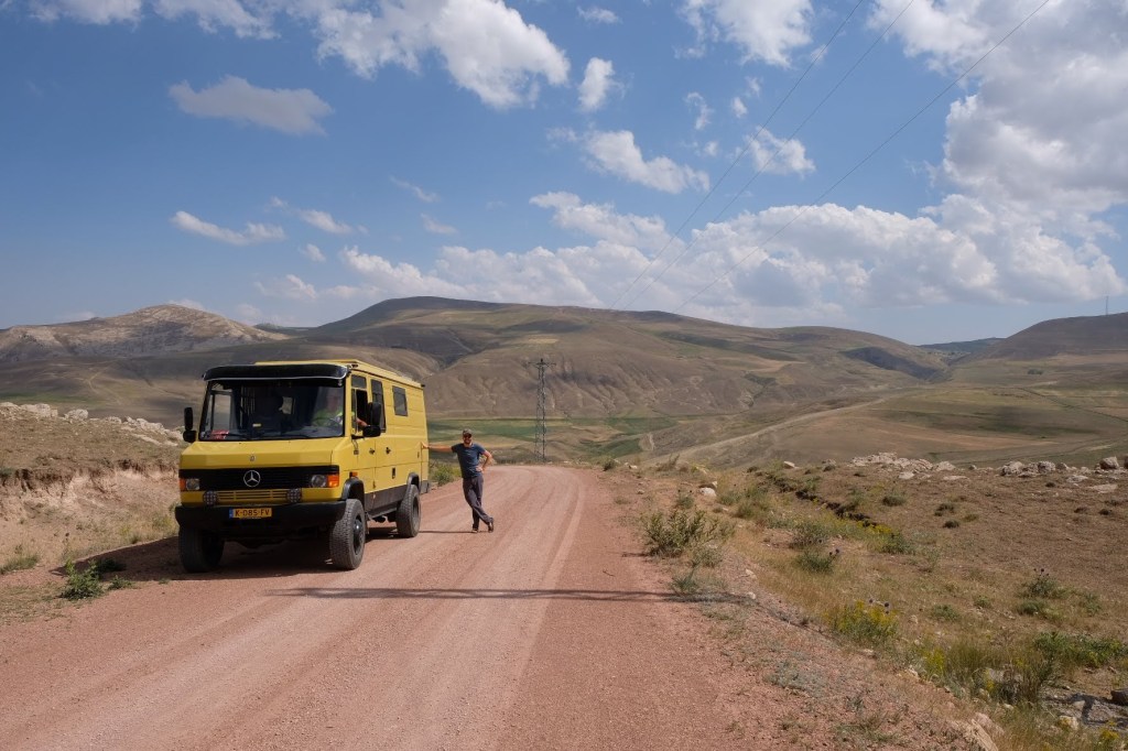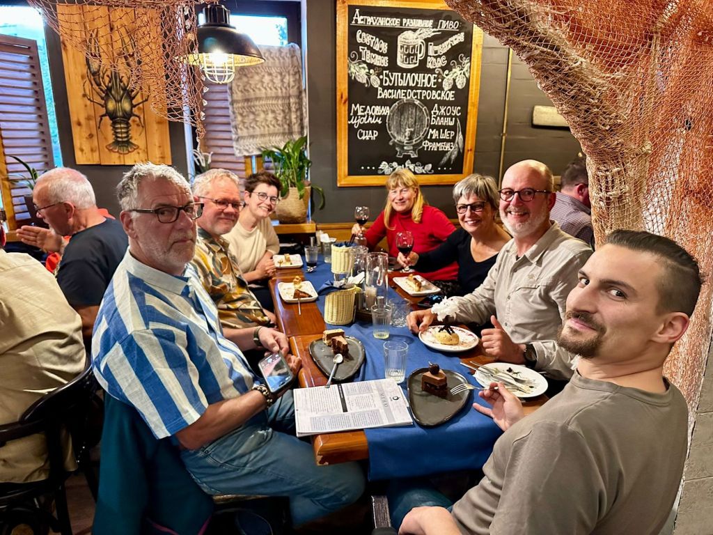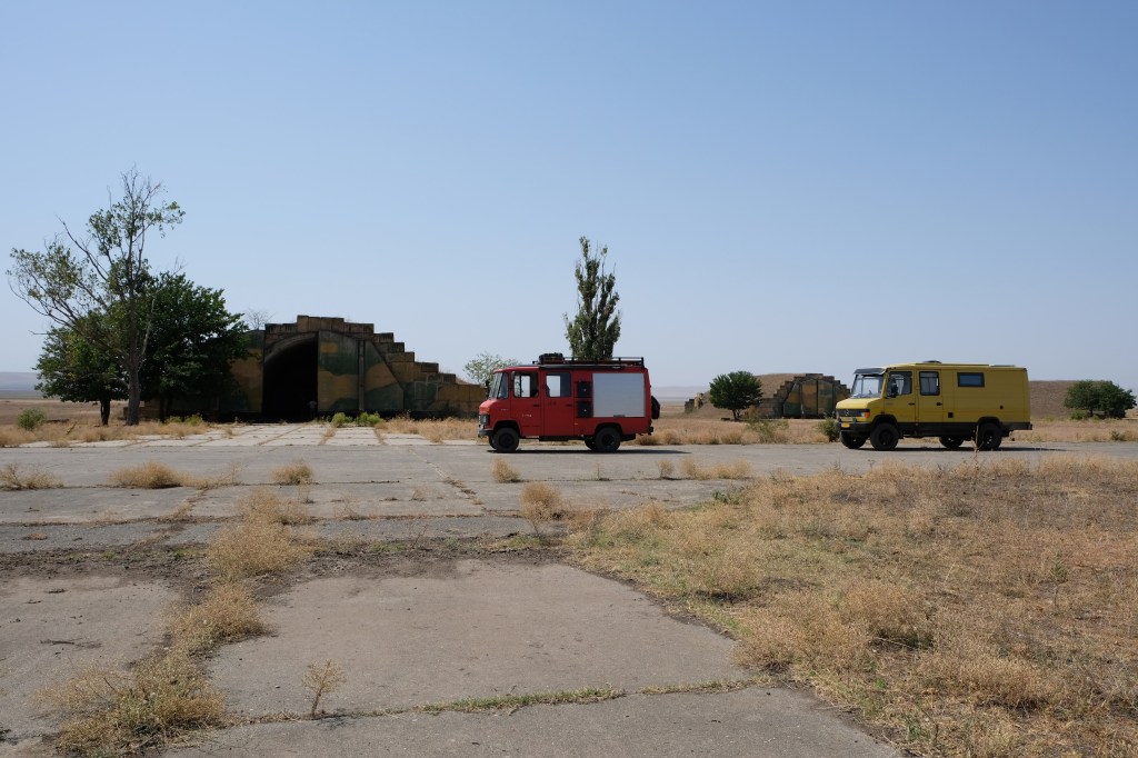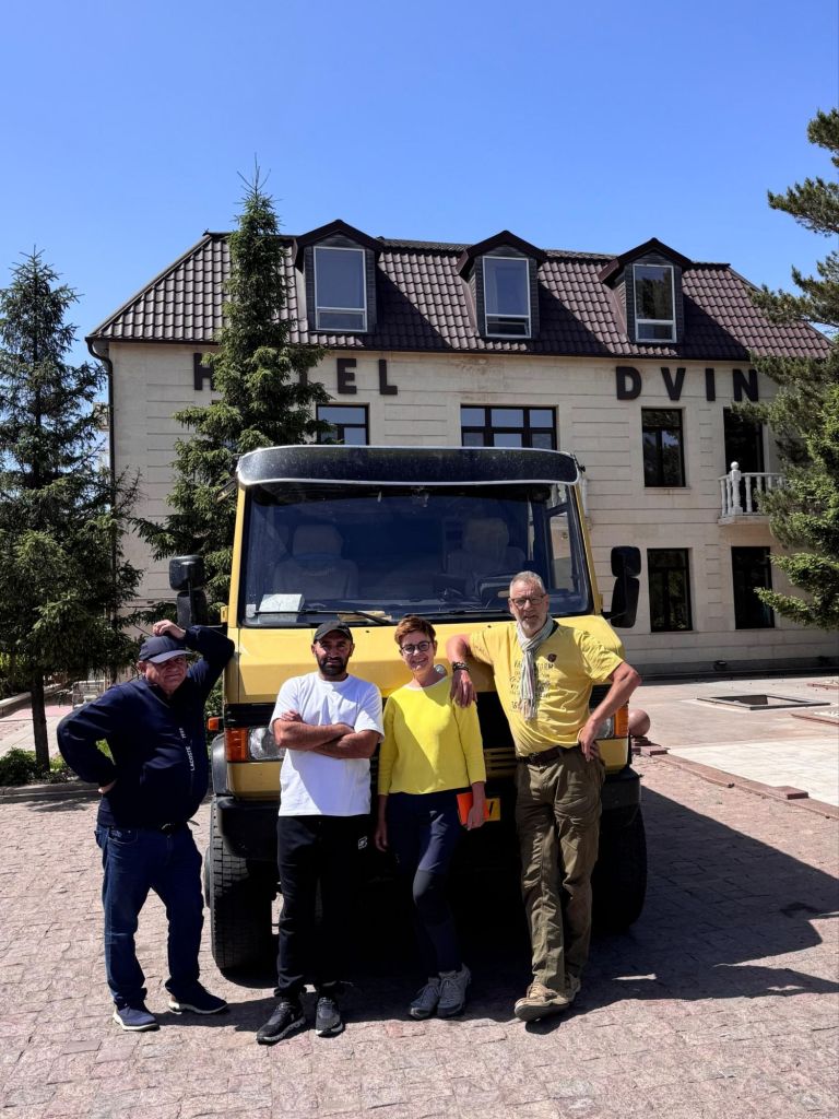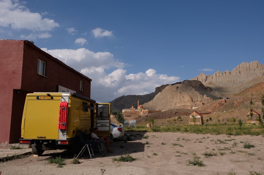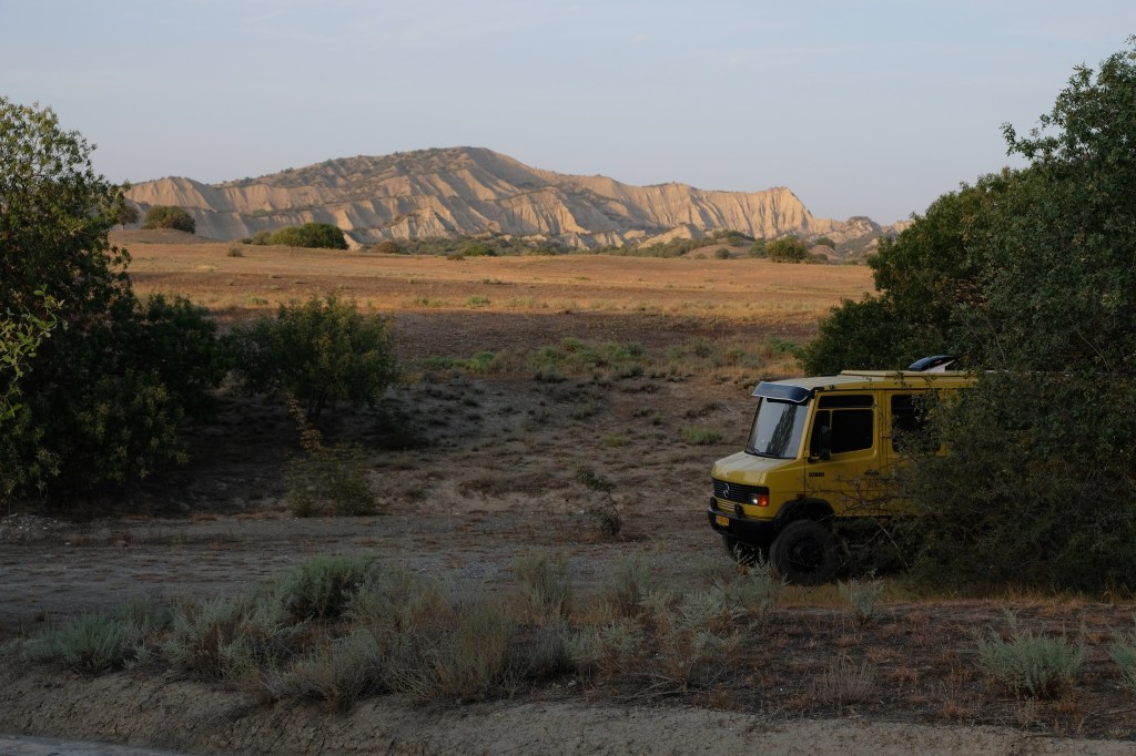 We zijn vlak bij de Russische grens, al maakt een enorme verkeersopstopping bij het verlaten van Atyrau dat het nog wat langer duurt eer we er zijn. Kazachen zijn vriendelijke mensen, tot ze in een auto stappen! Onderweg vinden we nog een mooie douche bij een tankstation en om 15.30 uur staan we aan de grens. En ongelofelijk, we zijn in 65 minuten klaar! We complimenteren de Russische beambten met hun efficiëntie, dat hebben we wel anders meegemaakt. Onze telefoon (e-sim) werkt helaas niet, waar die het op de heenweg nog wel deed in dit gebied. De GPS doet het gelukkig nog. Bij Krasny Jar gaan we weer met de veerpont over de Buzan rivier. De man vraagt nu maar liefst 10 Euro voor een paar minuten varen. Aan de overkant vinden we tussen de bomen een plekje om te overnachten. Het is zowaar warm. De volgende dag willen we een flink eind rijden om zo Astrahan voorbij te komen. Zoals ik al had verwacht gaat de GPS vlak voor de stad heel raar doen. In Google zie je dan ineens dat je op een hele andere plek bent en niet op de weg. Dit doen de Russen uiteraard om eventuele vijandige drones om de tuin te leiden. Het Nederlandse reisadvies voor dit gebied is dan ook rood. Gelukkig had ik het voorbereid en kan ik met een offline kaart langs een goed te volgen rondweg door de stad navigeren. Toch wel spannend. Ook als we de stad gepasseerd zijn blijft de GPS nog lange tijd van slag. We passeren checkpoints als we de autonome republieken Kalmukkië en Dagestan inrijden. Rusland kent 21 autonome republieken en die hebben zo hun eigen zelfbestuur, waaronder vaak een eigen grondwet, regering en parlement. Als je dus zo’n grens overgaat, wordt je gecontroleerd. Bij Sulevkent parkeren we op een stukje oude weg, de andere plekjes ijn veel te nat en modderig. Politieagenten zwaaien vriendelijk en er passeren onverwacht veel auto’s. Niemand valt ons lastig, hoewel……als het donker is horen we twee auto’s aankomen en mannen discussiëren. Dan wordt er op de deur geklopt. De rest kijkt toe, terwijl een van de mannen in het Russisch met me begint te praten. Dat versta ik natuurlijk niet, dus ik draai m’n standaardpraatje af: sorry, ik spreek weinig Russisch, we zijn toeristen uit Nederland op bezoek in Dagestan. Binnen no-time verexcuseren ze zich, z’n vriend legt een hand op z’n hart en ze vertrekken. Die dachten waarschijnlijk, wat doet die gele vrachtwagen hier? toch even checken. Verschillende overlanders zijn naar Sulak Canyon geweest en dat willen wij ook wel zien. Het is heerlijk weer en we zien verschillende kraampjes met druiven onderweg. Joost koopt een flinke zak bij een jonge dame, lekker. We starten het rondje bij het Chirkey Stuwmeer. Mooi uitzicht met de besneeuwde toppen van de Kaukasus op de achtergrond. We rijden door naar Dubki waar we naar een uitzichtpunt wandelen. Het is zowaar een toeristische hotspot met veel nationale toeristen. Het uitzicht over de canyon is prachtig en we zien diverse speedboten rondvaarten maken in de diepte. We belsuiten door te rijden naar een visrestaurant waar je ook kunt overnachten. Op de weg er naar toe lijkt er een omleiding te zijn en worden we tegengehouden door wat mannen. Geen idee waarom, maar het is niet zo prettig. We negeren ze en draaien om. Het is zowaar 25 graden en we nemen plaats op het prachtige terras van het restaurant. Buiten zijn een aantal visbassins dus de vis zal wel vers zijn! We eten inderdaad heerlijk. Na wat overleg mogen we inderdaad op het terrein staan. Joost loopt nog even naar de drukke, kermisachtige boulevard aan de rivier. Gelukkig hebben we daar ’s nachts geen last van.