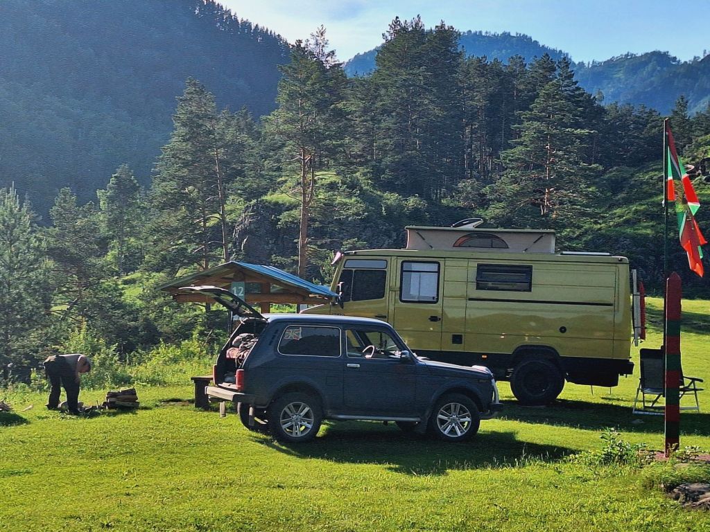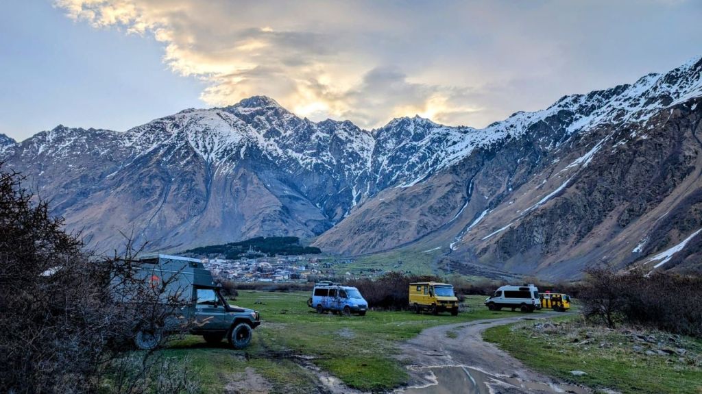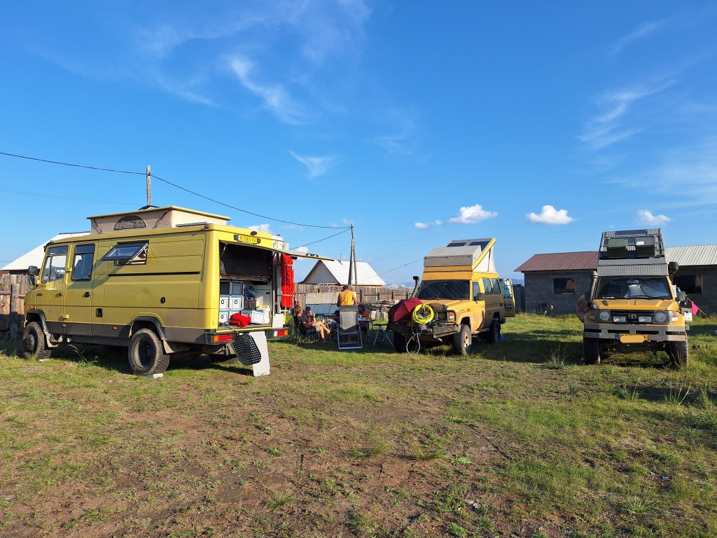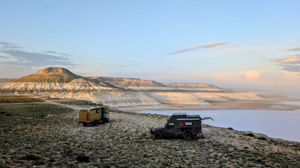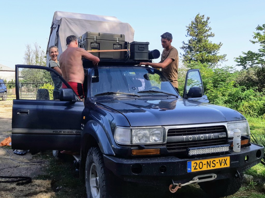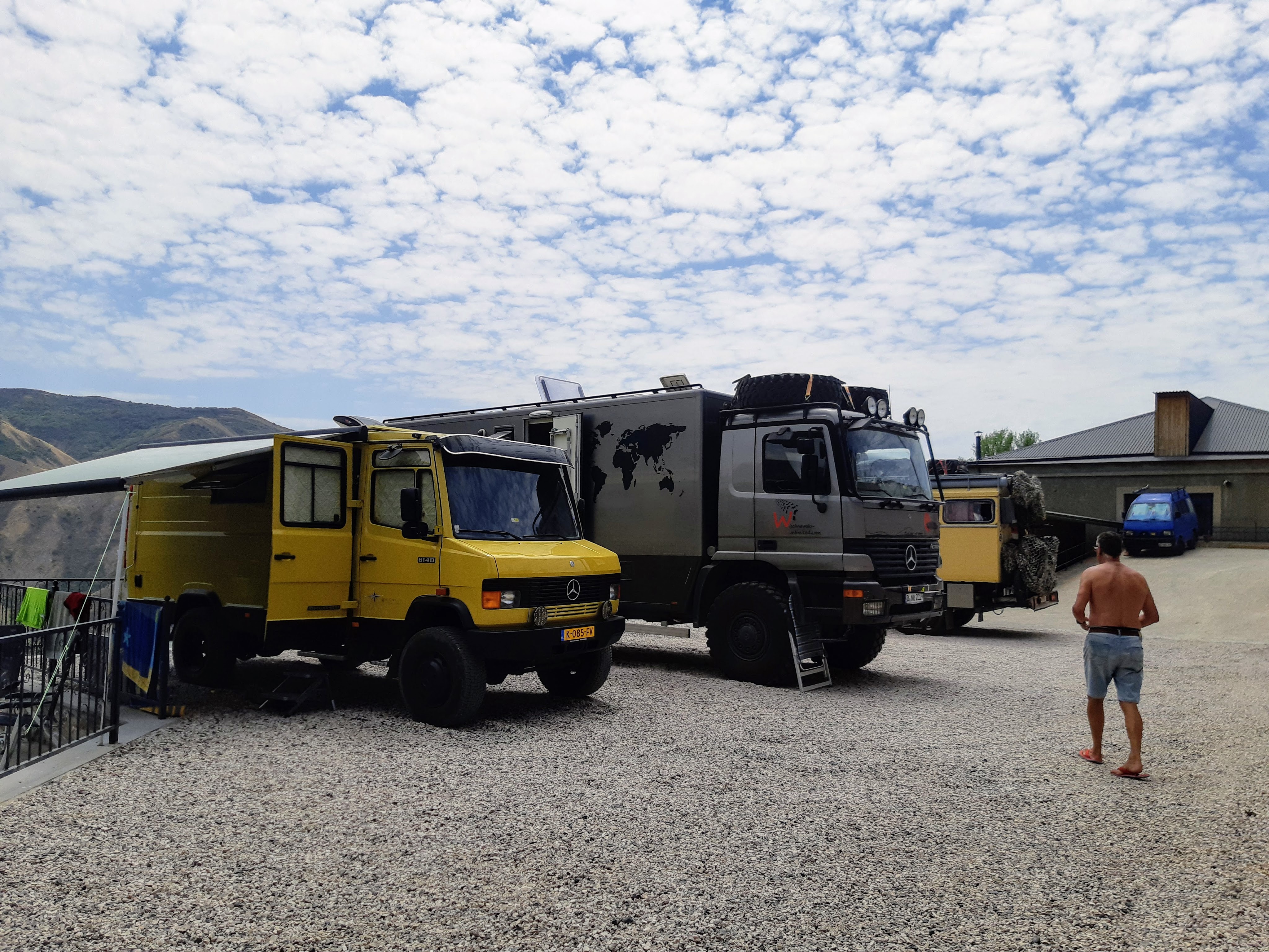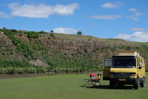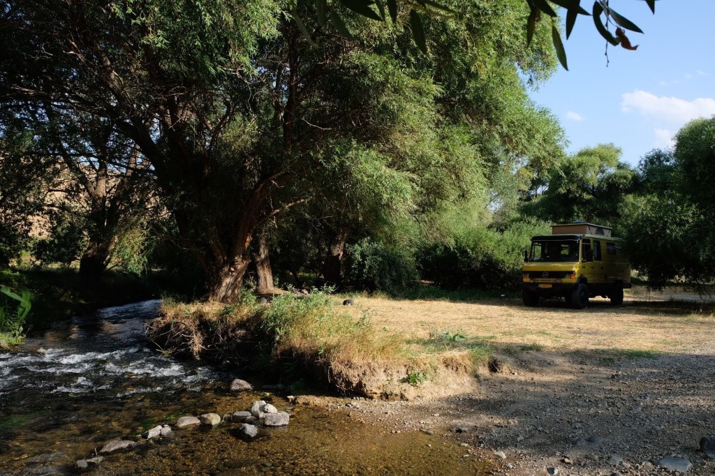We zijn vlak bij de Russische grens, al maakt een enorme verkeersopstopping bij het verlaten van Atyrau dat het nog wat langer duurt eer we er zijn. Kazachen zijn vriendelijke mensen, tot ze in een auto stappen! Onderweg vinden we nog een mooie douche bij een tankstation en om 15.30 uur staan we aan de grens. En ongelofelijk, we zijn in 65 minuten klaar! We complimenteren de Russische beambten met hun efficiëntie, dat hebben we wel anders meegemaakt. Onze telefoon (e-sim) werkt helaas niet, waar die het op de heenweg nog wel deed in dit gebied. De GPS doet het gelukkig nog. Bij Krasny Jar gaan we weer met de veerpont over de Buzan rivier. De man vraagt nu maar liefst 10 Euro voor een paar minuten varen. Aan de overkant vinden we tussen de bomen een plekje om te overnachten. Het is zowaar warm. De volgende dag willen we een flink eind rijden om zo Astrahan voorbij te komen. Zoals ik al had verwacht gaat de GPS vlak voor de stad heel raar doen. In Google zie je dan ineens dat je op een hele andere plek bent en niet op de weg. Dit doen de Russen uiteraard om eventuele vijandige drones om de tuin te leiden. Het Nederlandse reisadvies voor dit gebied is dan ook rood. Gelukkig had ik het voorbereid en kan ik met een offline kaart langs een goed te volgen rondweg door de stad navigeren. Toch wel spannend. Ook als we de stad gepasseerd zijn blijft de GPS nog lange tijd van slag. We passeren checkpoints als we de autonome republieken Kalmukkië en Dagestan inrijden. Rusland kent 21 autonome republieken en die hebben zo hun eigen zelfbestuur, waaronder vaak een eigen grondwet, regering en parlement. Als je dus zo’n grens overgaat, wordt je gecontroleerd. Bij Sulevkent parkeren we op een stukje oude weg, de andere plekjes ijn veel te nat en modderig. Politieagenten zwaaien vriendelijk en er passeren onverwacht veel auto’s. Niemand valt ons lastig, hoewel……als het donker is horen we twee auto’s aankomen en mannen discussiëren. Dan wordt er op de deur geklopt. De rest kijkt toe, terwijl een van de mannen in het Russisch met me begint te praten. Dat versta ik natuurlijk niet, dus ik draai m’n standaardpraatje af: sorry, ik spreek weinig Russisch, we zijn toeristen uit Nederland op bezoek in Dagestan. Binnen no-time verexcuseren ze zich, z’n vriend legt een hand op z’n hart en ze vertrekken. Die dachten waarschijnlijk, wat doet die gele vrachtwagen hier? toch even checken. Verschillende overlanders zijn naar Sulak Canyon geweest en dat willen wij ook wel zien. Het is heerlijk weer en we zien verschillende kraampjes met druiven onderweg. Joost koopt een flinke zak bij een jonge dame, lekker. We starten het rondje bij het Chirkey Stuwmeer. Mooi uitzicht met de besneeuwde toppen van de Kaukasus op de achtergrond. We rijden door naar Dubki waar we naar een uitzichtpunt wandelen. Het is zowaar een toeristische hotspot met veel nationale toeristen. Het uitzicht over de canyon is prachtig en we zien diverse speedboten rondvaarten maken in de diepte. We belsuiten door te rijden naar een visrestaurant waar je ook kunt overnachten. Op de weg er naar toe lijkt er een omleiding te zijn en worden we tegengehouden door wat mannen. Geen idee waarom, maar het is niet zo prettig. We negeren ze en draaien om. Het is zowaar 25 graden en we nemen plaats op het prachtige terras van het restaurant. Buiten zijn een aantal visbassins dus de vis zal wel vers zijn! We eten inderdaad heerlijk. Na wat overleg mogen we inderdaad op het terrein staan. Joost loopt nog even naar de drukke, kermisachtige boulevard aan de rivier. Gelukkig hebben we daar ’s nachts geen last van.