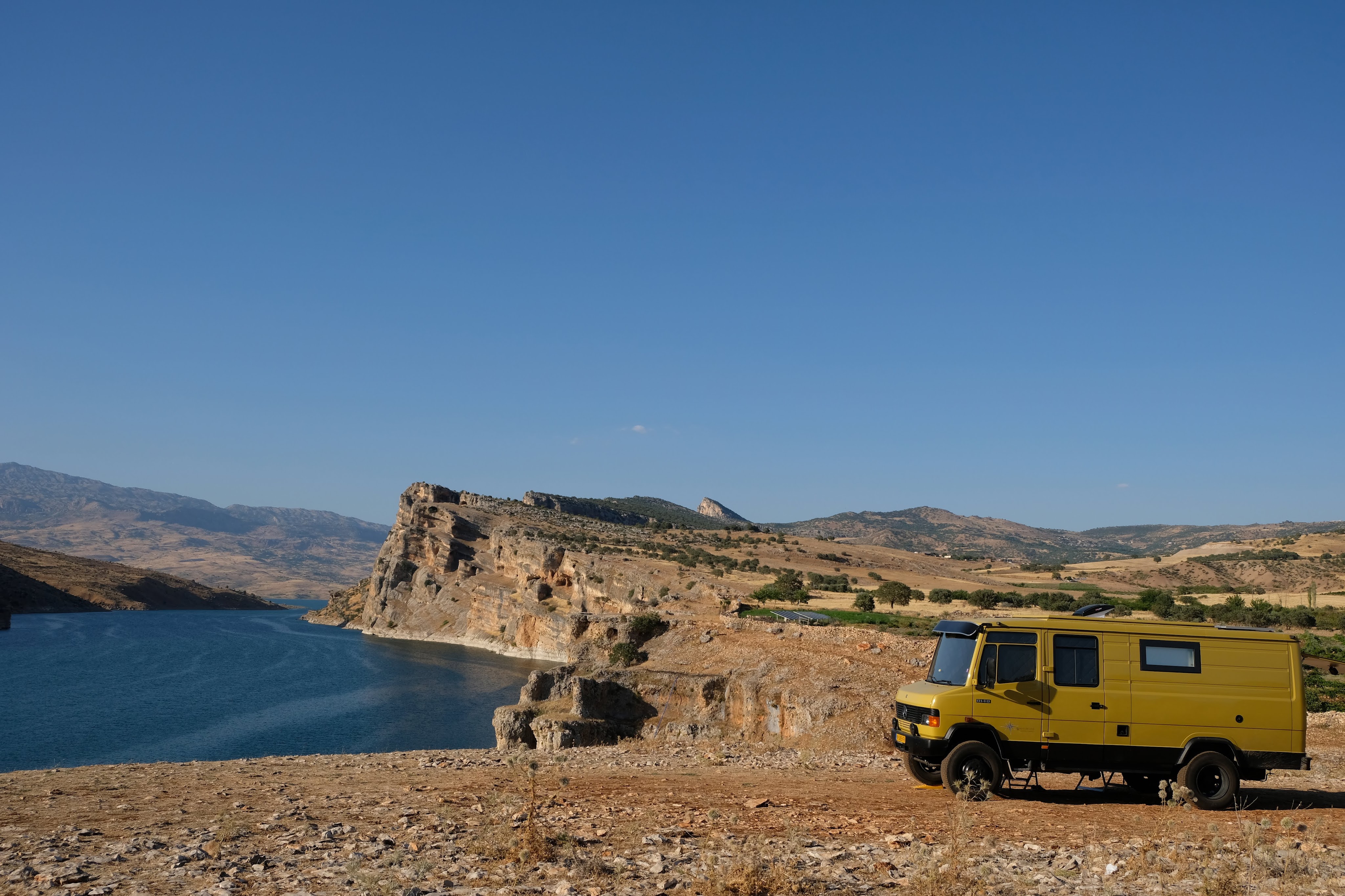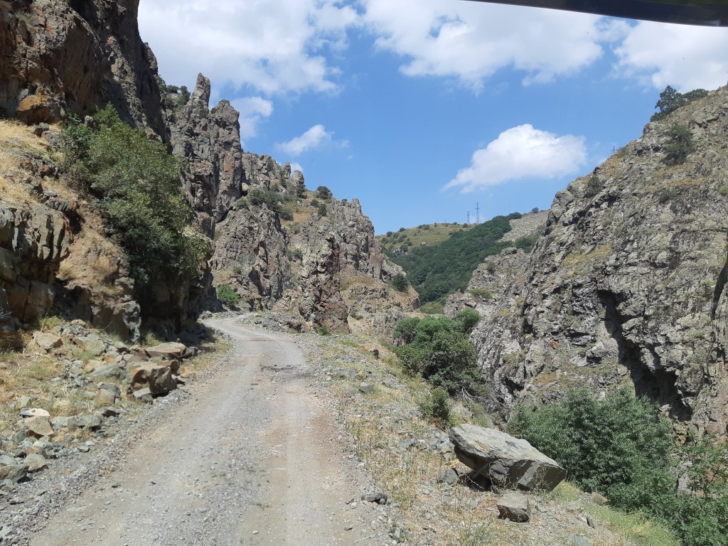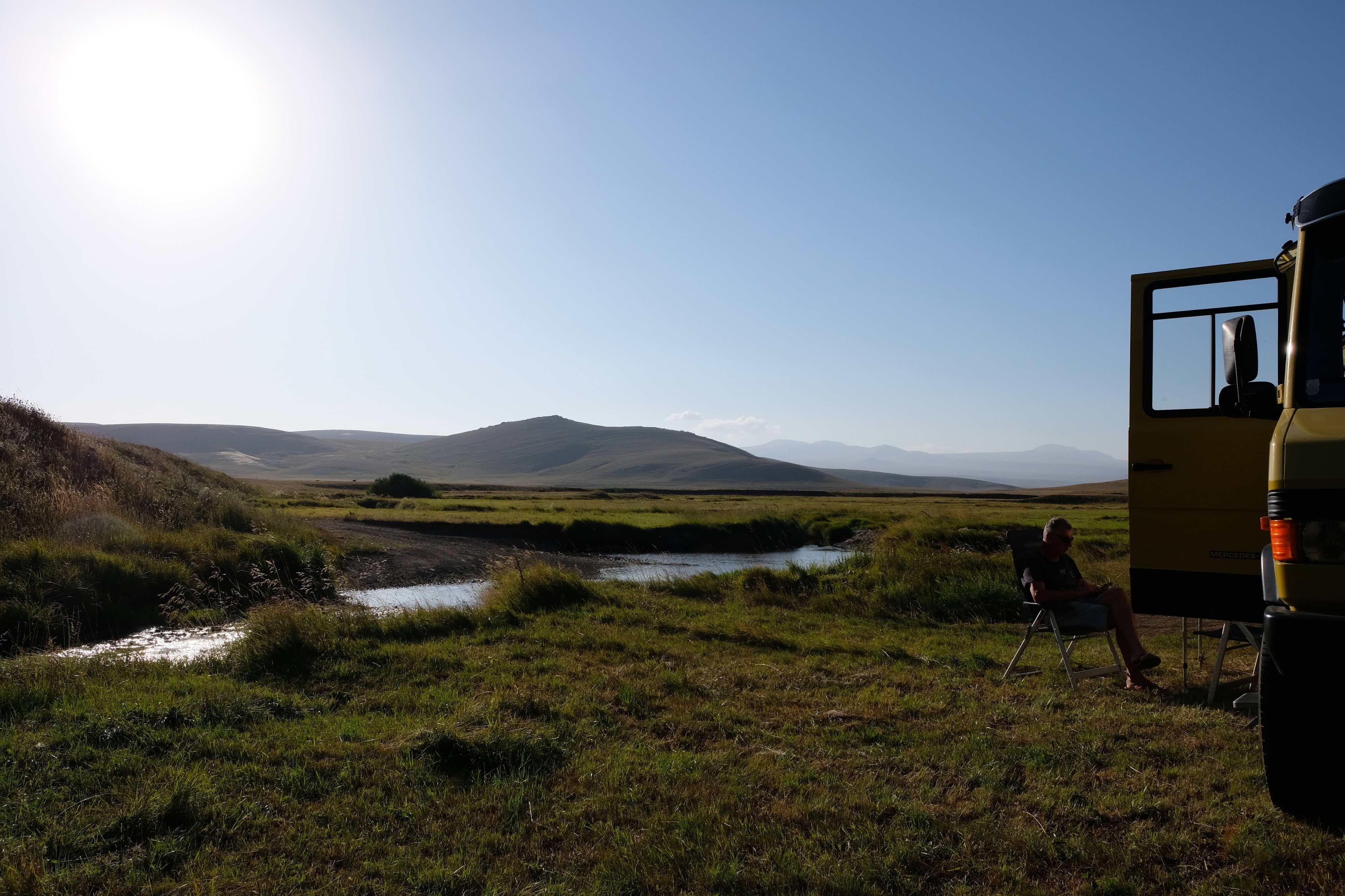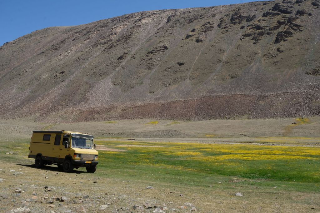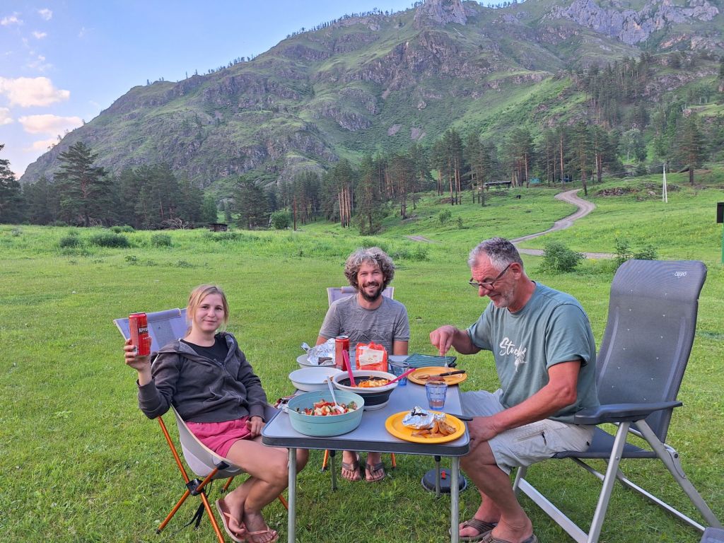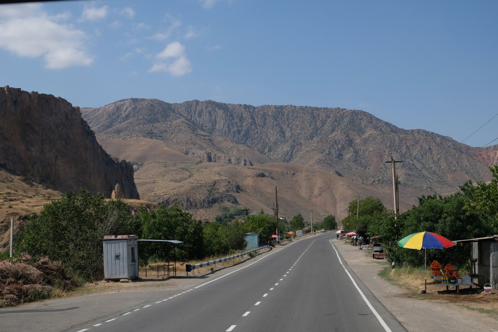 We zijn vlak bij de Russische grens, al maakt een enorme verkeersopstopping bij het verlaten van Atyrau dat het nog wat langer duurt eer we er zijn. Kazachen zijn vriendelijke mensen, tot ze in een auto stappen! Onderweg vinden we nog een mooie douche bij een tankstation en om 15.30 uur staan we aan de grens. En ongelofelijk, we zijn in 65 minuten klaar! We complimenteren de Russische beambten met hun efficiëntie, dat hebben we wel anders meegemaakt. Onze telefoon (e-sim) werkt helaas niet, waar die het op de heenweg nog wel deed in dit gebied. De GPS doet het gelukkig nog. Bij Krasny Jar gaan we weer met de veerpont over de Buzan rivier. De man vraagt nu maar liefst 10 Euro voor een paar minuten varen. Aan de overkant vinden we tussen de bomen een plekje om te overnachten. Het is zowaar warm. De volgende dag willen we een flink eind rijden om zo Astrahan voorbij te komen. Zoals ik al had verwacht gaat de GPS vlak voor de stad heel raar doen. In Google zie je dan ineens dat je op een hele andere plek bent en niet op de weg. Dit doen de Russen uiteraard om eventuele vijandige drones om de tuin te leiden. Het Nederlandse reisadvies voor dit gebied is dan ook rood. Gelukkig had ik het voorbereid en kan ik met een offline kaart langs een goed te volgen rondweg door de stad navigeren. Toch wel spannend. Ook als we de stad gepasseerd zijn blijft de GPS nog lange tijd van slag. We passeren checkpoints als we de autonome republieken Kalmukkië en Dagestan inrijden. Rusland kent 21 autonome republieken en die hebben zo hun eigen zelfbestuur, waaronder vaak een eigen grondwet, regering en parlement. Als je dus zo’n grens overgaat, wordt je gecontroleerd. Bij Sulevkent parkeren we op een stukje oude weg, de andere plekjes ijn veel te nat en modderig. Politieagenten zwaaien vriendelijk en er passeren onverwacht veel auto’s. Niemand valt ons lastig, hoewel……als het donker is horen we twee auto’s aankomen en mannen discussiëren. Dan wordt er op de deur geklopt. De rest kijkt toe, terwijl een van de mannen in het Russisch met me begint te praten. Dat versta ik natuurlijk niet, dus ik draai m’n standaardpraatje af: sorry, ik spreek weinig Russisch, we zijn toeristen uit Nederland op bezoek in Dagestan. Binnen no-time verexcuseren ze zich, z’n vriend legt een hand op z’n hart en ze vertrekken. Die dachten waarschijnlijk, wat doet die gele vrachtwagen hier? toch even checken. Verschillende overlanders zijn naar Sulak Canyon geweest en dat willen wij ook wel zien. Het is heerlijk weer en we zien verschillende kraampjes met druiven onderweg. Joost koopt een flinke zak bij een jonge dame, lekker. We starten het rondje bij het Chirkey Stuwmeer. Mooi uitzicht met de besneeuwde toppen van de Kaukasus op de achtergrond. We rijden door naar Dubki waar we naar een uitzichtpunt wandelen. Het is zowaar een toeristische hotspot met veel nationale toeristen. Het uitzicht over de canyon is prachtig en we zien diverse speedboten rondvaarten maken in de diepte. We belsuiten door te rijden naar een visrestaurant waar je ook kunt overnachten. Op de weg er naar toe lijkt er een omleiding te zijn en worden we tegengehouden door wat mannen. Geen idee waarom, maar het is niet zo prettig. We negeren ze en draaien om. Het is zowaar 25 graden en we nemen plaats op het prachtige terras van het restaurant. Buiten zijn een aantal visbassins dus de vis zal wel vers zijn! We eten inderdaad heerlijk. Na wat overleg mogen we inderdaad op het terrein staan. Joost loopt nog even naar de drukke, kermisachtige boulevard aan de rivier. Gelukkig hebben we daar ’s nachts geen last van.