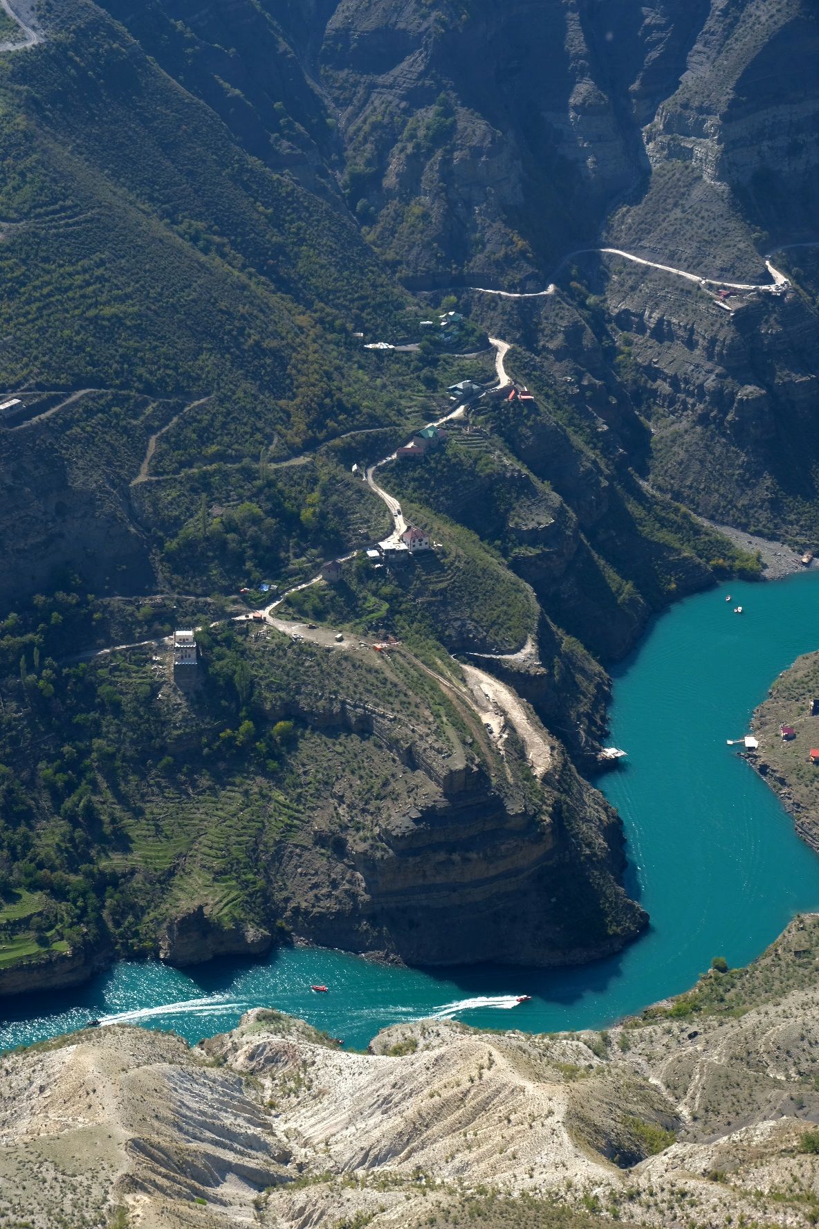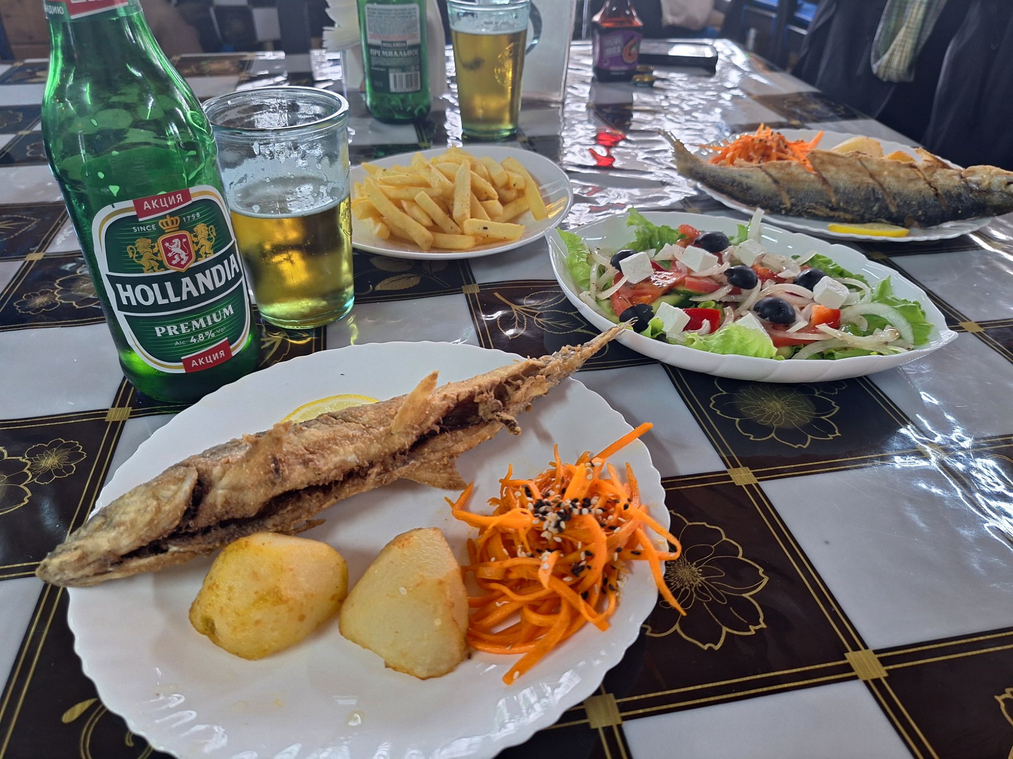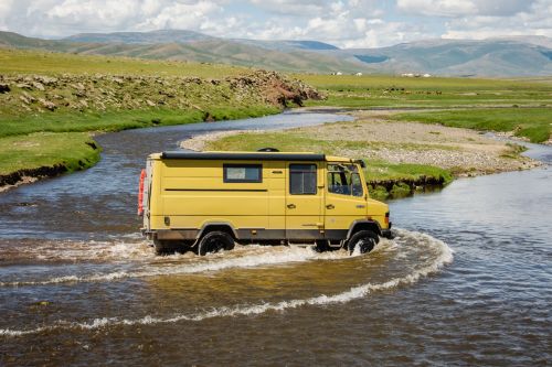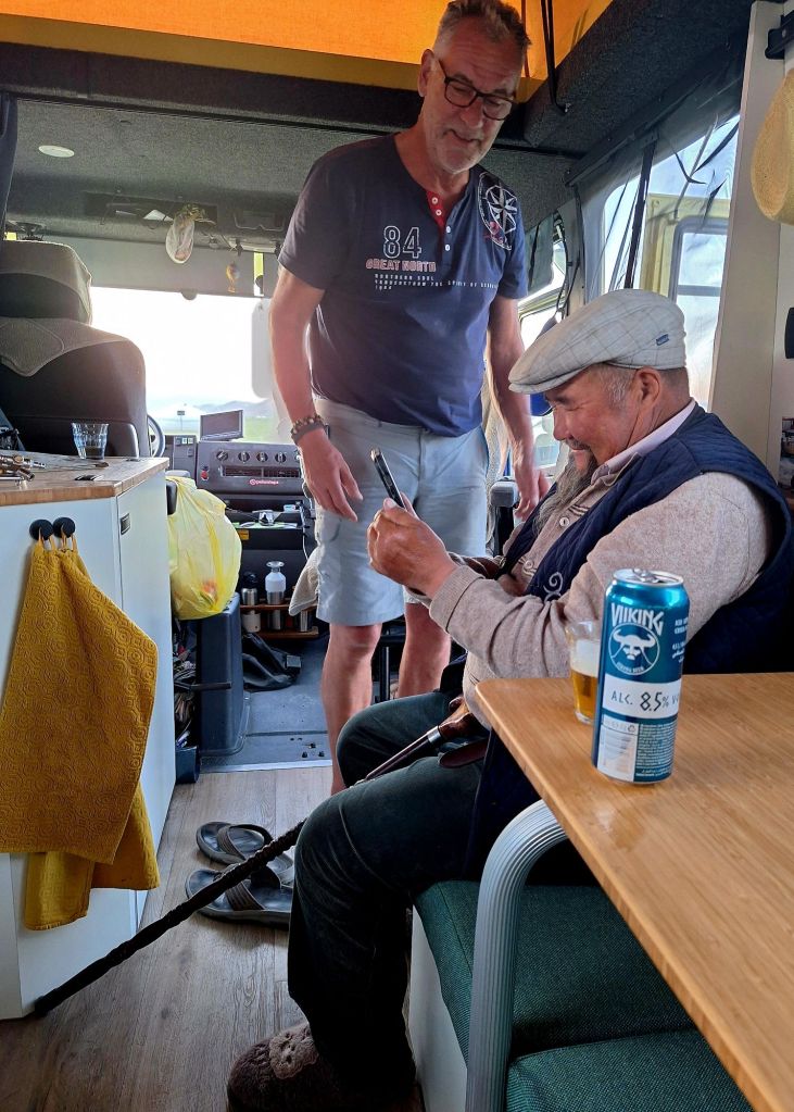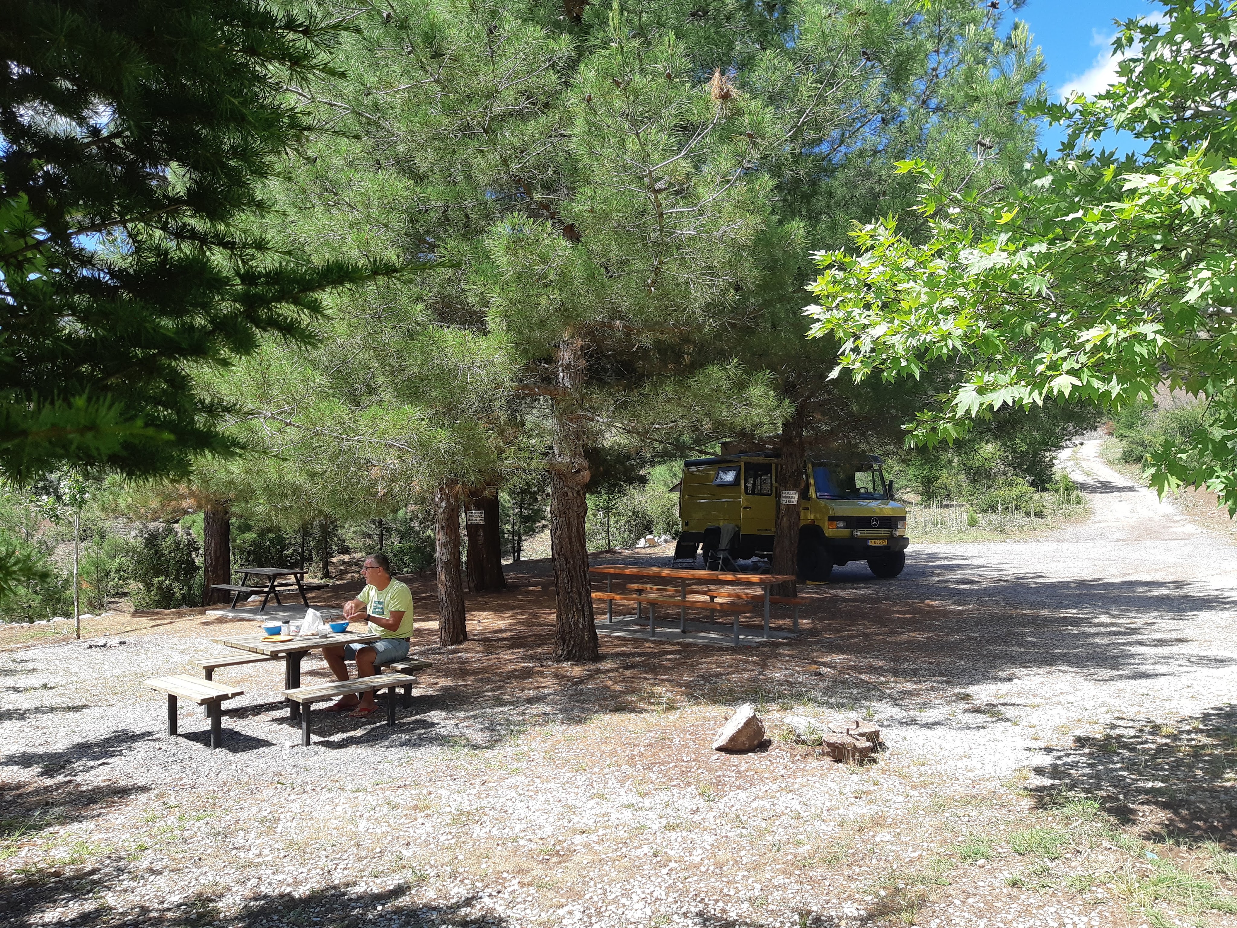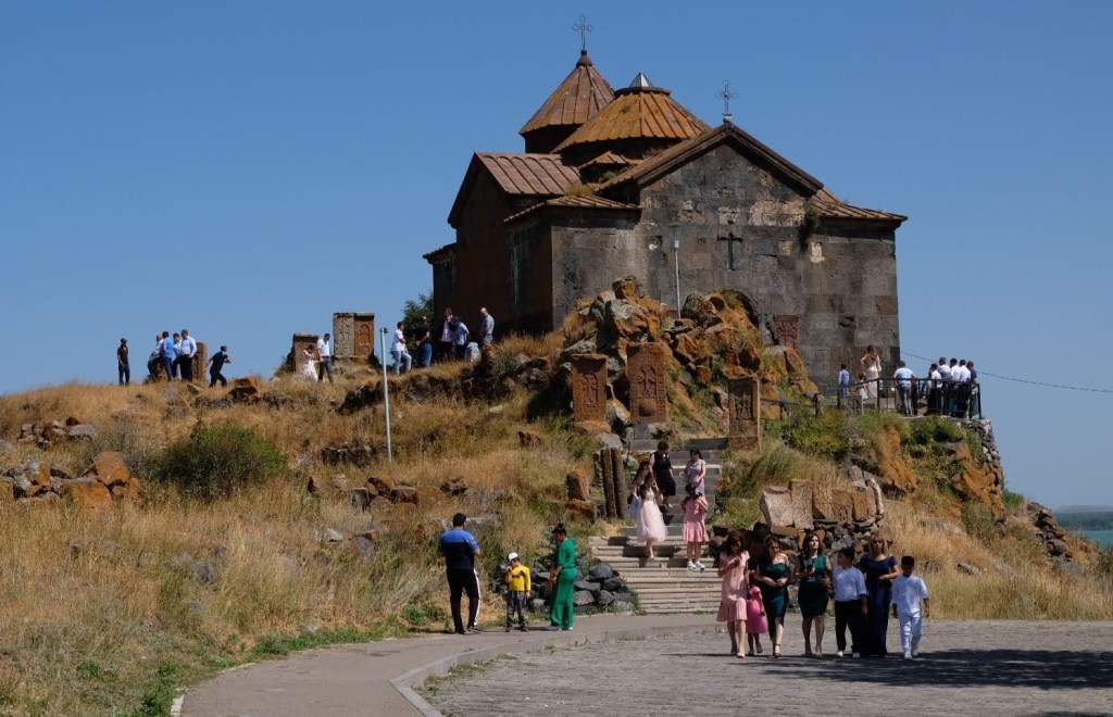 We zijn vlak bij de Russische grens, al maakt een enorme verkeersopstopping bij het verlaten van Atyrau dat het nog wat langer duurt eer we er zijn. Kazachen zijn vriendelijke mensen, tot ze in een auto stappen! Onderweg vinden we nog een mooie douche bij een tankstation en om 15.30 uur staan we aan de grens. En ongelofelijk, we zijn in 65 minuten klaar! We complimenteren de Russische beambten met hun efficiëntie, dat hebben we wel anders meegemaakt. Onze telefoon (e-sim) werkt helaas niet, waar die het op de heenweg nog wel deed in dit gebied. De GPS doet het gelukkig nog. Bij Krasny Jar gaan we weer met de veerpont over de Buzan rivier. De man vraagt nu maar liefst 10 Euro voor een paar minuten varen. Aan de overkant vinden we tussen de bomen een plekje om te overnachten. Het is zowaar warm. De volgende dag willen we een flink eind rijden om zo Astrahan voorbij te komen. Zoals ik al had verwacht gaat de GPS vlak voor de stad heel raar doen. In Google zie je dan ineens dat je op een hele andere plek bent en niet op de weg. Dit doen de Russen uiteraard om eventuele vijandige drones om de tuin te leiden. Het Nederlandse reisadvies voor dit gebied is dan ook rood. Gelukkig had ik het voorbereid en kan ik met een offline kaart langs een goed te volgen rondweg door de stad navigeren. Toch wel spannend. Ook als we de stad gepasseerd zijn blijft de GPS nog lange tijd van slag. We passeren checkpoints als we de autonome republieken Kalmukkië en Dagestan inrijden. Rusland kent 21 autonome republieken en die hebben zo hun eigen zelfbestuur, waaronder vaak een eigen grondwet, regering en parlement. Als je dus zo’n grens overgaat, wordt je gecontroleerd. Bij Sulevkent parkeren we op een stukje oude weg, de andere plekjes ijn veel te nat en modderig. Politieagenten zwaaien vriendelijk en er passeren onverwacht veel auto’s. Niemand valt ons lastig, hoewel……als het donker is horen we twee auto’s aankomen en mannen discussiëren. Dan wordt er op de deur geklopt. De rest kijkt toe, terwijl een van de mannen in het Russisch met me begint te praten. Dat versta ik natuurlijk niet, dus ik draai m’n standaardpraatje af: sorry, ik spreek weinig Russisch, we zijn toeristen uit Nederland op bezoek in Dagestan. Binnen no-time verexcuseren ze zich, z’n vriend legt een hand op z’n hart en ze vertrekken. Die dachten waarschijnlijk, wat doet die gele vrachtwagen hier? toch even checken. Verschillende overlanders zijn naar Sulak Canyon geweest en dat willen wij ook wel zien. Het is heerlijk weer en we zien verschillende kraampjes met druiven onderweg. Joost koopt een flinke zak bij een jonge dame, lekker. We starten het rondje bij het Chirkey Stuwmeer. Mooi uitzicht met de besneeuwde toppen van de Kaukasus op de achtergrond. We rijden door naar Dubki waar we naar een uitzichtpunt wandelen. Het is zowaar een toeristische hotspot met veel nationale toeristen. Het uitzicht over de canyon is prachtig en we zien diverse speedboten rondvaarten maken in de diepte. We belsuiten door te rijden naar een visrestaurant waar je ook kunt overnachten. Op de weg er naar toe lijkt er een omleiding te zijn en worden we tegengehouden door wat mannen. Geen idee waarom, maar het is niet zo prettig. We negeren ze en draaien om. Het is zowaar 25 graden en we nemen plaats op het prachtige terras van het restaurant. Buiten zijn een aantal visbassins dus de vis zal wel vers zijn! We eten inderdaad heerlijk. Na wat overleg mogen we inderdaad op het terrein staan. Joost loopt nog even naar de drukke, kermisachtige boulevard aan de rivier. Gelukkig hebben we daar ’s nachts geen last van.