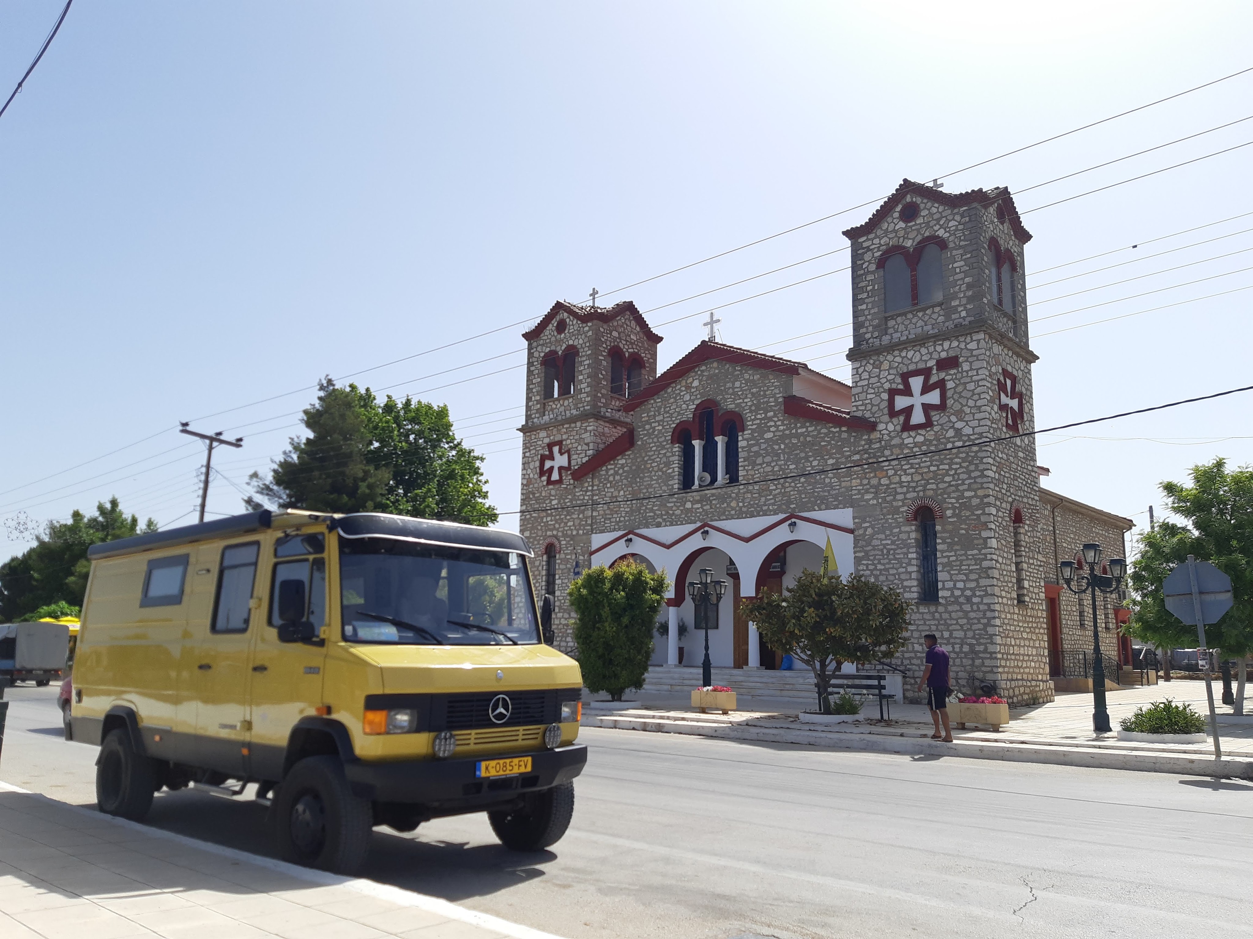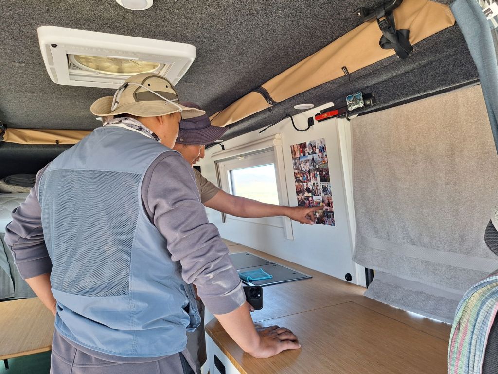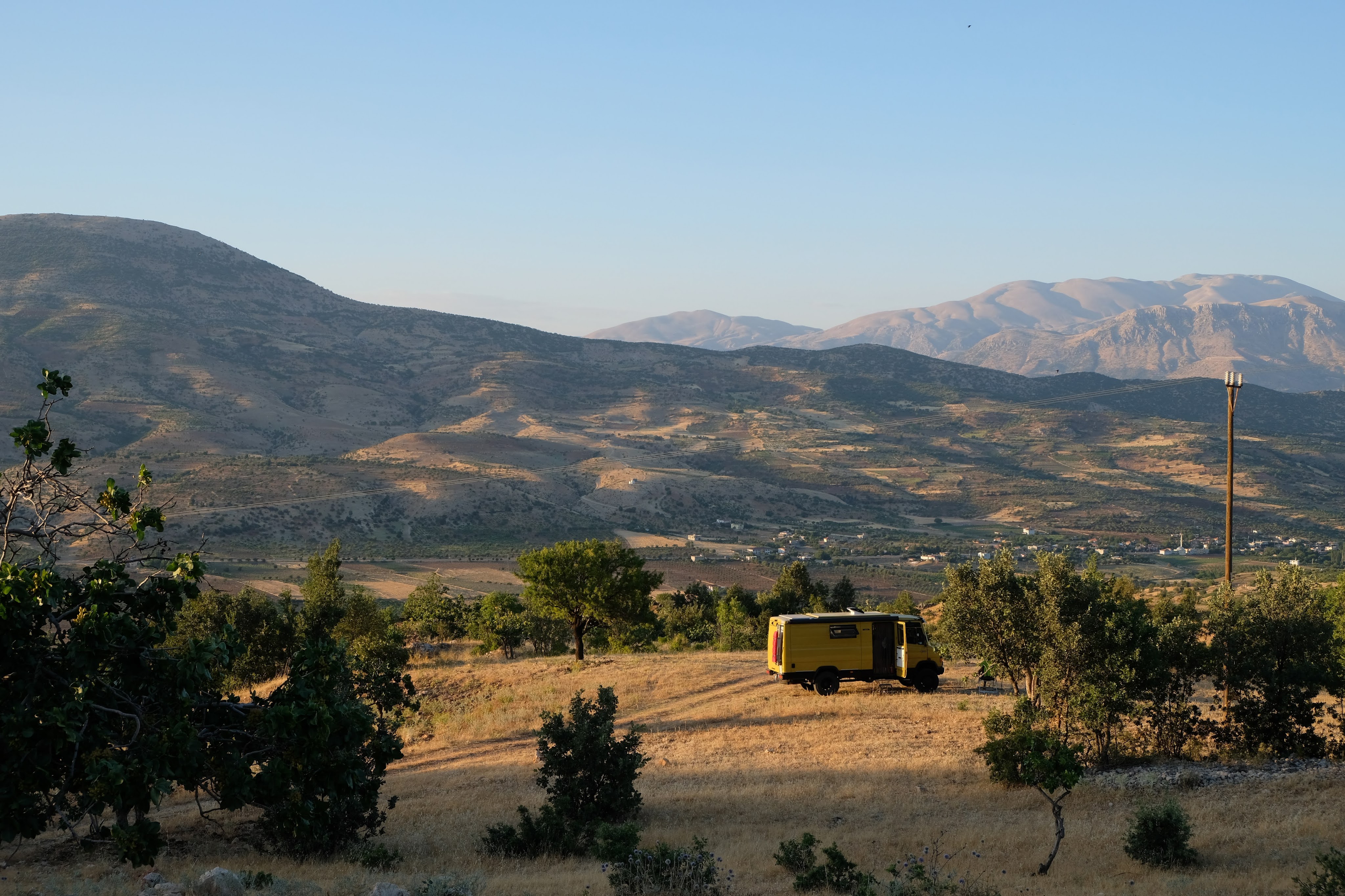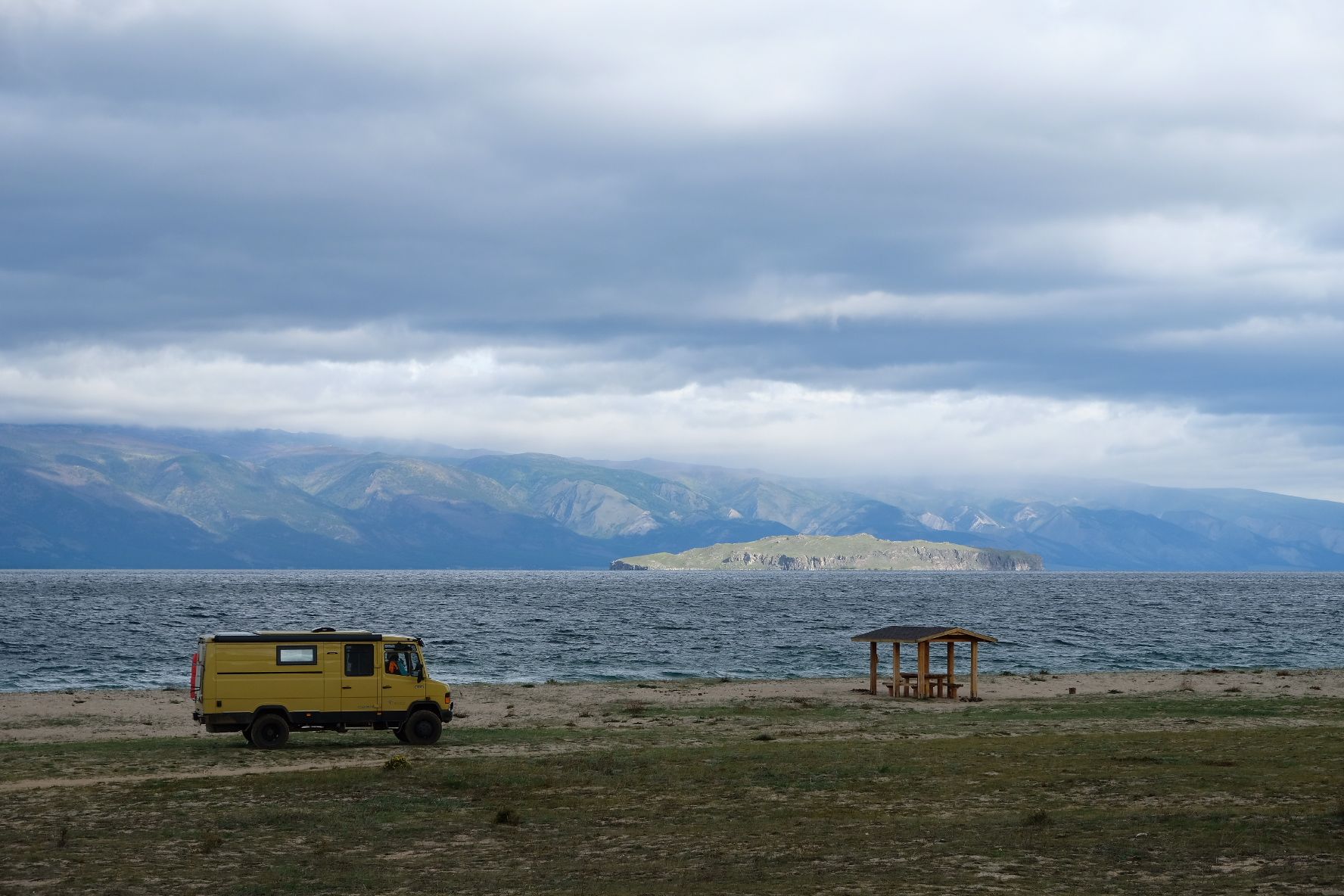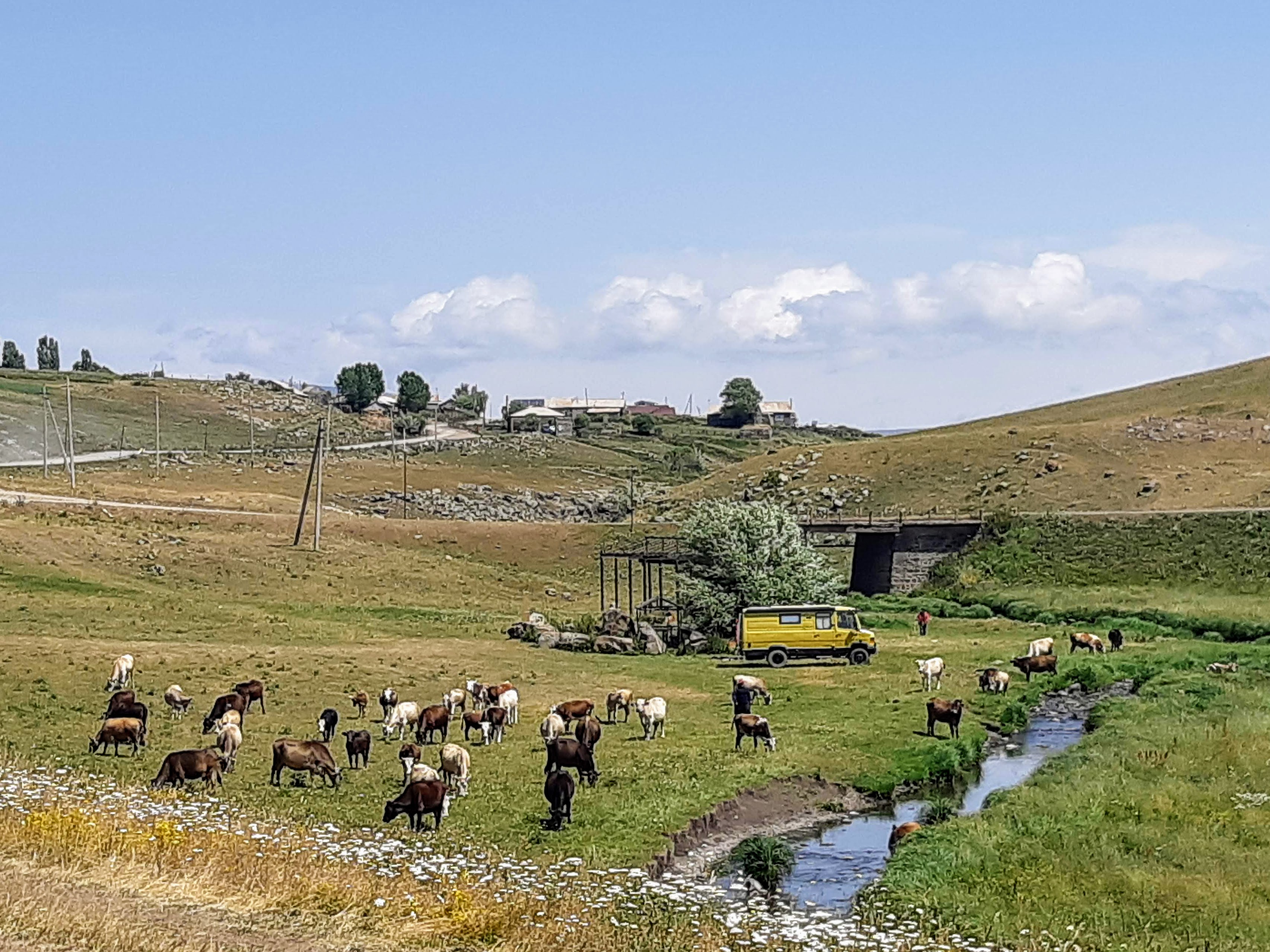 We zijn vlak bij de Russische grens, al maakt een enorme verkeersopstopping bij het verlaten van Atyrau dat het nog wat langer duurt eer we er zijn. Kazachen zijn vriendelijke mensen, tot ze in een auto stappen! Onderweg vinden we nog een mooie douche bij een tankstation en om 15.30 uur staan we aan de grens. En ongelofelijk, we zijn in 65 minuten klaar! We complimenteren de Russische beambten met hun efficiëntie, dat hebben we wel anders meegemaakt. Onze telefoon (e-sim) werkt helaas niet, waar die het op de heenweg nog wel deed in dit gebied. De GPS doet het gelukkig nog. Bij Krasny Jar gaan we weer met de veerpont over de Buzan rivier. De man vraagt nu maar liefst 10 Euro voor een paar minuten varen. Aan de overkant vinden we tussen de bomen een plekje om te overnachten. Het is zowaar warm. De volgende dag willen we een flink eind rijden om zo Astrahan voorbij te komen. Zoals ik al had verwacht gaat de GPS vlak voor de stad heel raar doen. In Google zie je dan ineens dat je op een hele andere plek bent en niet op de weg. Dit doen de Russen uiteraard om eventuele vijandige drones om de tuin te leiden. Het Nederlandse reisadvies voor dit gebied is dan ook rood. Gelukkig had ik het voorbereid en kan ik met een offline kaart langs een goed te volgen rondweg door de stad navigeren. Toch wel spannend. Ook als we de stad gepasseerd zijn blijft de GPS nog lange tijd van slag. We passeren checkpoints als we de autonome republieken Kalmukkië en Dagestan inrijden. Rusland kent 21 autonome republieken en die hebben zo hun eigen zelfbestuur, waaronder vaak een eigen grondwet, regering en parlement. Als je dus zo’n grens overgaat, wordt je gecontroleerd. Bij Sulevkent parkeren we op een stukje oude weg, de andere plekjes ijn veel te nat en modderig. Politieagenten zwaaien vriendelijk en er passeren onverwacht veel auto’s. Niemand valt ons lastig, hoewel……als het donker is horen we twee auto’s aankomen en mannen discussiëren. Dan wordt er op de deur geklopt. De rest kijkt toe, terwijl een van de mannen in het Russisch met me begint te praten. Dat versta ik natuurlijk niet, dus ik draai m’n standaardpraatje af: sorry, ik spreek weinig Russisch, we zijn toeristen uit Nederland op bezoek in Dagestan. Binnen no-time verexcuseren ze zich, z’n vriend legt een hand op z’n hart en ze vertrekken. Die dachten waarschijnlijk, wat doet die gele vrachtwagen hier? toch even checken. Verschillende overlanders zijn naar Sulak Canyon geweest en dat willen wij ook wel zien. Het is heerlijk weer en we zien verschillende kraampjes met druiven onderweg. Joost koopt een flinke zak bij een jonge dame, lekker. We starten het rondje bij het Chirkey Stuwmeer. Mooi uitzicht met de besneeuwde toppen van de Kaukasus op de achtergrond. We rijden door naar Dubki waar we naar een uitzichtpunt wandelen. Het is zowaar een toeristische hotspot met veel nationale toeristen. Het uitzicht over de canyon is prachtig en we zien diverse speedboten rondvaarten maken in de diepte. We belsuiten door te rijden naar een visrestaurant waar je ook kunt overnachten. Op de weg er naar toe lijkt er een omleiding te zijn en worden we tegengehouden door wat mannen. Geen idee waarom, maar het is niet zo prettig. We negeren ze en draaien om. Het is zowaar 25 graden en we nemen plaats op het prachtige terras van het restaurant. Buiten zijn een aantal visbassins dus de vis zal wel vers zijn! We eten inderdaad heerlijk. Na wat overleg mogen we inderdaad op het terrein staan. Joost loopt nog even naar de drukke, kermisachtige boulevard aan de rivier. Gelukkig hebben we daar ’s nachts geen last van.