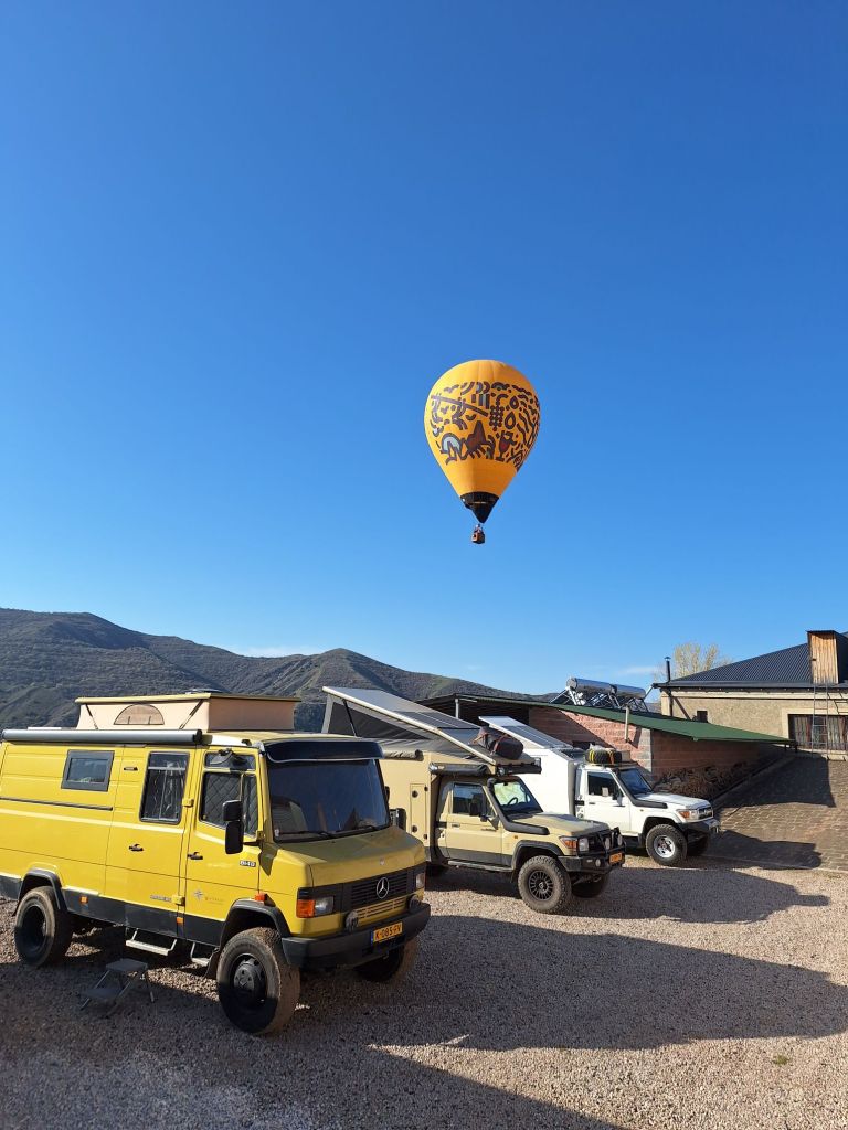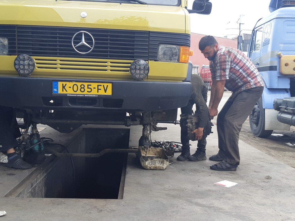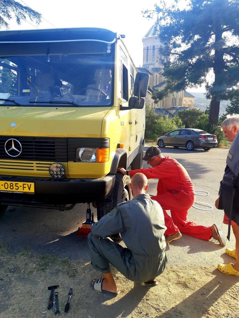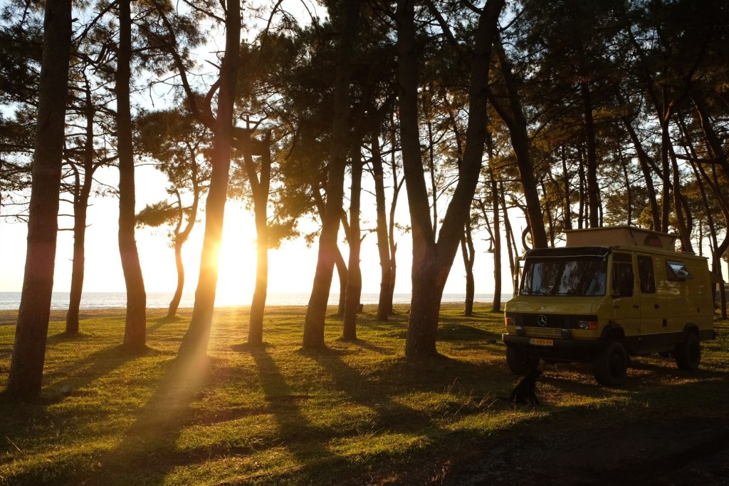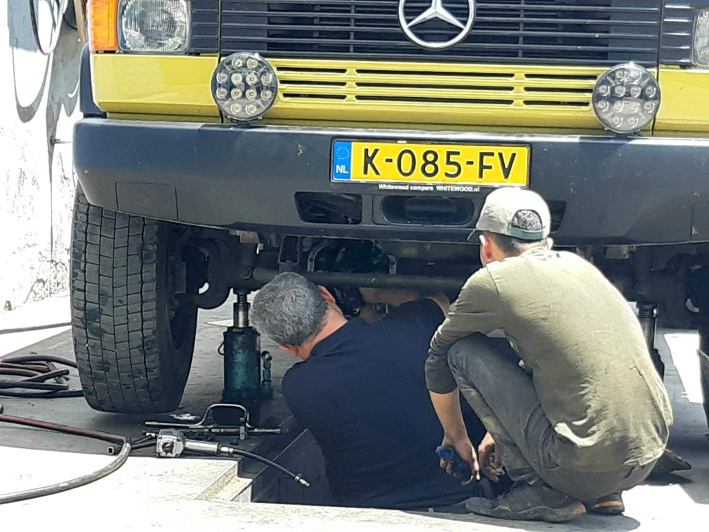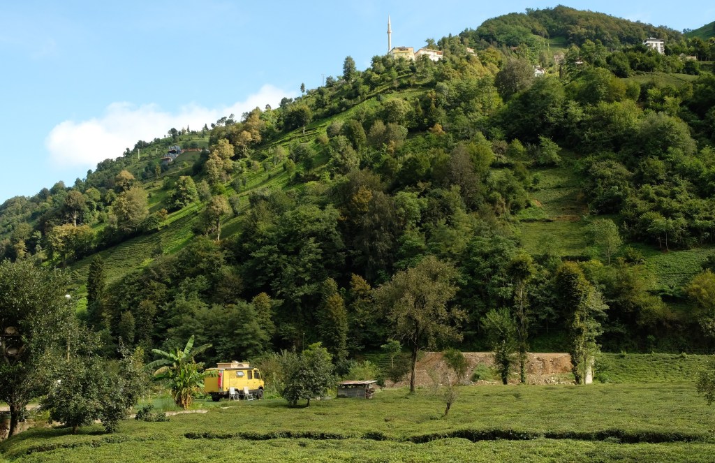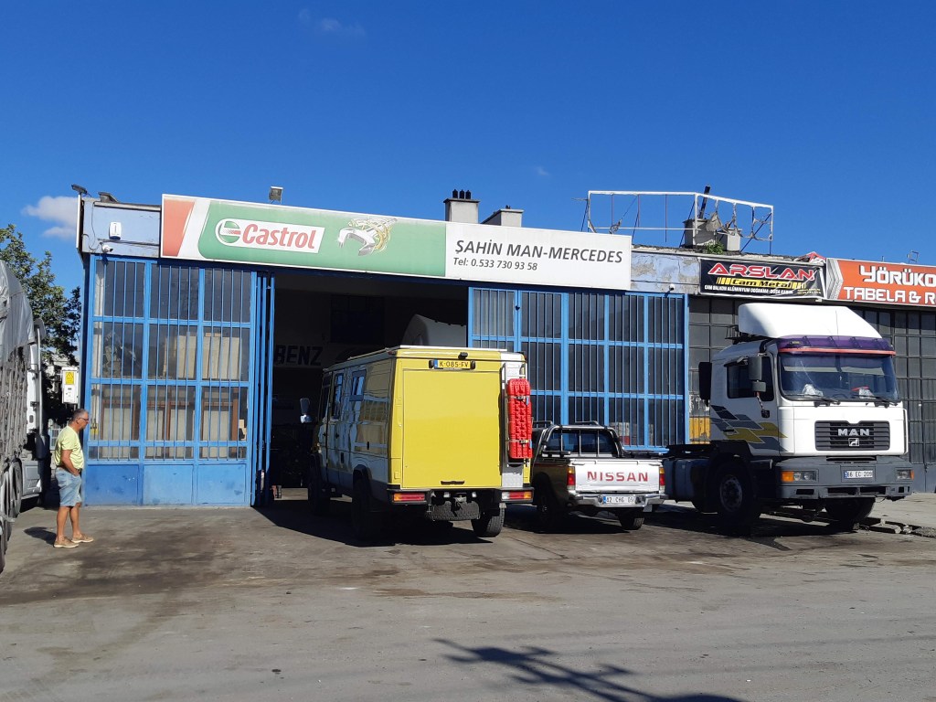 Maandag de 29e hebben we een afspraak bij de Mercedes garage. De vorige keer heeft Georgi ons vortreffelijk geholpen met de vervanging van de luchtverdeler. We hebben hem gevraagd van te voren wat onderdelen te bestellen maar dat is niet helemaal gelukt. Gelukkig weten ze dat we een grote beurt nodig hebben, dus daar starten ze gelijk mee. Helaas kunnen ze verder weinig doen. Als we vertrekken om 12 uur, komt Georgi aan. Hij is duidelijk flink ziek en was naar het ziekenhuis. Nou ja, dan laten we het hier bij. We rijden over de fantastische nieuwe snelweg naar Kutaisi. Die Chinezen hebben hard gewerkt hier aan flink wat tunnels en bruggen. Jammer dat ze nog geen rustplaatsen hebben gemaakt, voor de lunch moeten we een dorp inrijden. We hebben bedacht om weer bij Itara Camp te gaan staan. In 2022 hebben we daar heerlijk gestaan met Bart en Annelouc in de tuin van de Duitsers Claudia en Christoph. Op de website zie ik dat ze hard gewerkt hebben en er nu een huisje staat en een badkamer en keuken voor gasten. Als we de snelweg verlaten rijden we door het prachtige gebied rond Ozurgeti. Het is tropisch groen begroeid en vochtig warm. We worden hartelijk ontvangen. ’s Avonds komt er zowaar een MAN truck bij. De volgende dag regent het helaas de hele dag. Ik boek een vliegticket van Trabzon naar huis en een ferry-ticket voor Joost van Griekendland naar Ancone, Italie. ’s Avonds borrelen we gezellig met Klaus en zijn vrouw en een ander stel dat vandaag met een camper is aangekomen. Het is een ratjetoe van Engels en Duits maar zeker gezellig. In de morgen schijnt de zon, poets ik wat en we maken een wandeling. ’s Avonds is het weer gezellig in de gastenkeuken. En dan is het tijd om richting Turkije te gaan. We vinden het beide een raar idee om uit elkaar te gaan na 6 maanden, maar we zijn het eens dat het goed is zo. We maken nog een tussenstop aan het strand van Gonio, vlak onder Batumi. We maken een wandeling en zien langzaam de zon in de zee zakken onder het genot van een gebraden kippetje met gebakken aardappeltjes en aubergine rolletjes met walnoten die we vanochtend gescoord hebben. Vrijdag 3 oktober rijden we de grens met Turkije over. Ook hier wil ik van mijn Georgische Lari’s af. Een jongeman wil ze eigenlijk niet aannemen zonder er iets voor terug te geven. Hij neemt ze toch aan en als ik Turkse Lira’s sta te pinnen geeft hij mij een volle hand met snoepjes. Dat voelt blijkbaar toch beter. We rijden langs te Turkse kust, kopen bij een postkantoor een tolticket en parkeren op de luchthaven van Trabzon. Het parkeerterrein is flink vol maar ze doen hun best een plekje voor ons te vinden. Na een broodje nemen we een taxi de stad in. Trabzon is een heerlijke stad met veel marktjes en winkeltjes en het is prima weer. We lopen lekker rond en zoeken nog wat cadeautjes. Het kost wat moeite een tentje te vinden waar we een biertje kunnen drinken in deze islamitische stad. Er zitten veel Russen en de uitbaatster spreekt dan ook vloeiend Russisch. We eindigen in een traditioneel restaurantje en laten ons weer terugrijden naar de Chef.