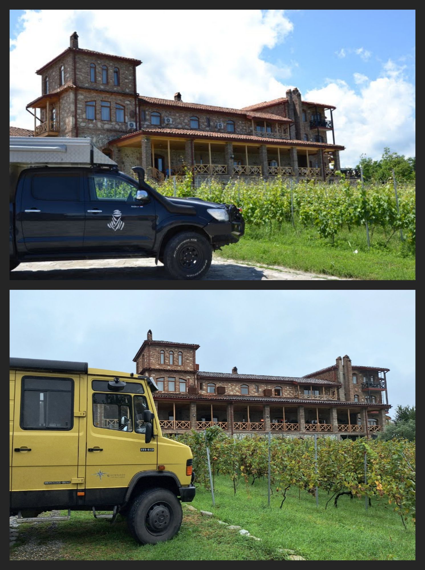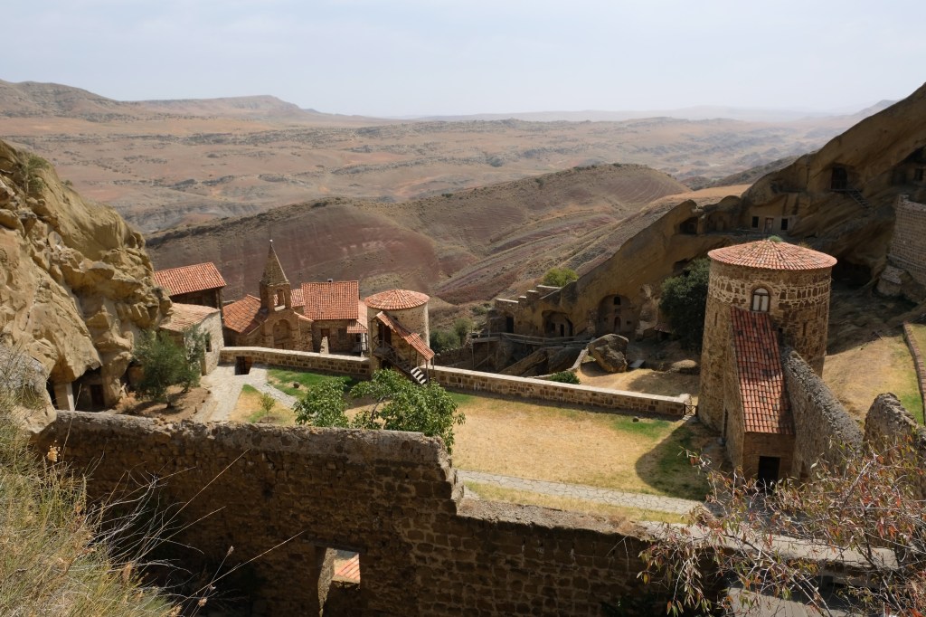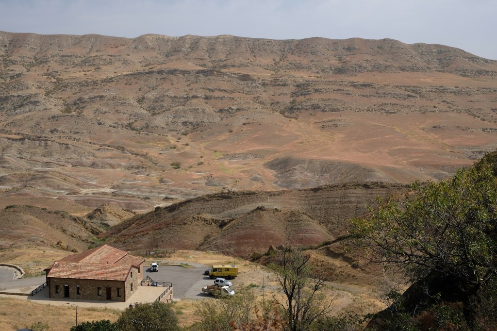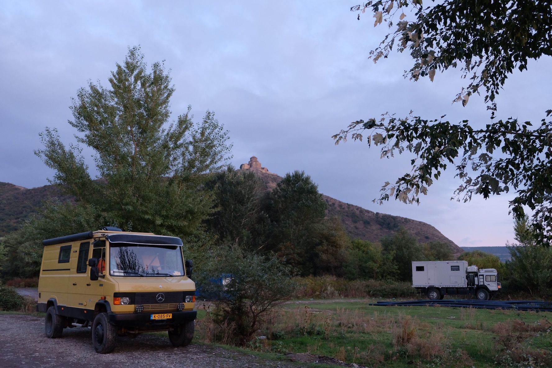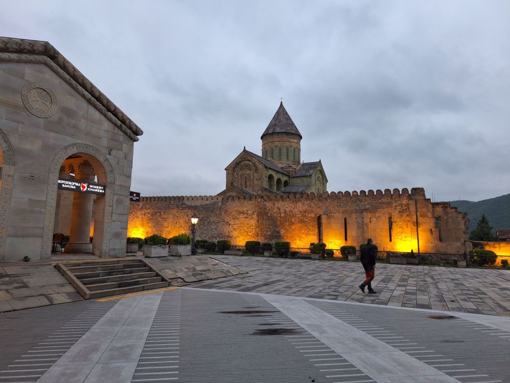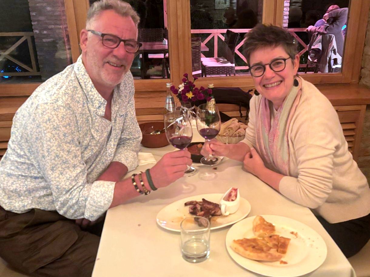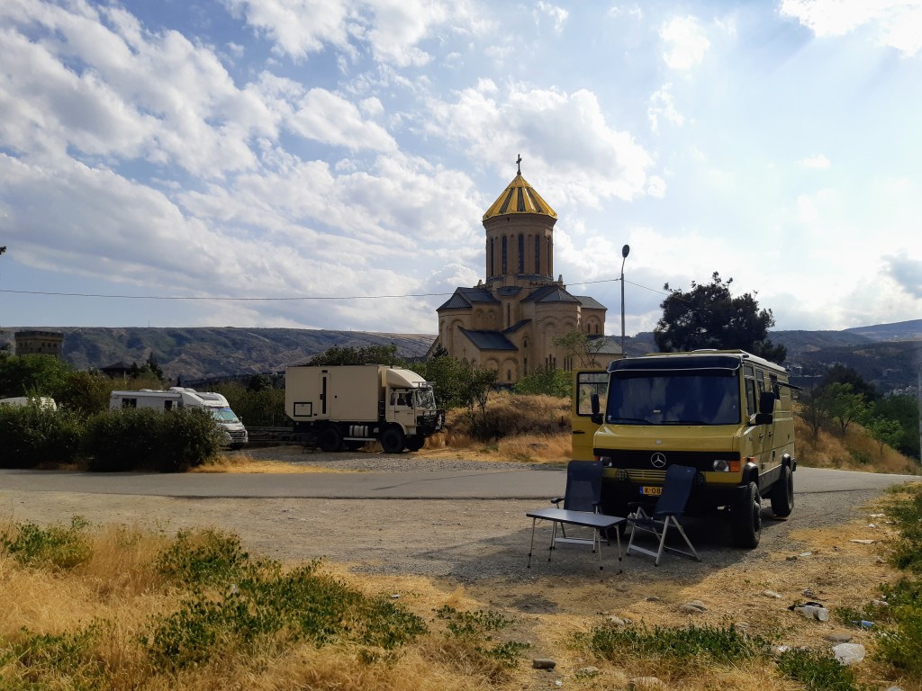 Maar first things first, de was! We slapen uit en de camper bewoners zijn al met een gids naar de Sameba kerk op de top van de berg geweest, als we aan het ontbijt zitten. In Kazbegi gaan we ergens koffie drinken en wachten tot de wasserette opengaat. Als we de was wegbrengen, blijkt dat we die pas vanavond kunnen ophalen. Jammer! Vooral jammer omdat een dichte koude mist is komen opzetten, dus ergens gaan wandelen is ook geen lonkend perspectief. Ik weet nog van andere reizigers dat er een heerlijk hotel is waar je kunt rondhangen. In Hotel Rooms gaan we dus lekker lunchen en zoeken een heerlijk plekje waar we met een flink stuk taart (te groot) en wat drankjes de middag doorbrengen. Omdat we onszelf nog wat willen verwennen, boek ik een kamer bij wijnmaker Schuchmann in Telavi. Daar waren we in 2016 ook en die ervaring is blijven hangen. Buiten is echt niets te zien van het befaamde uitzicht op het Sameba klooster. Om acht uur halen we de was op bij de dames en rijden in het donker maar weer terug naar de parkeerplaats om te overnachten. We staan dit keer alleen. De volgende ochtend staan we vroeg op en in dichte mist rijden we de 2400 meter Jvari pas over (voor de 8e keer). De weg is beter geworden, maar de tunnel die de Chinezen al jaran aan het maken zijn, is nog niet af. Na de pas rijden we de prachtige route door de heuvels en bossen richting Telavi. Helaas zien we weinig door de dichte mist. Om 13 uur arriveren we bij de wijnmaker. Aangezien onze kamer nog niet klaar is, kunnen we gebruik maken van de sauna. Heerlijk! Joost neemt ook nog een massage. Ik denk alvast een douche op de kamer te nemen, maar de kamer is nog steeds niet klaar. Blijkbaar is het erg druk. Pas al Joost terugkomt, zijn ze het bed aan het dekken. Joost haalt twee glazen wijn en dan effe niks. Om 19 uur schuiven we aan voor een heerlijk diner met vijf verschillende wijnen. De vrouwelijke sommelier spreekt voortreffelijk Duits en Engels en neemt alle tijd om ons vanalles te vertellen. Wat een verwennerij. De volgende morgen slapen we lekker uit en genieten van een lekker ontbijtje. Dan kopen we nog wat wijn in de winkel. Als ik een foto laat zien van ons bezoek uit 2016 dan blijkt de manager ons destijds te hebben rondgeleid! Dat is grappig. Hij vertelt dat er de laatste tijd erg veel Nederlanders langskomen. We nemen afscheid en rijden de weg terug naar Mtskheta. We zijn daar op de heenweg ook geweest maar hebben de kathedraal (werelderfgoed) toen niet bezocht. We parkeren bij het politiebureau en zien direct de MAN vrachtwagen staan van Duitsers die we in Atyrau zijn tegengekomen. We maken een praatje met een Francaise in een busje die met 3 honden op pad is. We lopen een rondje en bezoeken de indrukwekkende kathedraal. We nemen een glas wijn bij een wijnhandel en met ondergaande zon eten we nog een prima pizza op het terras.