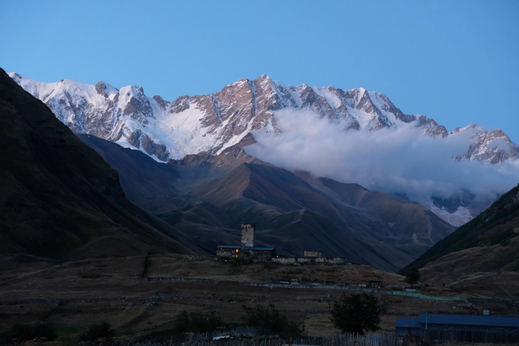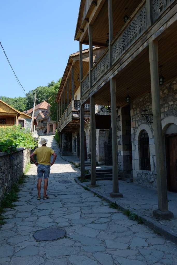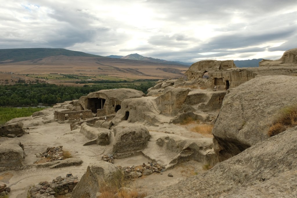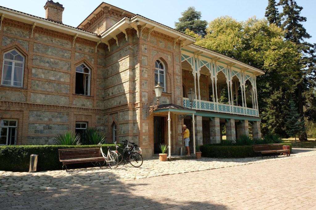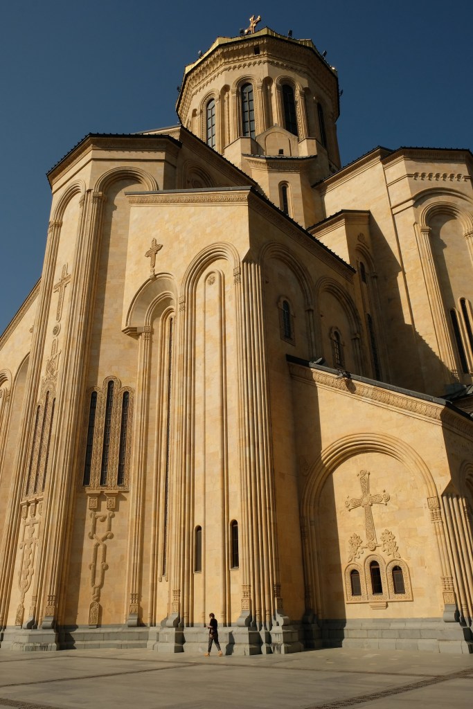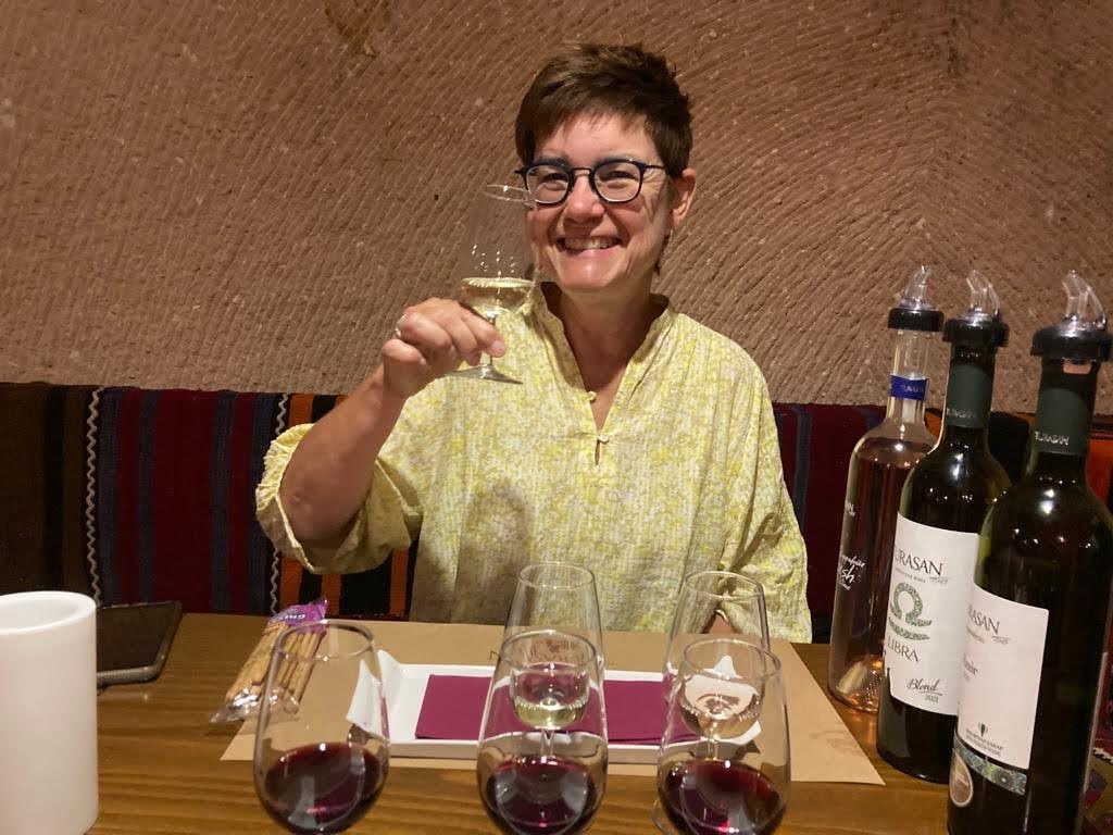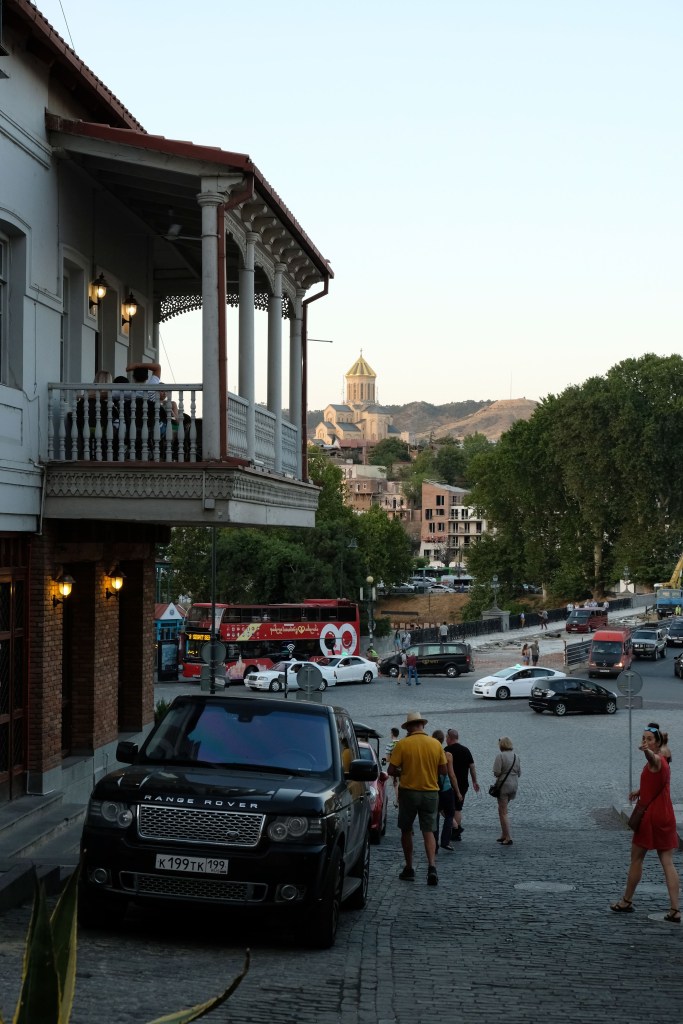 Maar first things first, de was! We slapen uit en de camper bewoners zijn al met een gids naar de Sameba kerk op de top van de berg geweest, als we aan het ontbijt zitten. In Kazbegi gaan we ergens koffie drinken en wachten tot de wasserette opengaat. Als we de was wegbrengen, blijkt dat we die pas vanavond kunnen ophalen. Jammer! Vooral jammer omdat een dichte koude mist is komen opzetten, dus ergens gaan wandelen is ook geen lonkend perspectief. Ik weet nog van andere reizigers dat er een heerlijk hotel is waar je kunt rondhangen. In Hotel Rooms gaan we dus lekker lunchen en zoeken een heerlijk plekje waar we met een flink stuk taart (te groot) en wat drankjes de middag doorbrengen. Omdat we onszelf nog wat willen verwennen, boek ik een kamer bij wijnmaker Schuchmann in Telavi. Daar waren we in 2016 ook en die ervaring is blijven hangen. Buiten is echt niets te zien van het befaamde uitzicht op het Sameba klooster. Om acht uur halen we de was op bij de dames en rijden in het donker maar weer terug naar de parkeerplaats om te overnachten. We staan dit keer alleen. De volgende ochtend staan we vroeg op en in dichte mist rijden we de 2400 meter Jvari pas over (voor de 8e keer). De weg is beter geworden, maar de tunnel die de Chinezen al jaran aan het maken zijn, is nog niet af. Na de pas rijden we de prachtige route door de heuvels en bossen richting Telavi. Helaas zien we weinig door de dichte mist. Om 13 uur arriveren we bij de wijnmaker. Aangezien onze kamer nog niet klaar is, kunnen we gebruik maken van de sauna. Heerlijk! Joost neemt ook nog een massage. Ik denk alvast een douche op de kamer te nemen, maar de kamer is nog steeds niet klaar. Blijkbaar is het erg druk. Pas al Joost terugkomt, zijn ze het bed aan het dekken. Joost haalt twee glazen wijn en dan effe niks. Om 19 uur schuiven we aan voor een heerlijk diner met vijf verschillende wijnen. De vrouwelijke sommelier spreekt voortreffelijk Duits en Engels en neemt alle tijd om ons vanalles te vertellen. Wat een verwennerij. De volgende morgen slapen we lekker uit en genieten van een lekker ontbijtje. Dan kopen we nog wat wijn in de winkel. Als ik een foto laat zien van ons bezoek uit 2016 dan blijkt de manager ons destijds te hebben rondgeleid! Dat is grappig. Hij vertelt dat er de laatste tijd erg veel Nederlanders langskomen. We nemen afscheid en rijden de weg terug naar Mtskheta. We zijn daar op de heenweg ook geweest maar hebben de kathedraal (werelderfgoed) toen niet bezocht. We parkeren bij het politiebureau en zien direct de MAN vrachtwagen staan van Duitsers die we in Atyrau zijn tegengekomen. We maken een praatje met een Francaise in een busje die met 3 honden op pad is. We lopen een rondje en bezoeken de indrukwekkende kathedraal. We nemen een glas wijn bij een wijnhandel en met ondergaande zon eten we nog een prima pizza op het terras.
