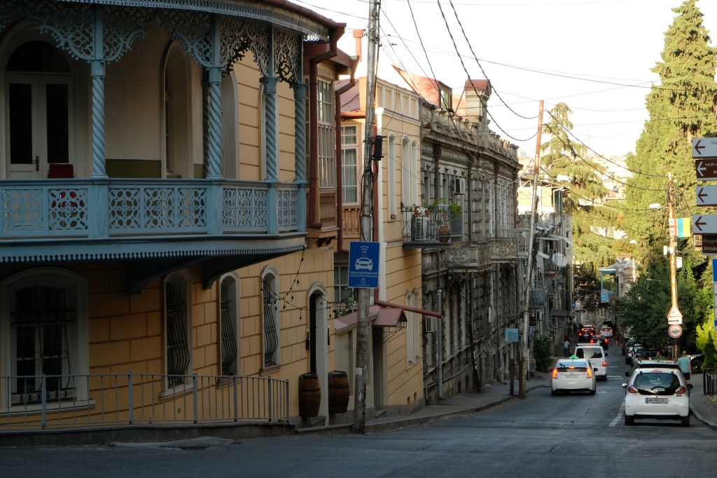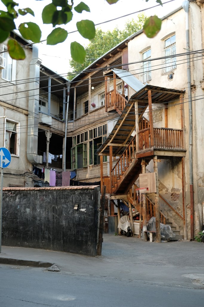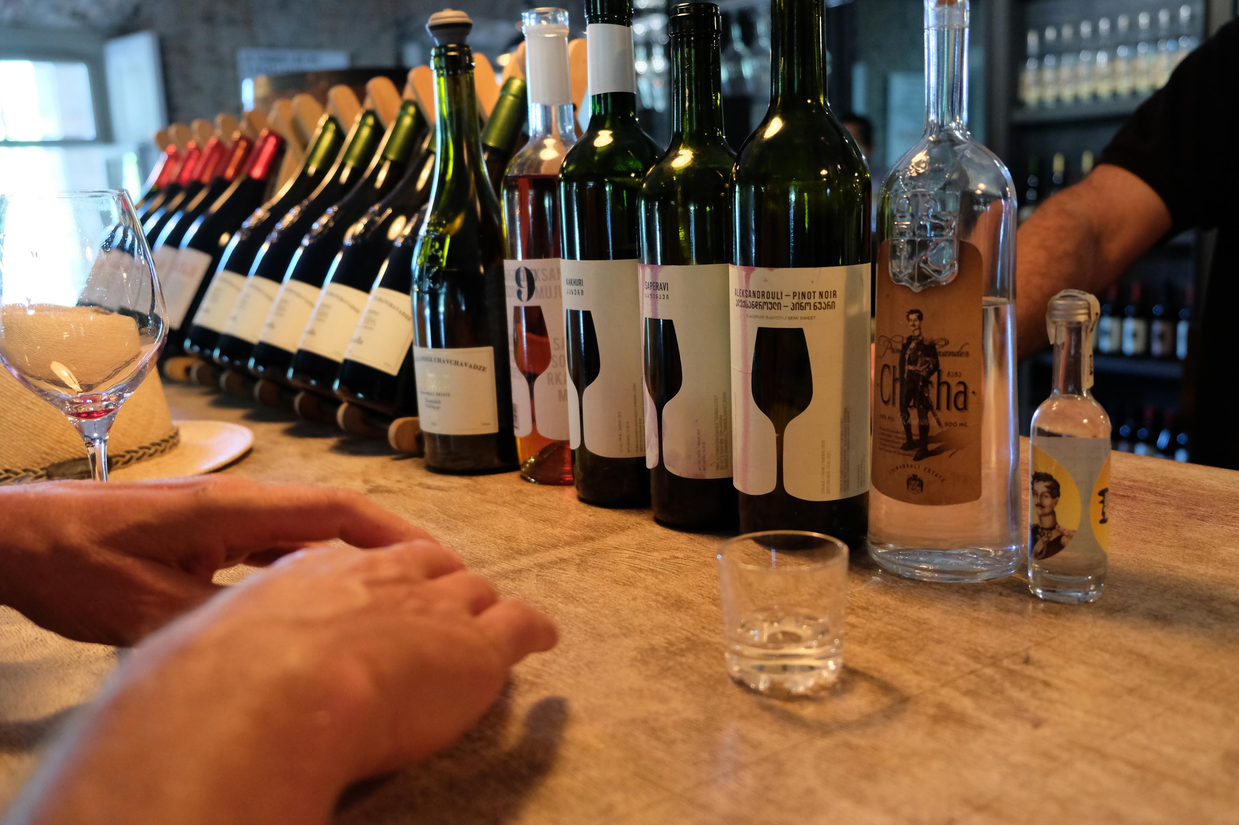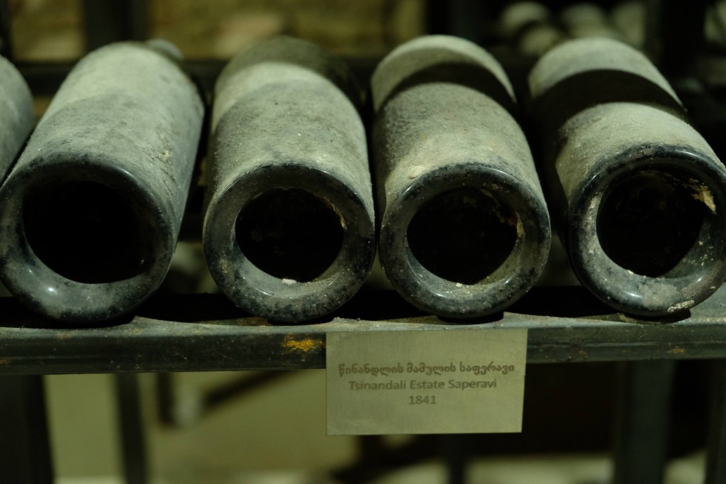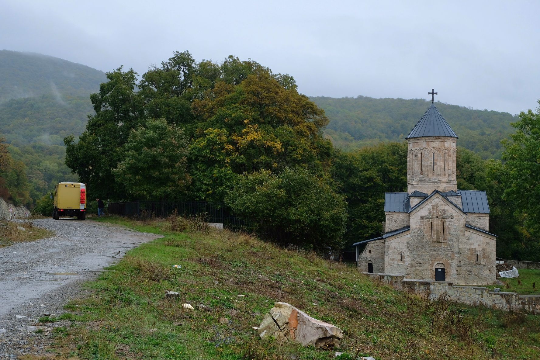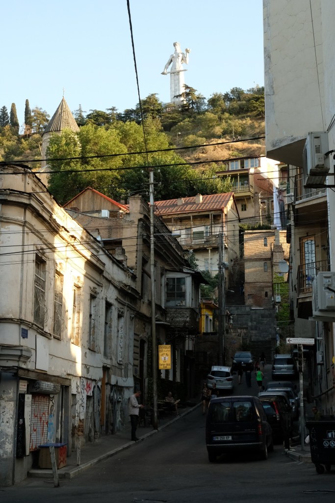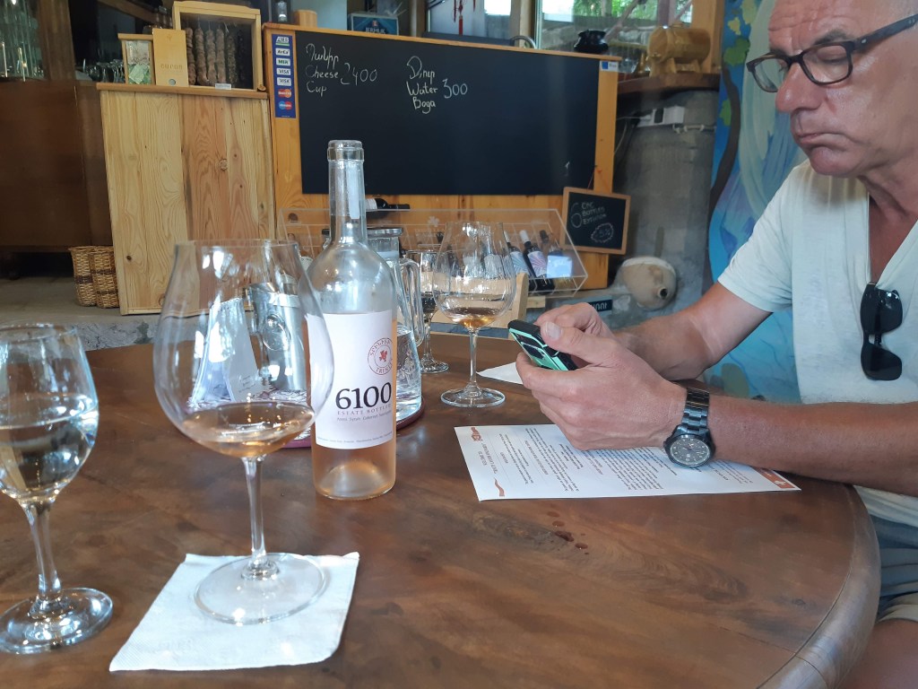 Maar first things first, de was! We slapen uit en de camper bewoners zijn al met een gids naar de Sameba kerk op de top van de berg geweest, als we aan het ontbijt zitten. In Kazbegi gaan we ergens koffie drinken en wachten tot de wasserette opengaat. Als we de was wegbrengen, blijkt dat we die pas vanavond kunnen ophalen. Jammer! Vooral jammer omdat een dichte koude mist is komen opzetten, dus ergens gaan wandelen is ook geen lonkend perspectief. Ik weet nog van andere reizigers dat er een heerlijk hotel is waar je kunt rondhangen. In Hotel Rooms gaan we dus lekker lunchen en zoeken een heerlijk plekje waar we met een flink stuk taart (te groot) en wat drankjes de middag doorbrengen. Omdat we onszelf nog wat willen verwennen, boek ik een kamer bij wijnmaker Schuchmann in Telavi. Daar waren we in 2016 ook en die ervaring is blijven hangen. Buiten is echt niets te zien van het befaamde uitzicht op het Sameba klooster. Om acht uur halen we de was op bij de dames en rijden in het donker maar weer terug naar de parkeerplaats om te overnachten. We staan dit keer alleen. De volgende ochtend staan we vroeg op en in dichte mist rijden we de 2400 meter Jvari pas over (voor de 8e keer). De weg is beter geworden, maar de tunnel die de Chinezen al jaran aan het maken zijn, is nog niet af. Na de pas rijden we de prachtige route door de heuvels en bossen richting Telavi. Helaas zien we weinig door de dichte mist. Om 13 uur arriveren we bij de wijnmaker. Aangezien onze kamer nog niet klaar is, kunnen we gebruik maken van de sauna. Heerlijk! Joost neemt ook nog een massage. Ik denk alvast een douche op de kamer te nemen, maar de kamer is nog steeds niet klaar. Blijkbaar is het erg druk. Pas al Joost terugkomt, zijn ze het bed aan het dekken. Joost haalt twee glazen wijn en dan effe niks. Om 19 uur schuiven we aan voor een heerlijk diner met vijf verschillende wijnen. De vrouwelijke sommelier spreekt voortreffelijk Duits en Engels en neemt alle tijd om ons vanalles te vertellen. Wat een verwennerij. De volgende morgen slapen we lekker uit en genieten van een lekker ontbijtje. Dan kopen we nog wat wijn in de winkel. Als ik een foto laat zien van ons bezoek uit 2016 dan blijkt de manager ons destijds te hebben rondgeleid! Dat is grappig. Hij vertelt dat er de laatste tijd erg veel Nederlanders langskomen. We nemen afscheid en rijden de weg terug naar Mtskheta. We zijn daar op de heenweg ook geweest maar hebben de kathedraal (werelderfgoed) toen niet bezocht. We parkeren bij het politiebureau en zien direct de MAN vrachtwagen staan van Duitsers die we in Atyrau zijn tegengekomen. We maken een praatje met een Francaise in een busje die met 3 honden op pad is. We lopen een rondje en bezoeken de indrukwekkende kathedraal. We nemen een glas wijn bij een wijnhandel en met ondergaande zon eten we nog een prima pizza op het terras.
