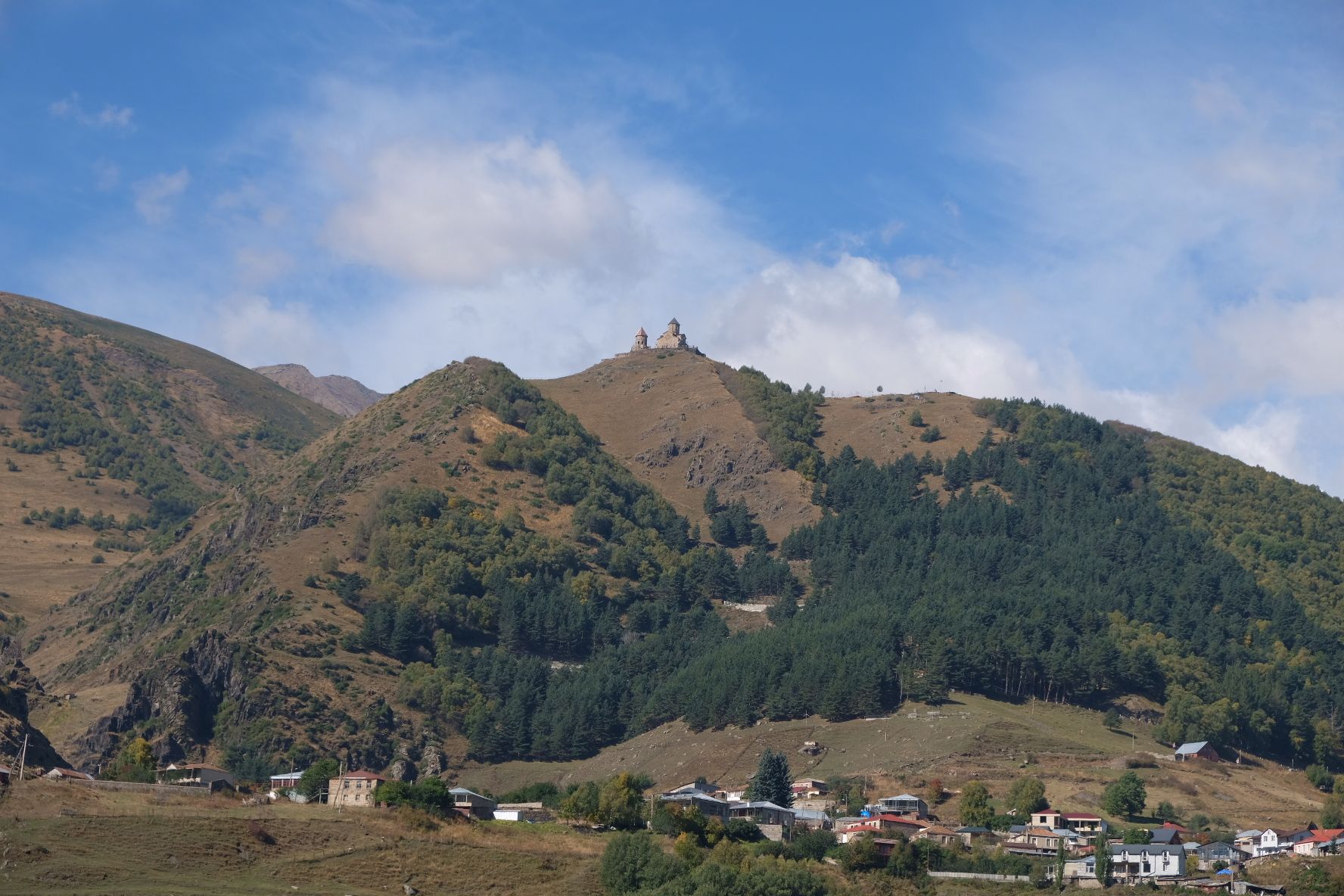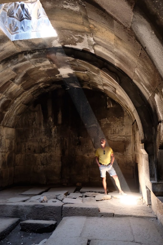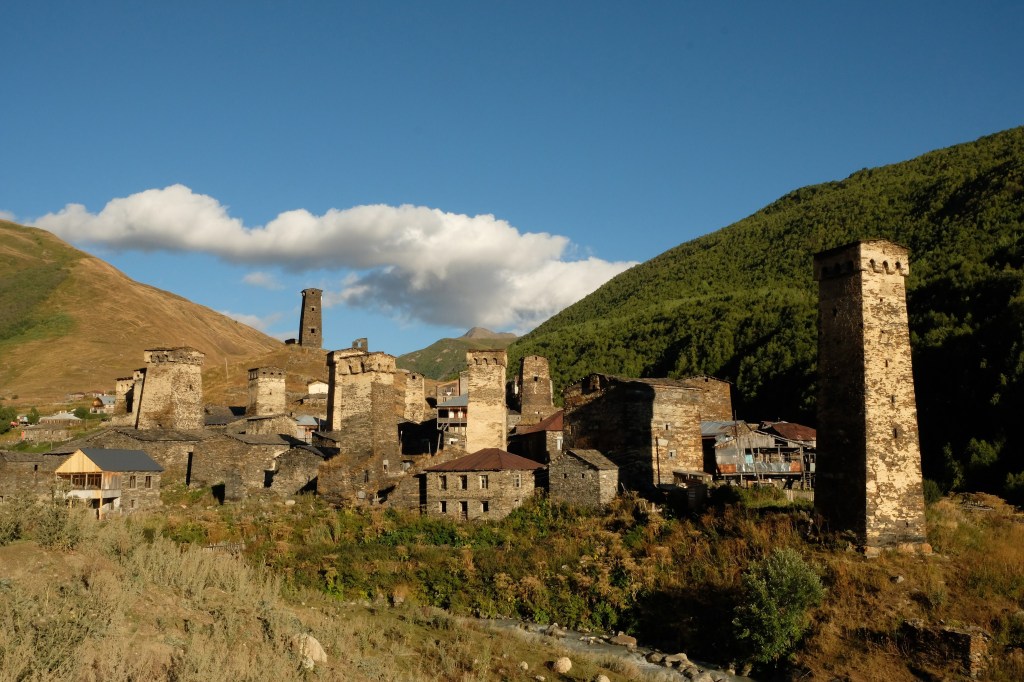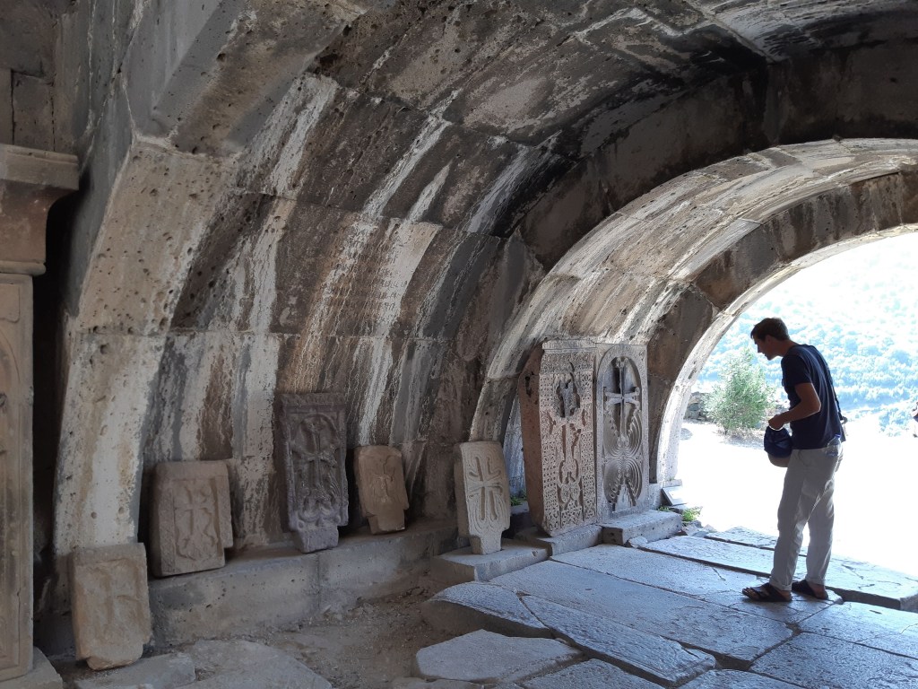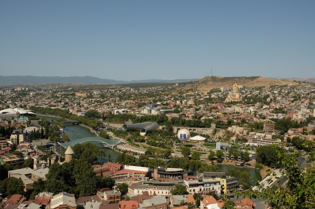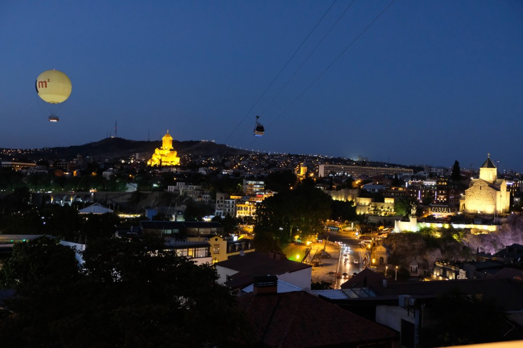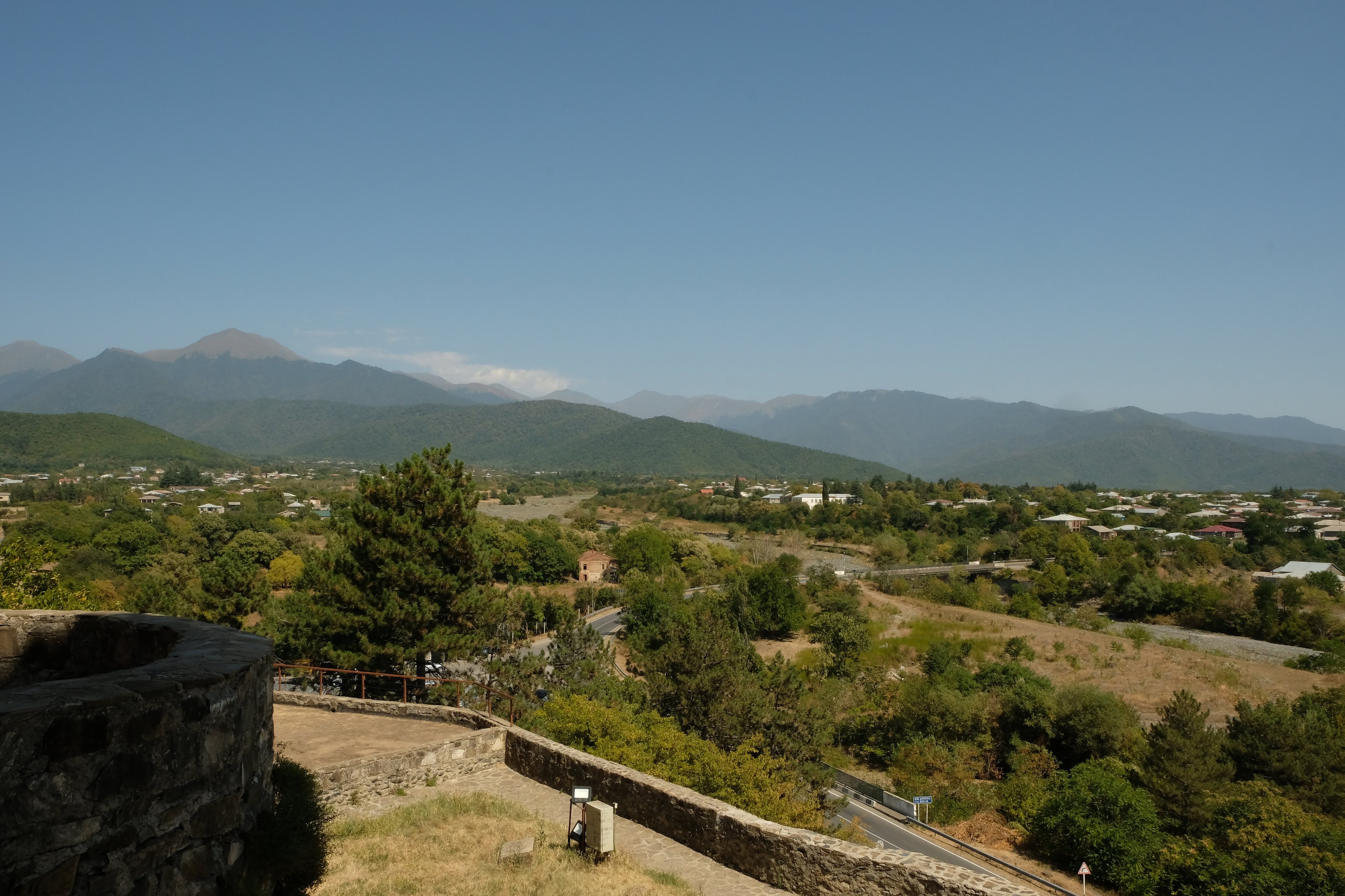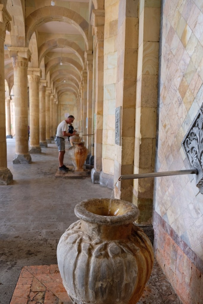 Maar first things first, de was! We slapen uit en de camper bewoners zijn al met een gids naar de Sameba kerk op de top van de berg geweest, als we aan het ontbijt zitten. In Kazbegi gaan we ergens koffie drinken en wachten tot de wasserette opengaat. Als we de was wegbrengen, blijkt dat we die pas vanavond kunnen ophalen. Jammer! Vooral jammer omdat een dichte koude mist is komen opzetten, dus ergens gaan wandelen is ook geen lonkend perspectief. Ik weet nog van andere reizigers dat er een heerlijk hotel is waar je kunt rondhangen. In Hotel Rooms gaan we dus lekker lunchen en zoeken een heerlijk plekje waar we met een flink stuk taart (te groot) en wat drankjes de middag doorbrengen. Omdat we onszelf nog wat willen verwennen, boek ik een kamer bij wijnmaker Schuchmann in Telavi. Daar waren we in 2016 ook en die ervaring is blijven hangen. Buiten is echt niets te zien van het befaamde uitzicht op het Sameba klooster. Om acht uur halen we de was op bij de dames en rijden in het donker maar weer terug naar de parkeerplaats om te overnachten. We staan dit keer alleen. De volgende ochtend staan we vroeg op en in dichte mist rijden we de 2400 meter Jvari pas over (voor de 8e keer). De weg is beter geworden, maar de tunnel die de Chinezen al jaran aan het maken zijn, is nog niet af. Na de pas rijden we de prachtige route door de heuvels en bossen richting Telavi. Helaas zien we weinig door de dichte mist. Om 13 uur arriveren we bij de wijnmaker. Aangezien onze kamer nog niet klaar is, kunnen we gebruik maken van de sauna. Heerlijk! Joost neemt ook nog een massage. Ik denk alvast een douche op de kamer te nemen, maar de kamer is nog steeds niet klaar. Blijkbaar is het erg druk. Pas al Joost terugkomt, zijn ze het bed aan het dekken. Joost haalt twee glazen wijn en dan effe niks. Om 19 uur schuiven we aan voor een heerlijk diner met vijf verschillende wijnen. De vrouwelijke sommelier spreekt voortreffelijk Duits en Engels en neemt alle tijd om ons vanalles te vertellen. Wat een verwennerij. De volgende morgen slapen we lekker uit en genieten van een lekker ontbijtje. Dan kopen we nog wat wijn in de winkel. Als ik een foto laat zien van ons bezoek uit 2016 dan blijkt de manager ons destijds te hebben rondgeleid! Dat is grappig. Hij vertelt dat er de laatste tijd erg veel Nederlanders langskomen. We nemen afscheid en rijden de weg terug naar Mtskheta. We zijn daar op de heenweg ook geweest maar hebben de kathedraal (werelderfgoed) toen niet bezocht. We parkeren bij het politiebureau en zien direct de MAN vrachtwagen staan van Duitsers die we in Atyrau zijn tegengekomen. We maken een praatje met een Francaise in een busje die met 3 honden op pad is. We lopen een rondje en bezoeken de indrukwekkende kathedraal. We nemen een glas wijn bij een wijnhandel en met ondergaande zon eten we nog een prima pizza op het terras.