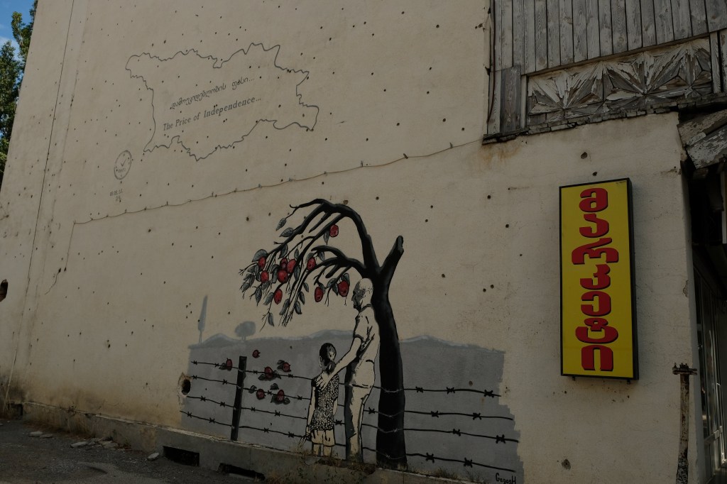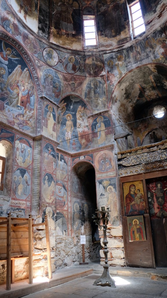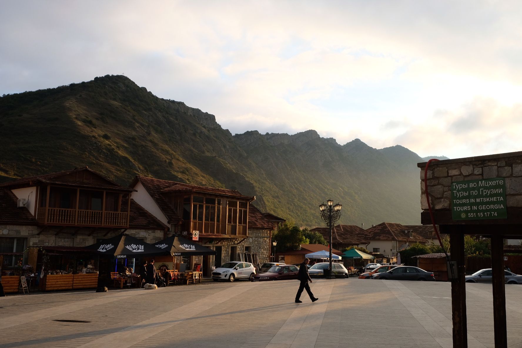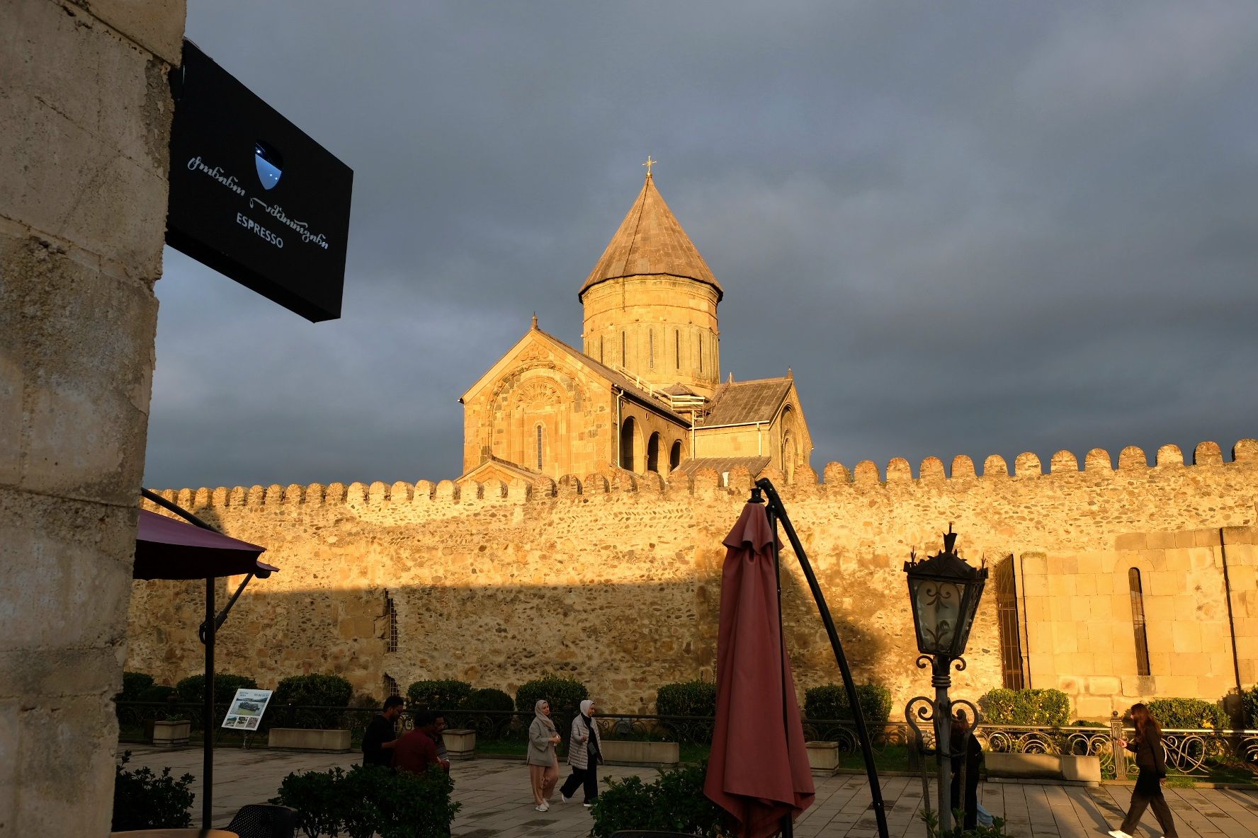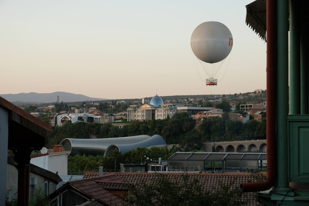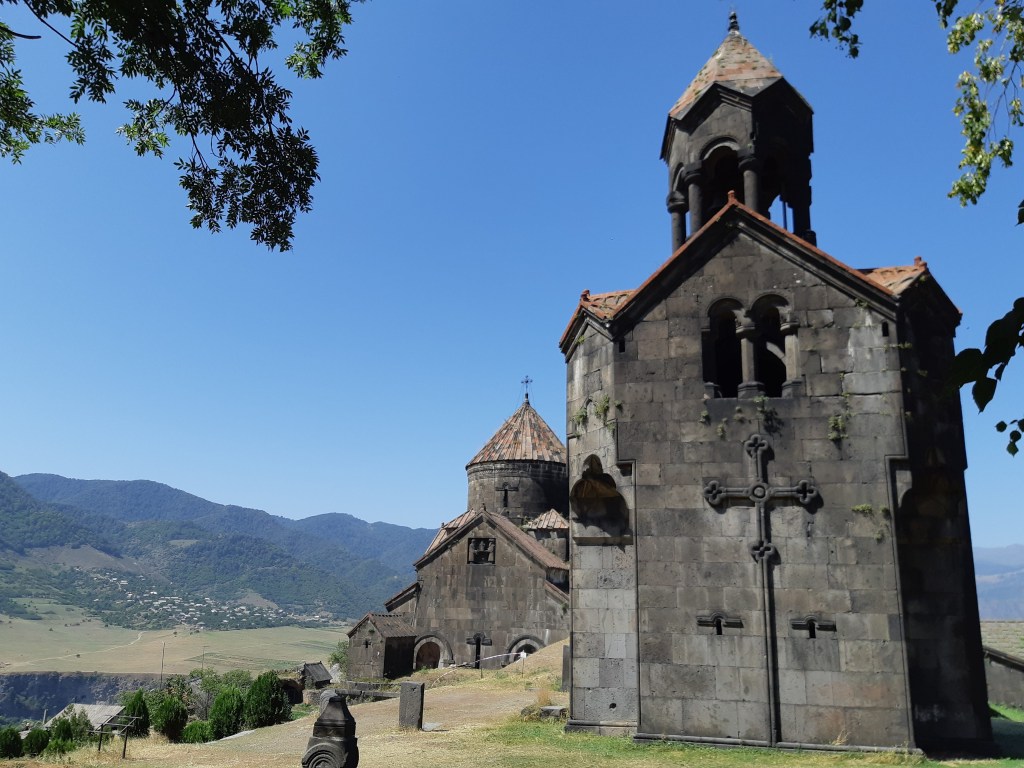 Maar first things first, de was! We slapen uit en de camper bewoners zijn al met een gids naar de Sameba kerk op de top van de berg geweest, als we aan het ontbijt zitten. In Kazbegi gaan we ergens koffie drinken en wachten tot de wasserette opengaat. Als we de was wegbrengen, blijkt dat we die pas vanavond kunnen ophalen. Jammer! Vooral jammer omdat een dichte koude mist is komen opzetten, dus ergens gaan wandelen is ook geen lonkend perspectief. Ik weet nog van andere reizigers dat er een heerlijk hotel is waar je kunt rondhangen. In Hotel Rooms gaan we dus lekker lunchen en zoeken een heerlijk plekje waar we met een flink stuk taart (te groot) en wat drankjes de middag doorbrengen. Omdat we onszelf nog wat willen verwennen, boek ik een kamer bij wijnmaker Schuchmann in Telavi. Daar waren we in 2016 ook en die ervaring is blijven hangen. Buiten is echt niets te zien van het befaamde uitzicht op het Sameba klooster. Om acht uur halen we de was op bij de dames en rijden in het donker maar weer terug naar de parkeerplaats om te overnachten. We staan dit keer alleen. De volgende ochtend staan we vroeg op en in dichte mist rijden we de 2400 meter Jvari pas over (voor de 8e keer). De weg is beter geworden, maar de tunnel die de Chinezen al jaran aan het maken zijn, is nog niet af. Na de pas rijden we de prachtige route door de heuvels en bossen richting Telavi. Helaas zien we weinig door de dichte mist. Om 13 uur arriveren we bij de wijnmaker. Aangezien onze kamer nog niet klaar is, kunnen we gebruik maken van de sauna. Heerlijk! Joost neemt ook nog een massage. Ik denk alvast een douche op de kamer te nemen, maar de kamer is nog steeds niet klaar. Blijkbaar is het erg druk. Pas al Joost terugkomt, zijn ze het bed aan het dekken. Joost haalt twee glazen wijn en dan effe niks. Om 19 uur schuiven we aan voor een heerlijk diner met vijf verschillende wijnen. De vrouwelijke sommelier spreekt voortreffelijk Duits en Engels en neemt alle tijd om ons vanalles te vertellen. Wat een verwennerij. De volgende morgen slapen we lekker uit en genieten van een lekker ontbijtje. Dan kopen we nog wat wijn in de winkel. Als ik een foto laat zien van ons bezoek uit 2016 dan blijkt de manager ons destijds te hebben rondgeleid! Dat is grappig. Hij vertelt dat er de laatste tijd erg veel Nederlanders langskomen. We nemen afscheid en rijden de weg terug naar Mtskheta. We zijn daar op de heenweg ook geweest maar hebben de kathedraal (werelderfgoed) toen niet bezocht. We parkeren bij het politiebureau en zien direct de MAN vrachtwagen staan van Duitsers die we in Atyrau zijn tegengekomen. We maken een praatje met een Francaise in een busje die met 3 honden op pad is. We lopen een rondje en bezoeken de indrukwekkende kathedraal. We nemen een glas wijn bij een wijnhandel en met ondergaande zon eten we nog een prima pizza op het terras.