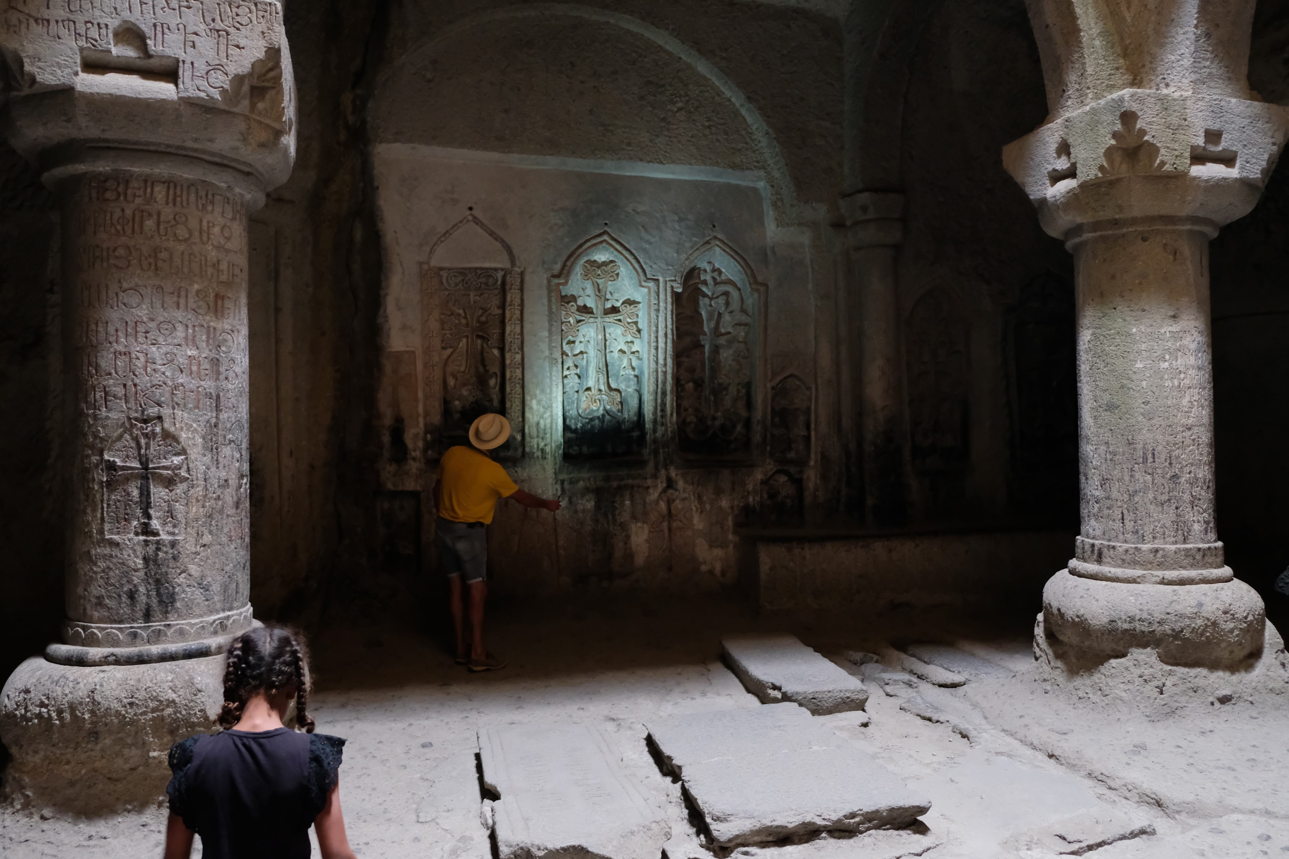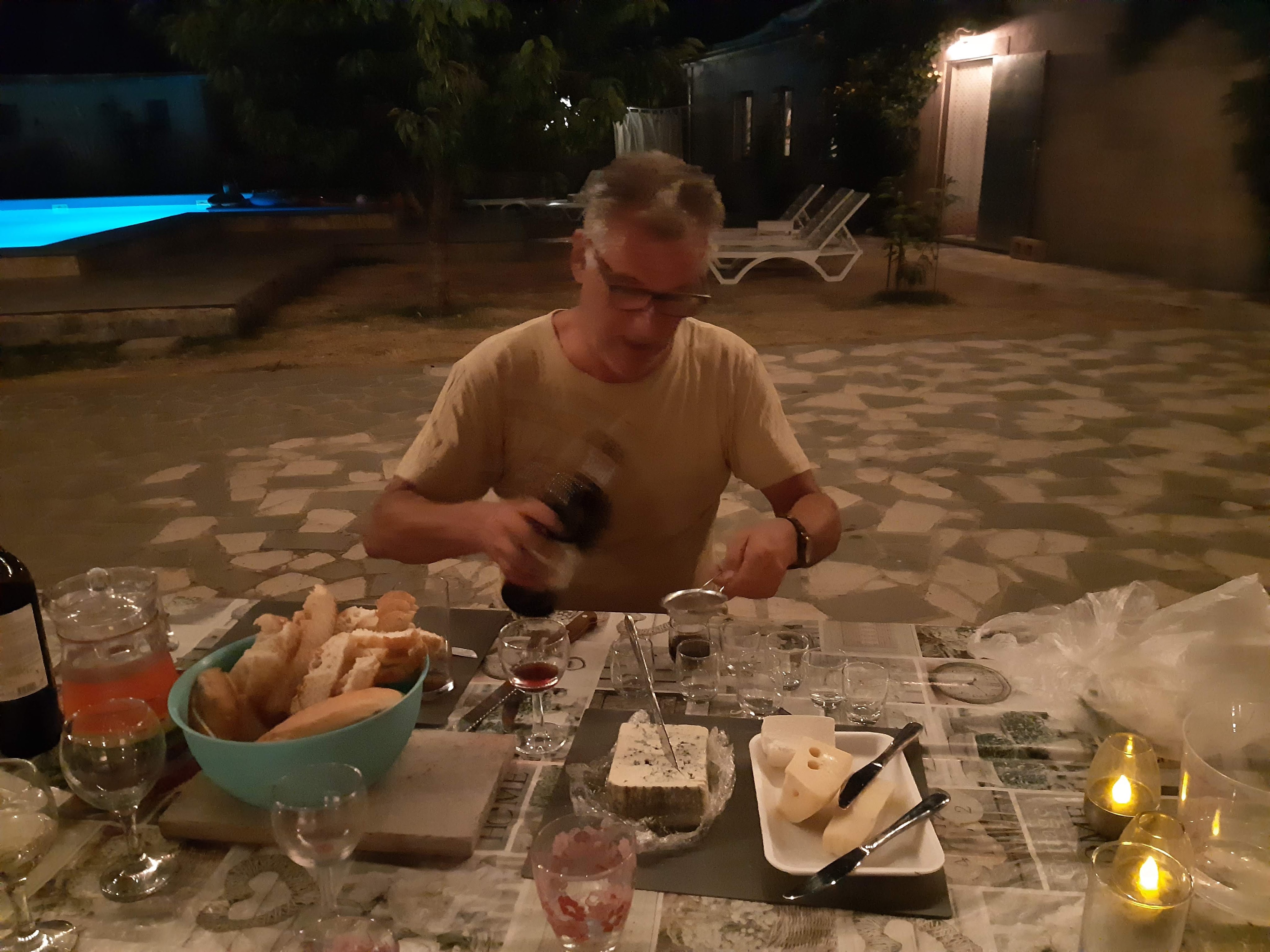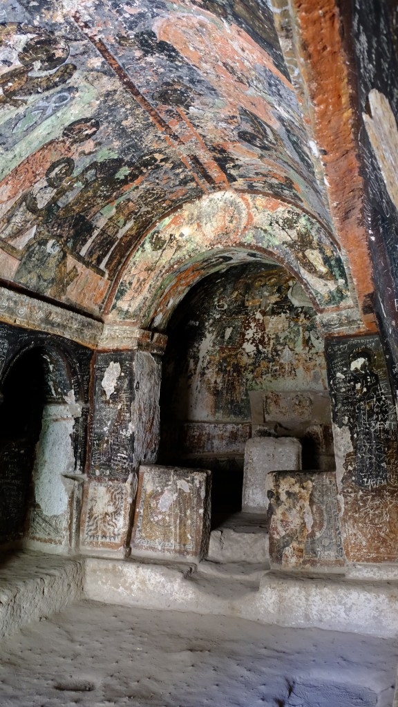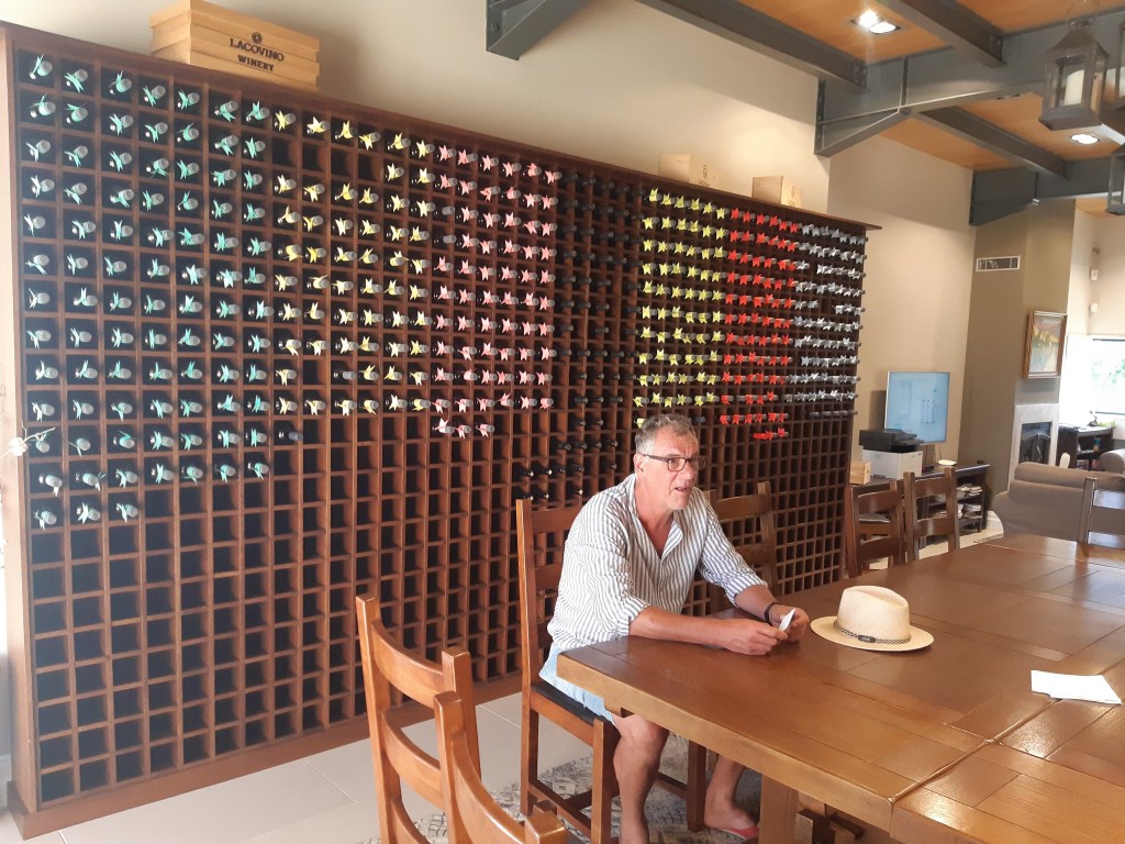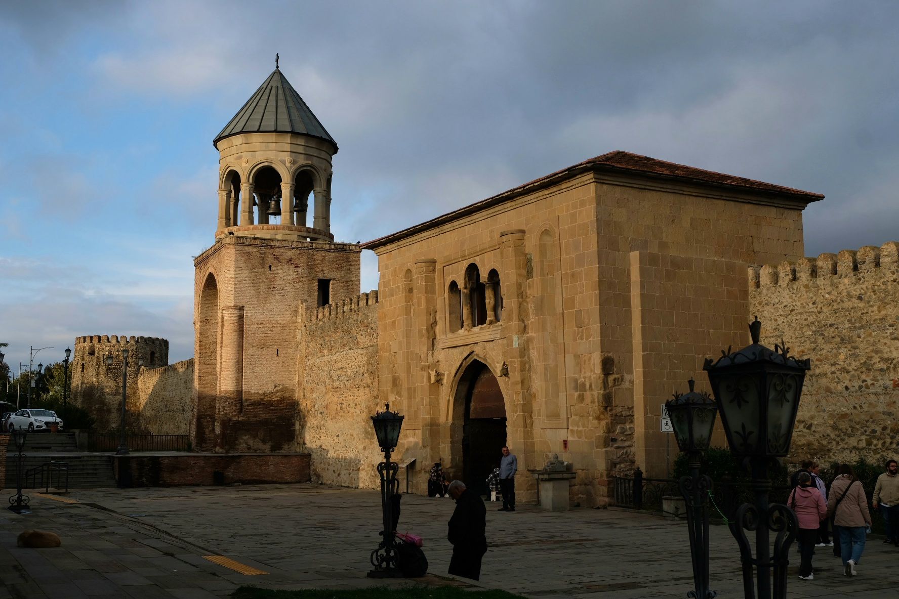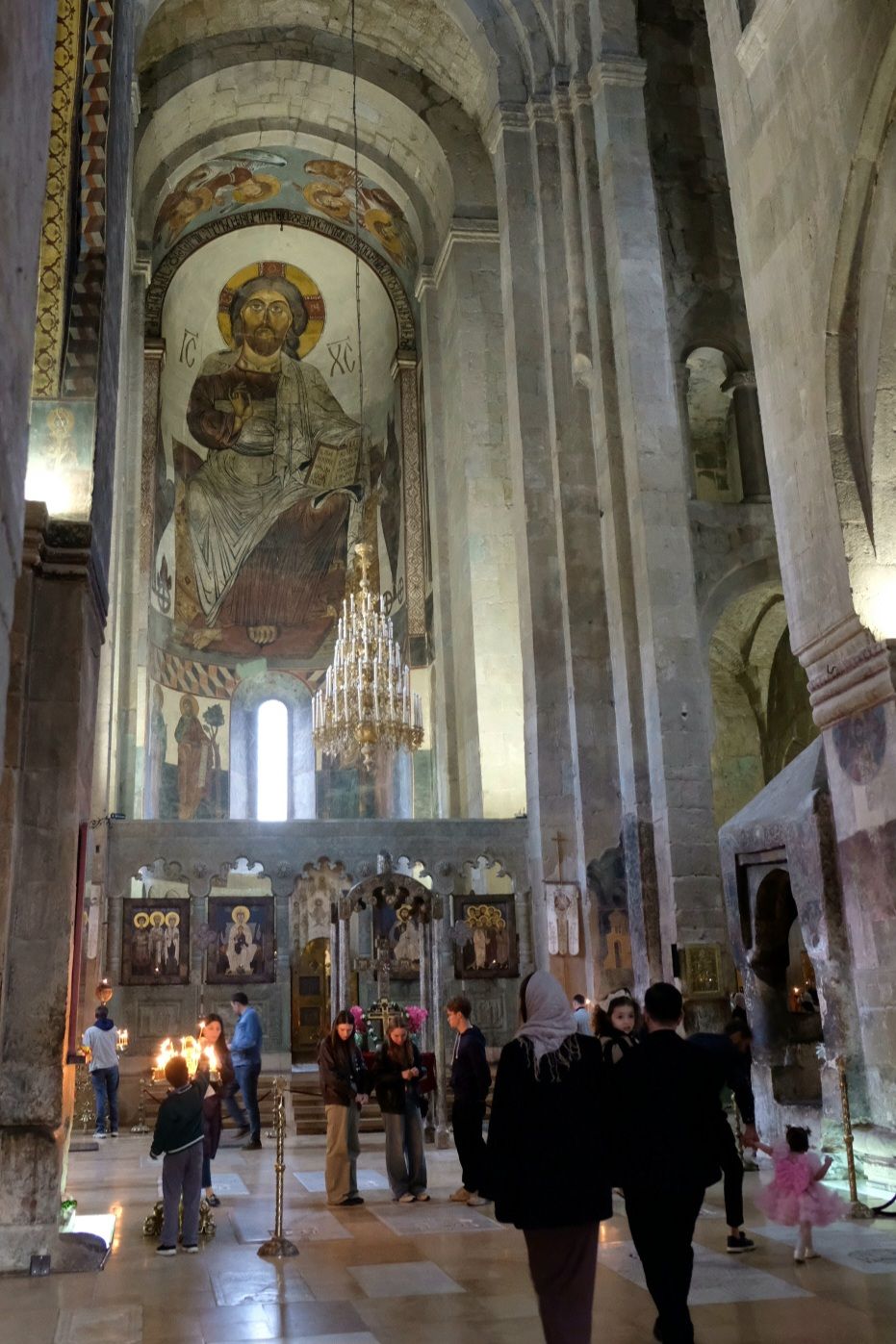 Maar first things first, de was! We slapen uit en de camper bewoners zijn al met een gids naar de Sameba kerk op de top van de berg geweest, als we aan het ontbijt zitten. In Kazbegi gaan we ergens koffie drinken en wachten tot de wasserette opengaat. Als we de was wegbrengen, blijkt dat we die pas vanavond kunnen ophalen. Jammer! Vooral jammer omdat een dichte koude mist is komen opzetten, dus ergens gaan wandelen is ook geen lonkend perspectief. Ik weet nog van andere reizigers dat er een heerlijk hotel is waar je kunt rondhangen. In Hotel Rooms gaan we dus lekker lunchen en zoeken een heerlijk plekje waar we met een flink stuk taart (te groot) en wat drankjes de middag doorbrengen. Omdat we onszelf nog wat willen verwennen, boek ik een kamer bij wijnmaker Schuchmann in Telavi. Daar waren we in 2016 ook en die ervaring is blijven hangen. Buiten is echt niets te zien van het befaamde uitzicht op het Sameba klooster. Om acht uur halen we de was op bij de dames en rijden in het donker maar weer terug naar de parkeerplaats om te overnachten. We staan dit keer alleen. De volgende ochtend staan we vroeg op en in dichte mist rijden we de 2400 meter Jvari pas over (voor de 8e keer). De weg is beter geworden, maar de tunnel die de Chinezen al jaran aan het maken zijn, is nog niet af. Na de pas rijden we de prachtige route door de heuvels en bossen richting Telavi. Helaas zien we weinig door de dichte mist. Om 13 uur arriveren we bij de wijnmaker. Aangezien onze kamer nog niet klaar is, kunnen we gebruik maken van de sauna. Heerlijk! Joost neemt ook nog een massage. Ik denk alvast een douche op de kamer te nemen, maar de kamer is nog steeds niet klaar. Blijkbaar is het erg druk. Pas al Joost terugkomt, zijn ze het bed aan het dekken. Joost haalt twee glazen wijn en dan effe niks. Om 19 uur schuiven we aan voor een heerlijk diner met vijf verschillende wijnen. De vrouwelijke sommelier spreekt voortreffelijk Duits en Engels en neemt alle tijd om ons vanalles te vertellen. Wat een verwennerij. De volgende morgen slapen we lekker uit en genieten van een lekker ontbijtje. Dan kopen we nog wat wijn in de winkel. Als ik een foto laat zien van ons bezoek uit 2016 dan blijkt de manager ons destijds te hebben rondgeleid! Dat is grappig. Hij vertelt dat er de laatste tijd erg veel Nederlanders langskomen. We nemen afscheid en rijden de weg terug naar Mtskheta. We zijn daar op de heenweg ook geweest maar hebben de kathedraal (werelderfgoed) toen niet bezocht. We parkeren bij het politiebureau en zien direct de MAN vrachtwagen staan van Duitsers die we in Atyrau zijn tegengekomen. We maken een praatje met een Francaise in een busje die met 3 honden op pad is. We lopen een rondje en bezoeken de indrukwekkende kathedraal. We nemen een glas wijn bij een wijnhandel en met ondergaande zon eten we nog een prima pizza op het terras.