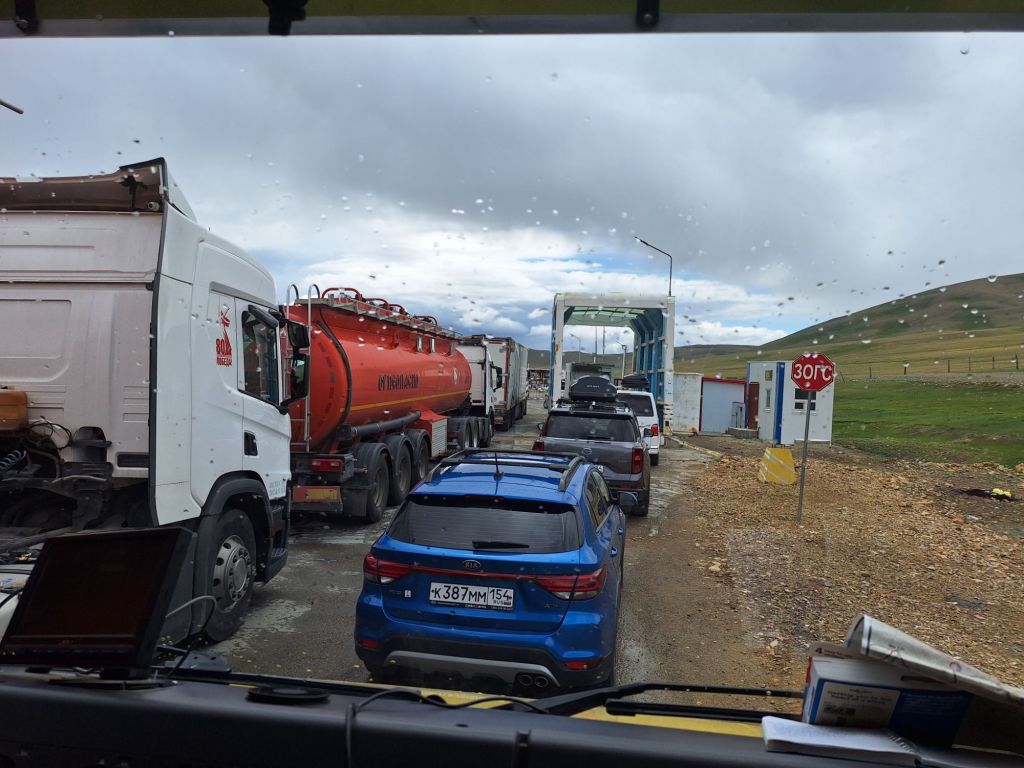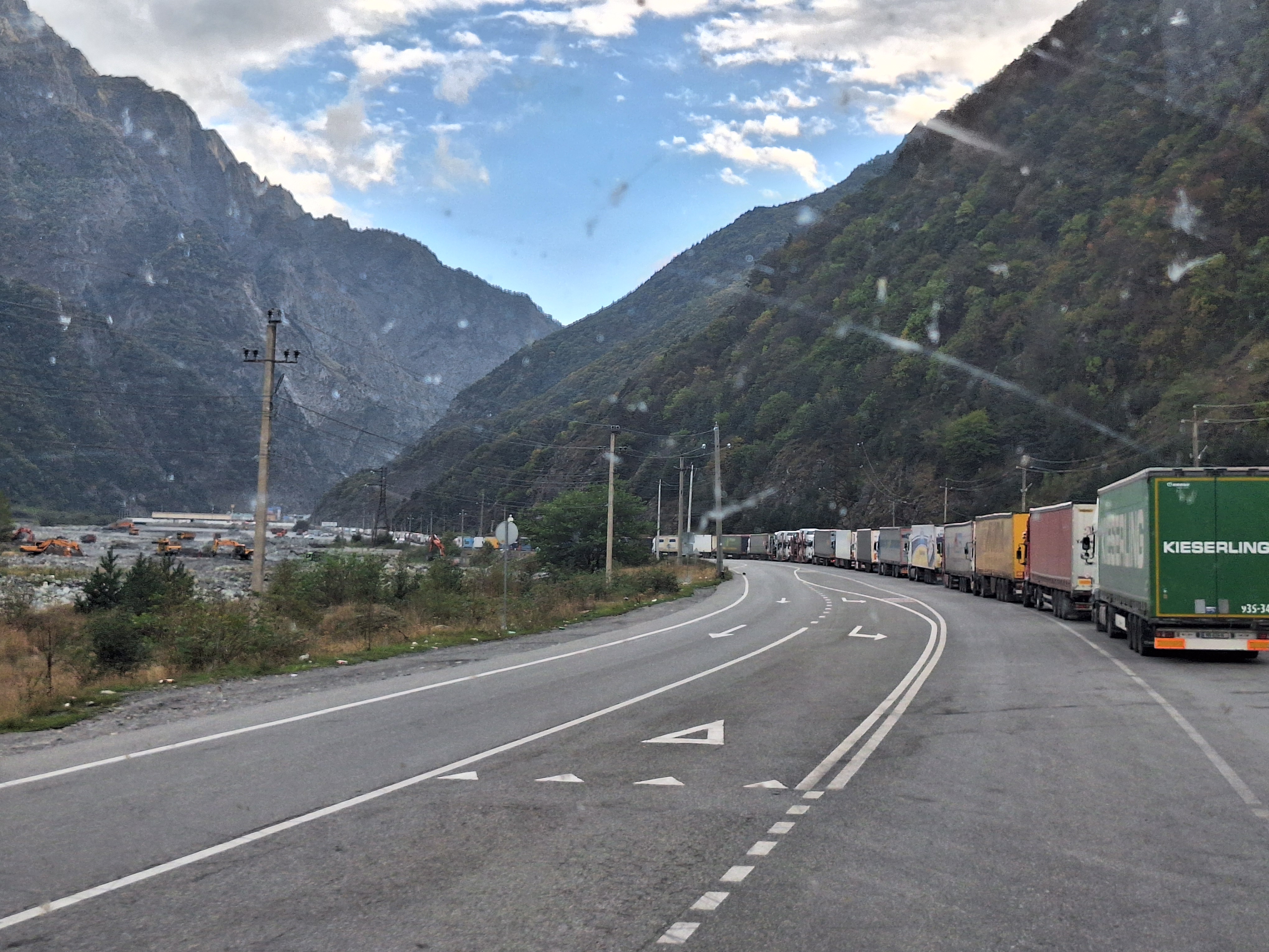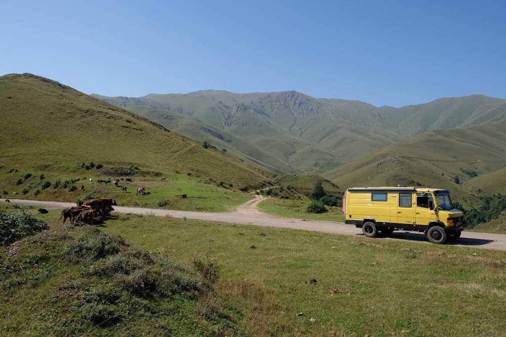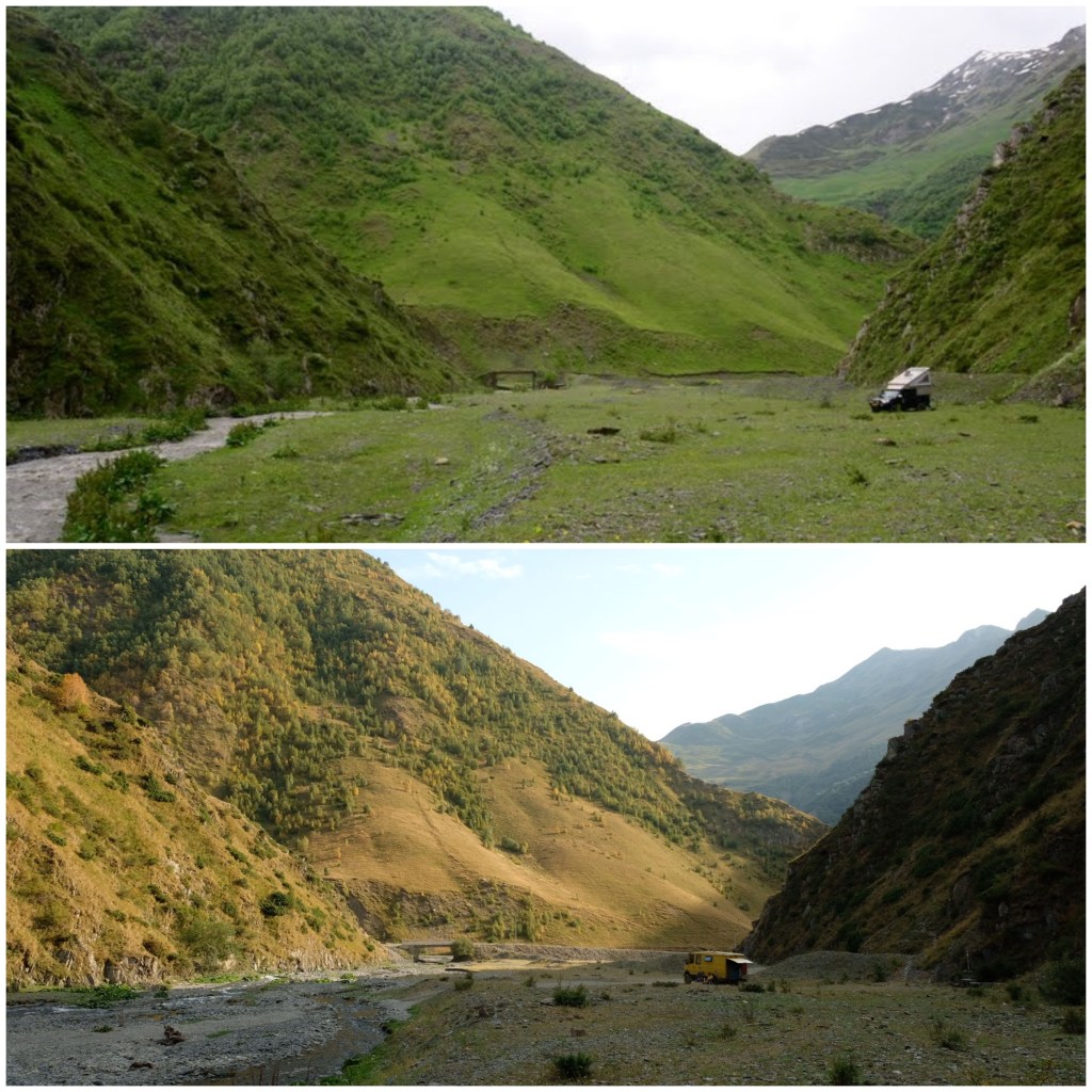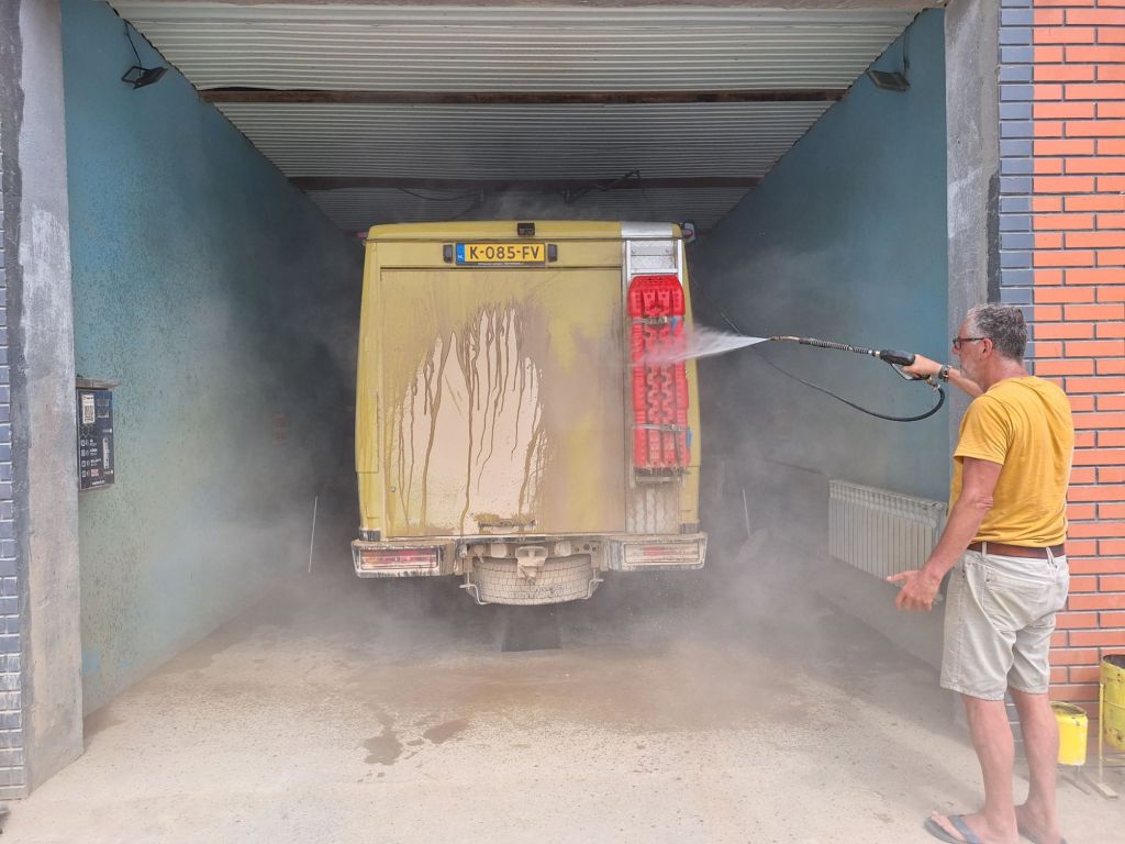 Donderdag 25 september staan we vroeg op. Zouden we de grens met Georgië kunnen halen vandaag? Als we de grens Dagestan- Tsjetsjenië willen oversteken, krijgen we de eerste onverwachte horde. We moeten met de Chef door de scanner en daar staan al wat vrachtwagens. Het proces is duidelijk erg traag en die vrachtwagens laten je niet voor gaan. Hoewel….een vriendelijke Georgiër gebaart dat we voor hem mogen. Het is een duister proces, maar we krijgen onze passen terug en we mogen door. In Tsjetsjenië vinden we achter een benzinestation een banja waar we kunnen douchen tegen betaling. Een vriendelijke dame wijst ons de weg. Het is heerlijk en brandschoon. Als we weer instappen maakt haar man duidelijk dat hij het geweldig vindt dat we als Nederlanders hier zijn. Daarna is hij heel expliciet over wat hij van de oorlog vindt. Hij zegt: Rusland is groot en dat schieten (hij maakt gebaren en geluid erbij) dat vindt hij slecht. Deze moslim is de eerste in onze hele reis die zich er over uitspreekt. We houden ons op de vlakte en vervolgen onze weg. De overgang naar Ingoesjetië is geen probleem (geen controles) maar als we Noord-Ossetië binnenrijden, vlak voor Vladikavkaz, dan is het weer raak. We moeten weer door de scanner. Joost maakt bezwaar en dat helpt een beetje, we mogen voor. Een beambte vraagt of we naar Moskou op weg zijn? Nou nee, naar Georgië. De man doet lachend een koe na met twee wijsvingers op z’n hoofd en geeft aan dat we vooral moeten oppassen voor overstekende koeien daar! Nou ja. De weg naar de grens is erg druk, maar we kunnen langs de rij met vrachtwagens. In 30 minuten zijn we de Russische grens gepasseerd. Het is inmiddels 18 uur. Dan verzeilen we in chaos. Het niemandsland tussen Rusland en Georgie bestaat uit een tweebaansweg met twee tunnels er in door het hooggebergte. Er is geen enkel toezicht dus iedereen wil elkaar passeren en dat gaat niet. Vrachtwagenchauffeurs gebaren dat we langs de rij kunnen rijden. Verderop blijkt dat een vrijwilliger het verkeer aan een kant tegenhoudt en zo het verkeer regelt. Dat helpt. Vlak voor de Georgische grens gaat alles door elkaar en worden we bijna aangereden. Ik doe nog een poging ons Russische geld aan iemand te schenken, maar dat kost wat overredingskracht! Ja, het is een gift! Ik ga weer lopend de grens over terwijl Joost met de Chef door de douane gaat. Na 4,5 uur staat we in Georgie. Het is bijna donker en ineens zien we allemaal Italisaanse campers? De parkeerplaats bij Sameba die we hebben uitgekozen om te overnachten, stroomt snel vol met een 20 (!) grote witte dozen. Het is bijna 1 graad, het is donker en we staan behoorlijk scheef, maar we zijn er. Kachel aan en wat eten. Hier zijn we ook gestart met de reis naar Mongolië en dus is het rondje hier rond: 20.000 kilometers. We nemen ons voor nog wat leuke dingen te doen voordat ik vanaf Trabzon naar huis vlieg en Joost de lange rit naar huis maakt.