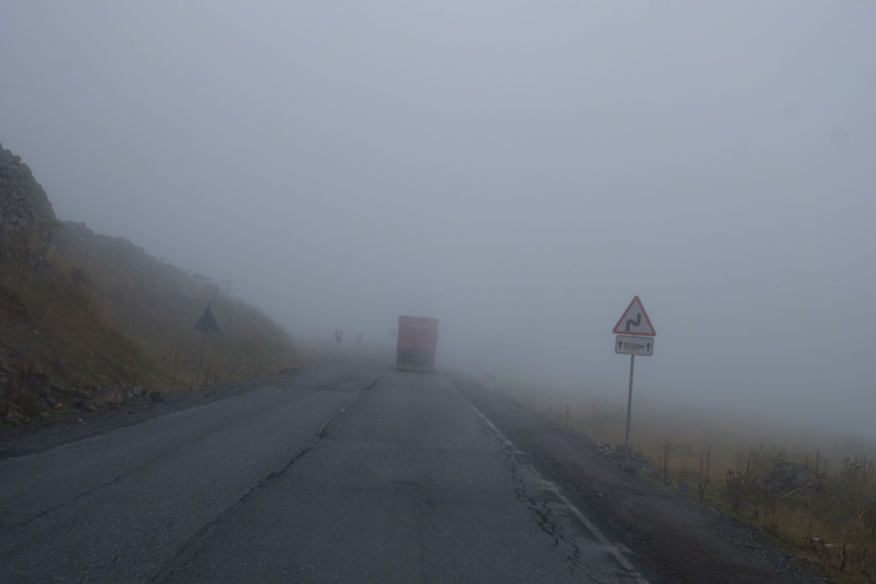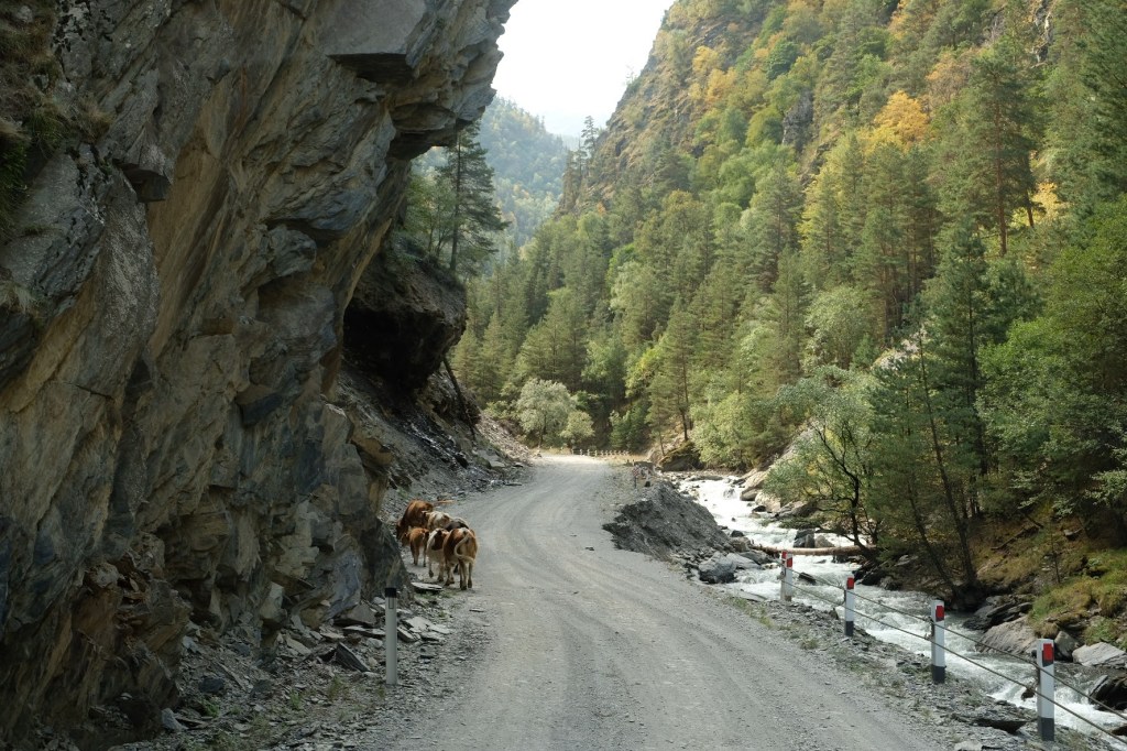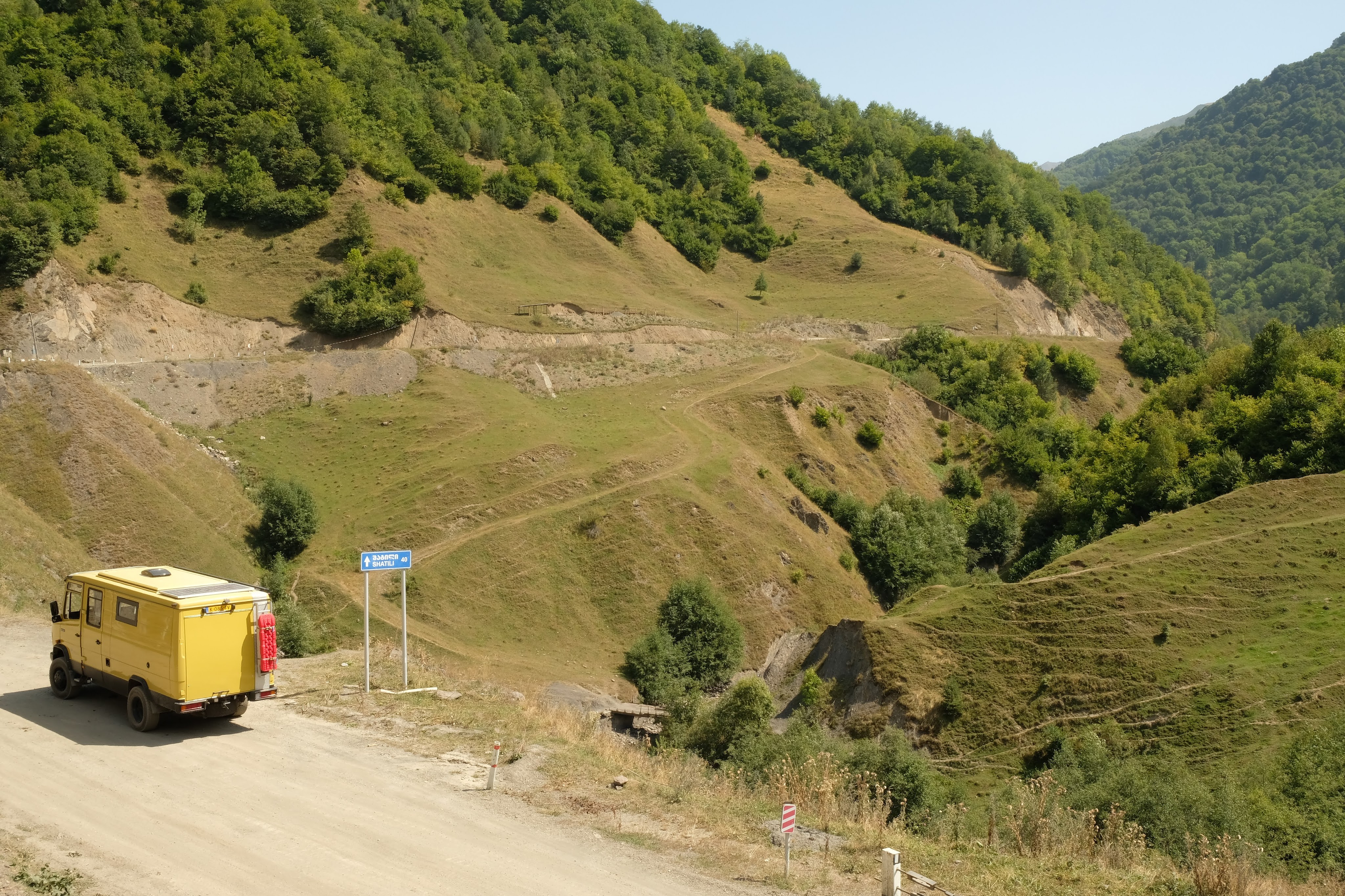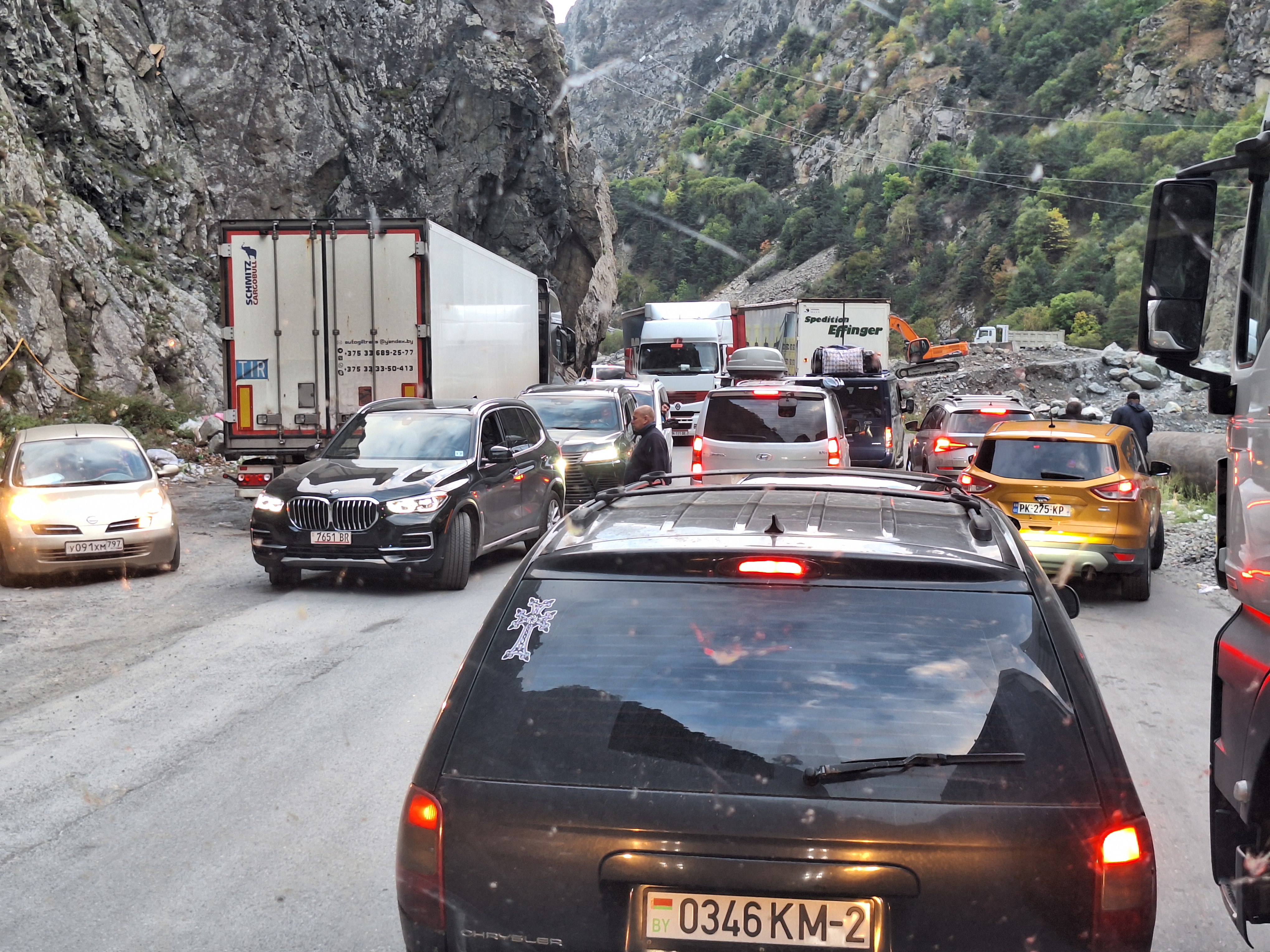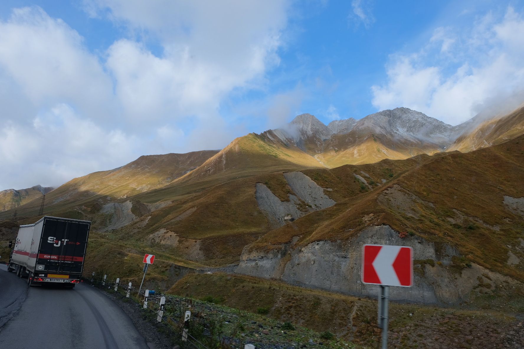 Donderdag 25 september staan we vroeg op. Zouden we de grens met Georgië kunnen halen vandaag? Als we de grens Dagestan- Tsjetsjenië willen oversteken, krijgen we de eerste onverwachte horde. We moeten met de Chef door de scanner en daar staan al wat vrachtwagens. Het proces is duidelijk erg traag en die vrachtwagens laten je niet voor gaan. Hoewel….een vriendelijke Georgiër gebaart dat we voor hem mogen. Het is een duister proces, maar we krijgen onze passen terug en we mogen door. In Tsjetsjenië vinden we achter een benzinestation een banja waar we kunnen douchen tegen betaling. Een vriendelijke dame wijst ons de weg. Het is heerlijk en brandschoon. Als we weer instappen maakt haar man duidelijk dat hij het geweldig vindt dat we als Nederlanders hier zijn. Daarna is hij heel expliciet over wat hij van de oorlog vindt. Hij zegt: Rusland is groot en dat schieten (hij maakt gebaren en geluid erbij) dat vindt hij slecht. Deze moslim is de eerste in onze hele reis die zich er over uitspreekt. We houden ons op de vlakte en vervolgen onze weg. De overgang naar Ingoesjetië is geen probleem (geen controles) maar als we Noord-Ossetië binnenrijden, vlak voor Vladikavkaz, dan is het weer raak. We moeten weer door de scanner. Joost maakt bezwaar en dat helpt een beetje, we mogen voor. Een beambte vraagt of we naar Moskou op weg zijn? Nou nee, naar Georgië. De man doet lachend een koe na met twee wijsvingers op z’n hoofd en geeft aan dat we vooral moeten oppassen voor overstekende koeien daar! Nou ja. De weg naar de grens is erg druk, maar we kunnen langs de rij met vrachtwagens. In 30 minuten zijn we de Russische grens gepasseerd. Het is inmiddels 18 uur. Dan verzeilen we in chaos. Het niemandsland tussen Rusland en Georgie bestaat uit een tweebaansweg met twee tunnels er in door het hooggebergte. Er is geen enkel toezicht dus iedereen wil elkaar passeren en dat gaat niet. Vrachtwagenchauffeurs gebaren dat we langs de rij kunnen rijden. Verderop blijkt dat een vrijwilliger het verkeer aan een kant tegenhoudt en zo het verkeer regelt. Dat helpt. Vlak voor de Georgische grens gaat alles door elkaar en worden we bijna aangereden. Ik doe nog een poging ons Russische geld aan iemand te schenken, maar dat kost wat overredingskracht! Ja, het is een gift! Ik ga weer lopend de grens over terwijl Joost met de Chef door de douane gaat. Na 4,5 uur staat we in Georgie. Het is bijna donker en ineens zien we allemaal Italisaanse campers? De parkeerplaats bij Sameba die we hebben uitgekozen om te overnachten, stroomt snel vol met een 20 (!) grote witte dozen. Het is bijna 1 graad, het is donker en we staan behoorlijk scheef, maar we zijn er. Kachel aan en wat eten. Hier zijn we ook gestart met de reis naar Mongolië en dus is het rondje hier rond: 20.000 kilometers. We nemen ons voor nog wat leuke dingen te doen voordat ik vanaf Trabzon naar huis vlieg en Joost de lange rit naar huis maakt.