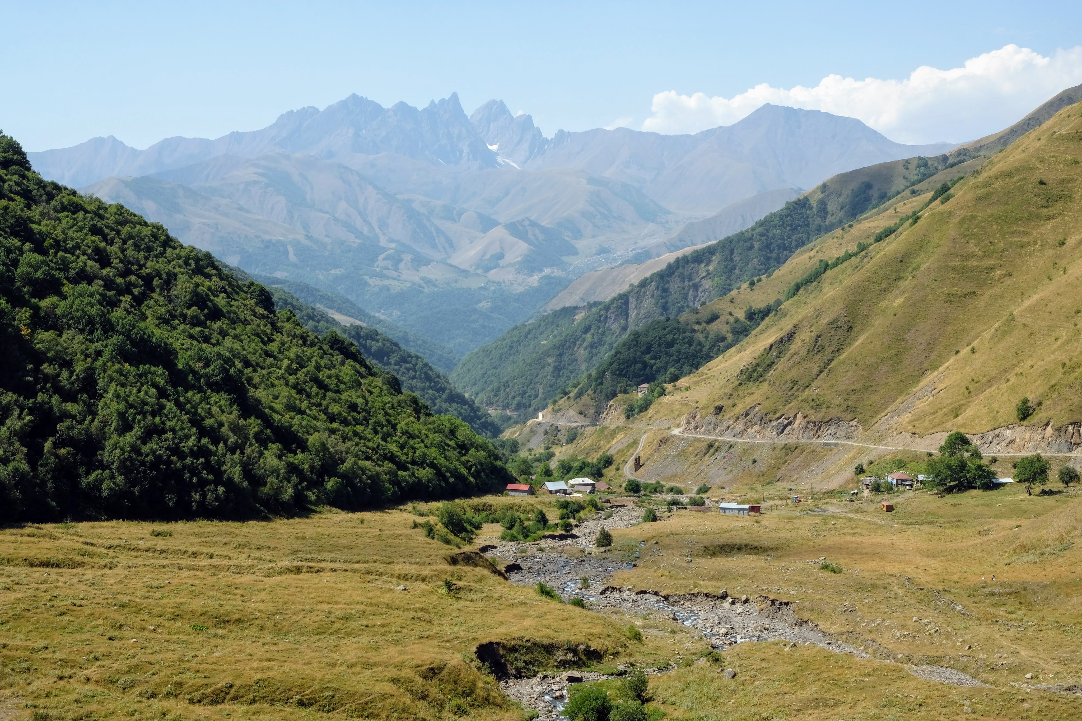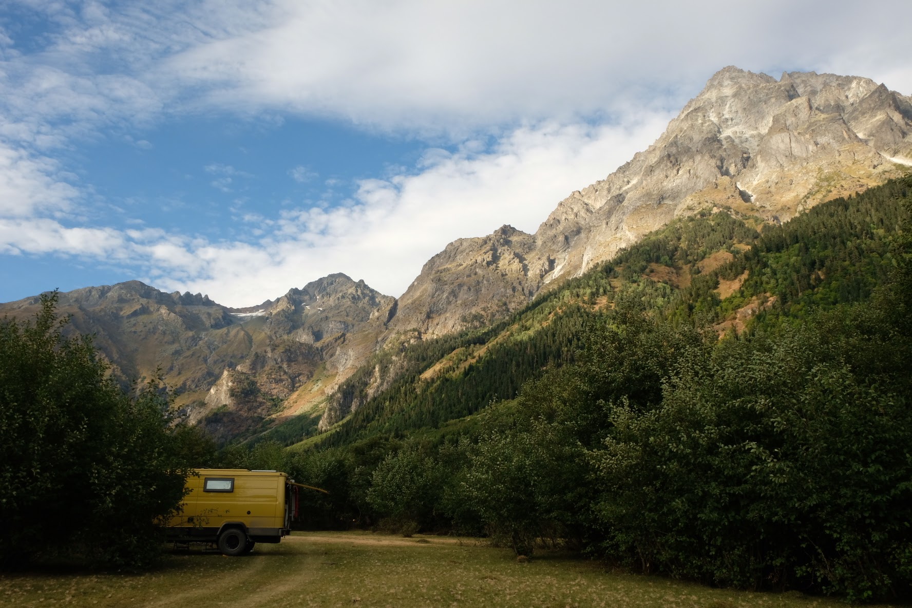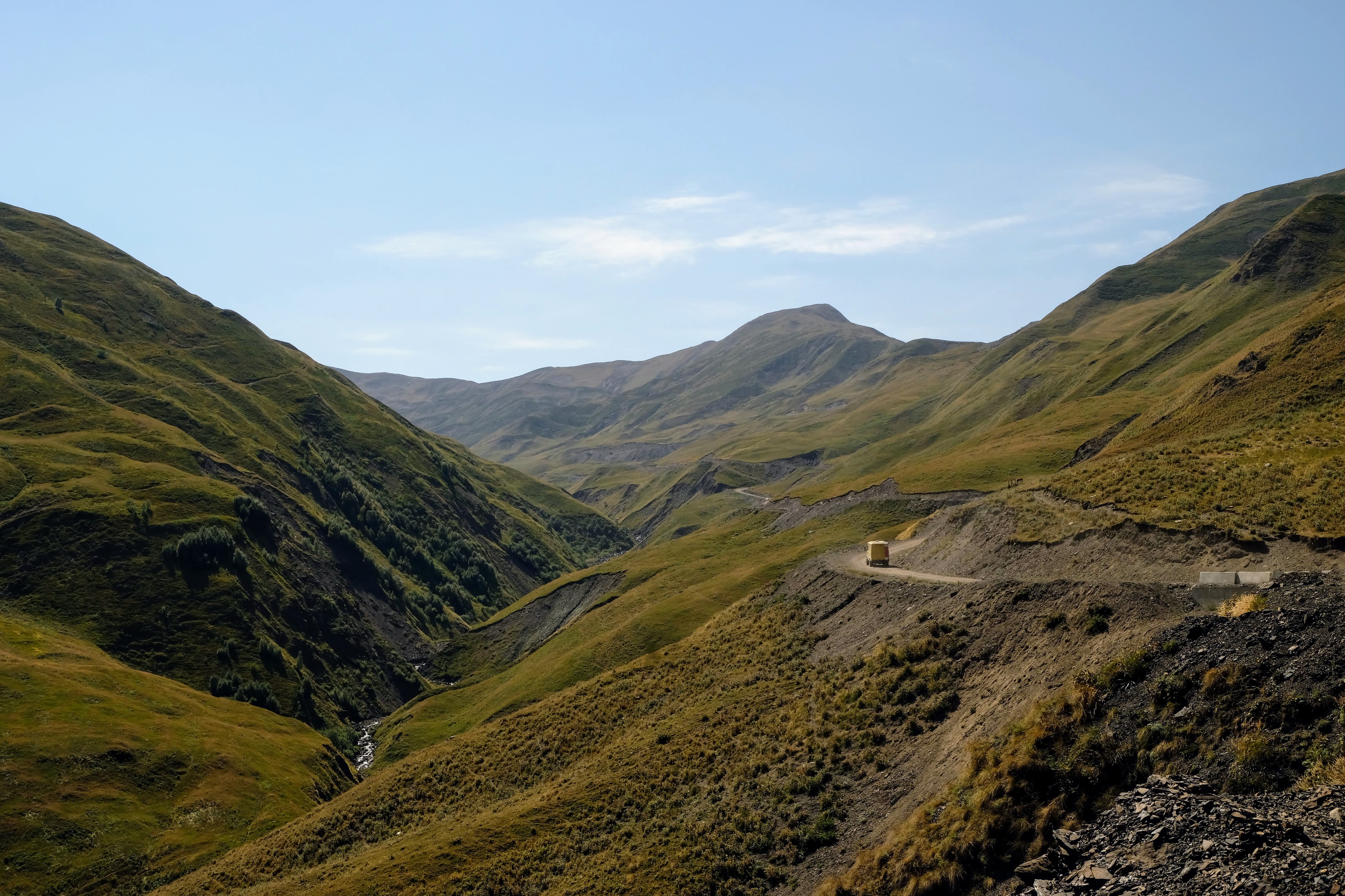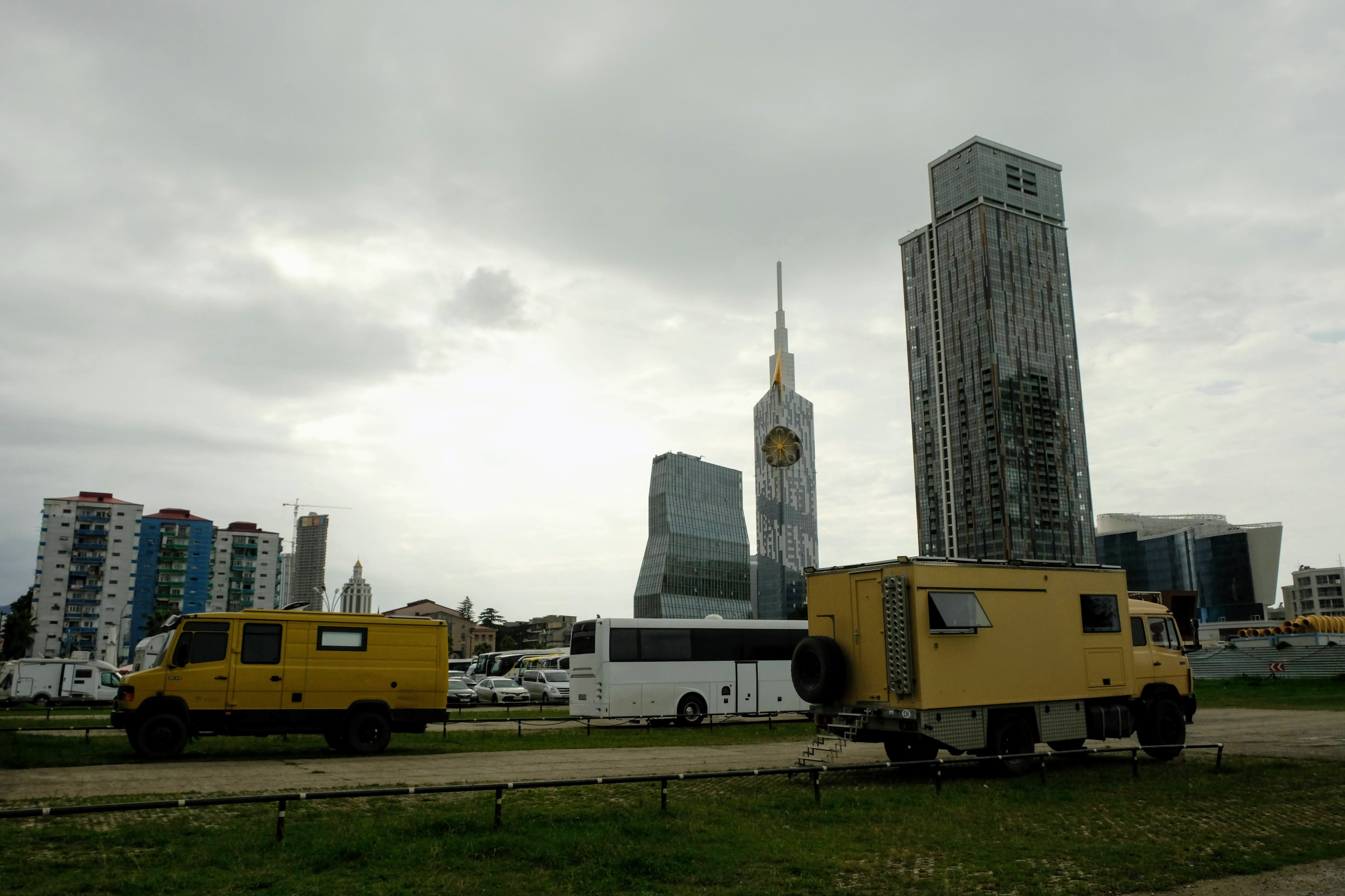 Donderdag 25 september staan we vroeg op. Zouden we de grens met Georgië kunnen halen vandaag? Als we de grens Dagestan- Tsjetsjenië willen oversteken, krijgen we de eerste onverwachte horde. We moeten met de Chef door de scanner en daar staan al wat vrachtwagens. Het proces is duidelijk erg traag en die vrachtwagens laten je niet voor gaan. Hoewel….een vriendelijke Georgiër gebaart dat we voor hem mogen. Het is een duister proces, maar we krijgen onze passen terug en we mogen door. In Tsjetsjenië vinden we achter een benzinestation een banja waar we kunnen douchen tegen betaling. Een vriendelijke dame wijst ons de weg. Het is heerlijk en brandschoon. Als we weer instappen maakt haar man duidelijk dat hij het geweldig vindt dat we als Nederlanders hier zijn. Daarna is hij heel expliciet over wat hij van de oorlog vindt. Hij zegt: Rusland is groot en dat schieten (hij maakt gebaren en geluid erbij) dat vindt hij slecht. Deze moslim is de eerste in onze hele reis die zich er over uitspreekt. We houden ons op de vlakte en vervolgen onze weg. De overgang naar Ingoesjetië is geen probleem (geen controles) maar als we Noord-Ossetië binnenrijden, vlak voor Vladikavkaz, dan is het weer raak. We moeten weer door de scanner. Joost maakt bezwaar en dat helpt een beetje, we mogen voor. Een beambte vraagt of we naar Moskou op weg zijn? Nou nee, naar Georgië. De man doet lachend een koe na met twee wijsvingers op z’n hoofd en geeft aan dat we vooral moeten oppassen voor overstekende koeien daar! Nou ja. De weg naar de grens is erg druk, maar we kunnen langs de rij met vrachtwagens. In 30 minuten zijn we de Russische grens gepasseerd. Het is inmiddels 18 uur. Dan verzeilen we in chaos. Het niemandsland tussen Rusland en Georgie bestaat uit een tweebaansweg met twee tunnels er in door het hooggebergte. Er is geen enkel toezicht dus iedereen wil elkaar passeren en dat gaat niet. Vrachtwagenchauffeurs gebaren dat we langs de rij kunnen rijden. Verderop blijkt dat een vrijwilliger het verkeer aan een kant tegenhoudt en zo het verkeer regelt. Dat helpt. Vlak voor de Georgische grens gaat alles door elkaar en worden we bijna aangereden. Ik doe nog een poging ons Russische geld aan iemand te schenken, maar dat kost wat overredingskracht! Ja, het is een gift! Ik ga weer lopend de grens over terwijl Joost met de Chef door de douane gaat. Na 4,5 uur staat we in Georgie. Het is bijna donker en ineens zien we allemaal Italisaanse campers? De parkeerplaats bij Sameba die we hebben uitgekozen om te overnachten, stroomt snel vol met een 20 (!) grote witte dozen. Het is bijna 1 graad, het is donker en we staan behoorlijk scheef, maar we zijn er. Kachel aan en wat eten. Hier zijn we ook gestart met de reis naar Mongolië en dus is het rondje hier rond: 20.000 kilometers. We nemen ons voor nog wat leuke dingen te doen voordat ik vanaf Trabzon naar huis vlieg en Joost de lange rit naar huis maakt.