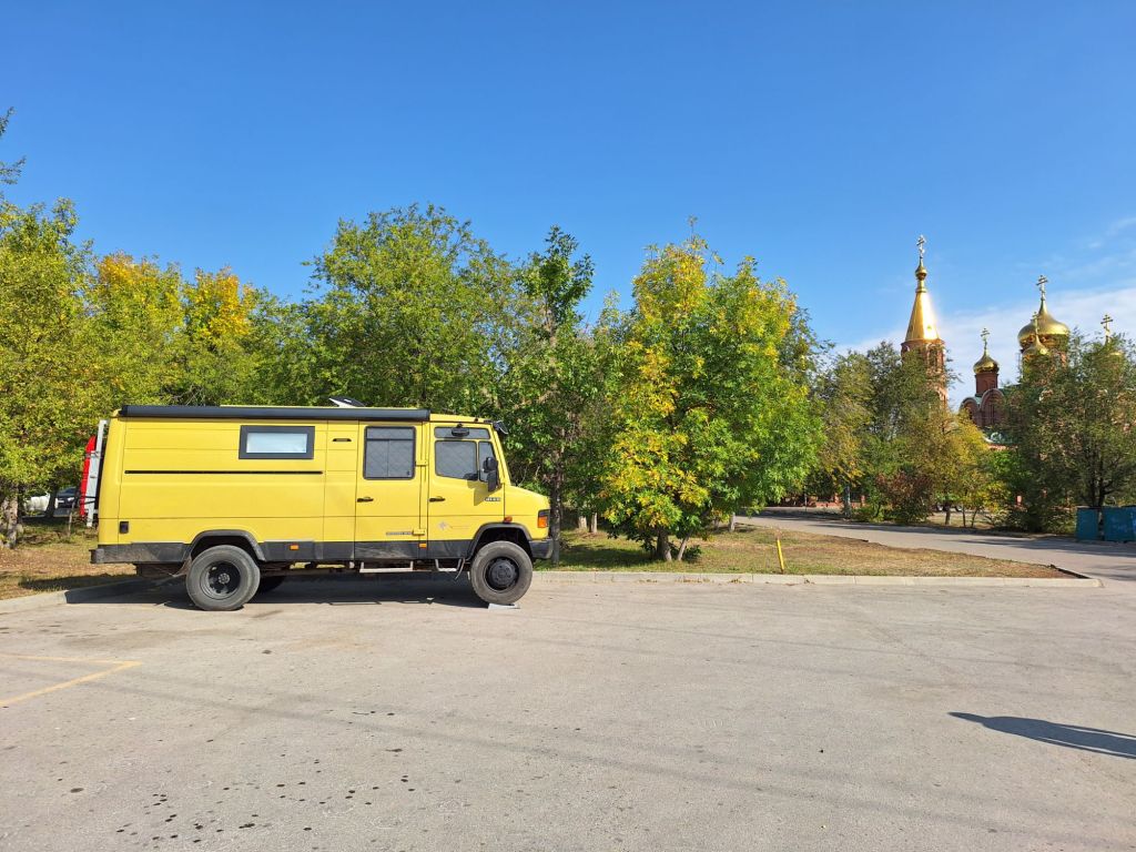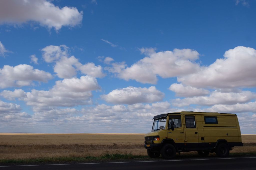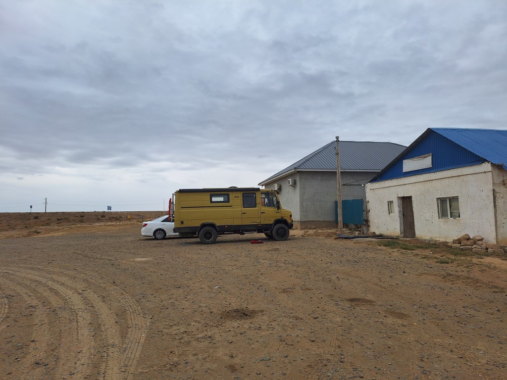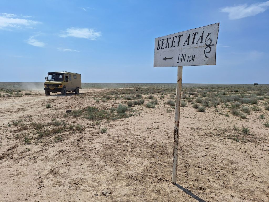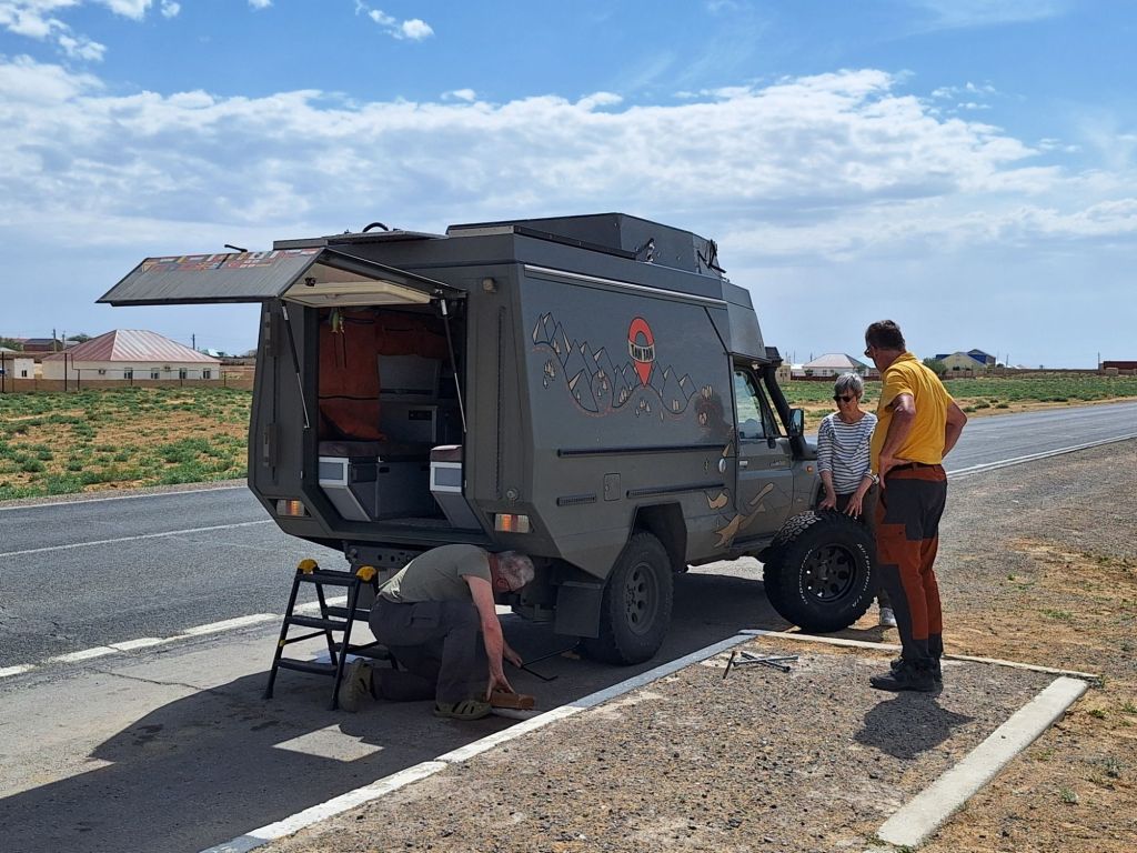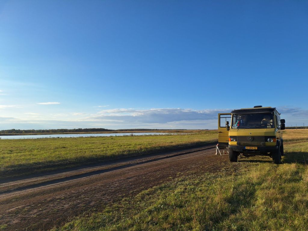 Na de grensovergang Rusland-Kazachstan op 14 september vinden we een plekje op een verlaten industrieterreintje bij een dorp. Het is druilerig en fris. De volgende dag tovert gelijk een glimlach op ons gezicht. Mensen zwaaien vriendelijk, de diesel is 50 cent en ons wordt koffie aangeboden. Het is goed om weer in Kazachstan te zijn! We rijden in Petropavl, na bezoek aan een supermarkt, naar een truckservice. De ontvangst is prima door een collega die Duits spreekt en ze gaan direct aan de slag om ook de andere rubbers te vervangen van de voorste bladveren. Ondertussen eten wij een lekker bordje bij de Stolavaya (kantine) op het terrein en als we terugkomen zijn ze al klaar. We vinden een plekje aan een meertje waar we 5G internet hebben zodat we de jarige Benjamin kunnen feliciteren. We hebben een lange en saaie weg te gaan om vanuit Siberië weer terug te rijden naar Georgië, zo’n 3100 km. De volgende dag rijden we langs Qastanay en vinden een plek bij een stadstrandje bij Livakovsk. De zon schijnt, maar het is ’s avonds snel fris. We rijden door de eindeloze steppe verder en slapen weer op een plek tussen wat bomen, zodat we lekker kunnen douchen. De weg is wel merkbaar beter dan in 2019. Ook het berucht slechte stuk tussen Qarabutaq en Aktobe is zowaar opgeknapt. We parkeren echt middenin het centrum van de grote stad Aktobe vlakbij een waterpretpark en lopen langs de boulevard naar Revolver, waar we in mei zo heerlijk hebben gegeten met Saskia en Martijn. De sfeer in de stad en het weer zijn aangenaam en overal branden lichtjes. We slapen prima. De volgende dag maken we een rondje van 14 km door de stad. We drinken lekkere koffie, bekijken een plaatselijk museum en lopen naar het standbeeld van een beroemde vrouwelijke scherpschutter. We lunchen lekker bij een Italiaan en bezoeken daarna het kleine museum over de vrouwelijke scherpschutter en lokale held, Aliya Moldagulova. Al vroeg verloor ze haar ouders en op jonge leeftijd meldde zij zich aan bij een school voor vrouwelijke scherpschutters. Vrouwen bleken dat vak goed te verstaan. Naar verluidt heeft ze 78 Duitsers doodgeschoten en dat is knap als je al op je 18e zelf het leven laat op het slagveld. Hoe dan ook, een bijzonder verhaal. Daarna gaan we nog even bij een grote mall langs, maar daar vinden we niets aan. Als we relaxen in de Chef met een glas wijn en een kaasje komt er nog een man langs die zijn zoon wil aansporen om met ons te praten en in de Chef te kijken. Daar heeft de tiener overduidelijk geen zin in! Ook de volgende morgen krijgen we bezoek. Het duurt even maar dan is duidelijk dat we met een vriendelijke christelijke missionaris van doen hebben. Of we de bijbel lezen en bij ons hebben? Of we naar de kerk gaan? Hij neemt er genoegen mee dat we volgens Christelijke waarden zijn opgevoed en daar naar leven. Goed bedacht, hè?