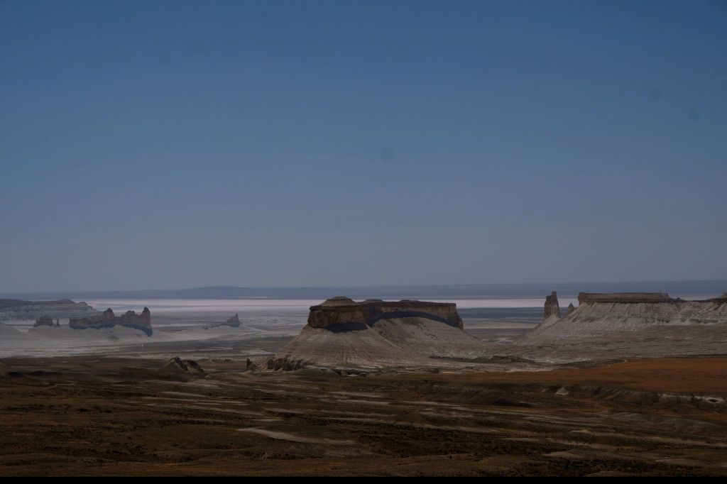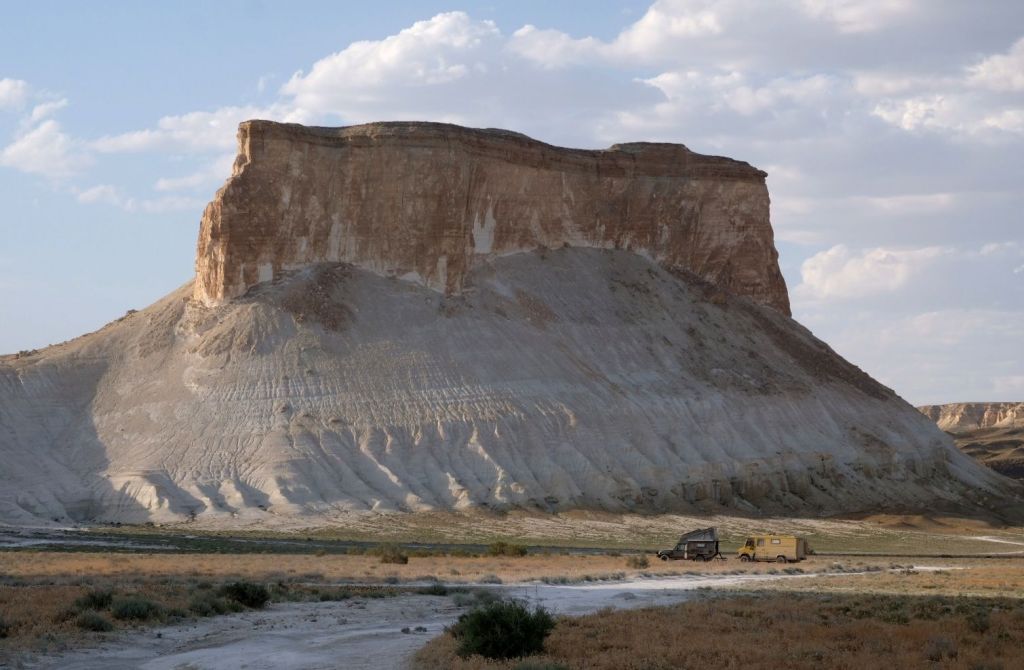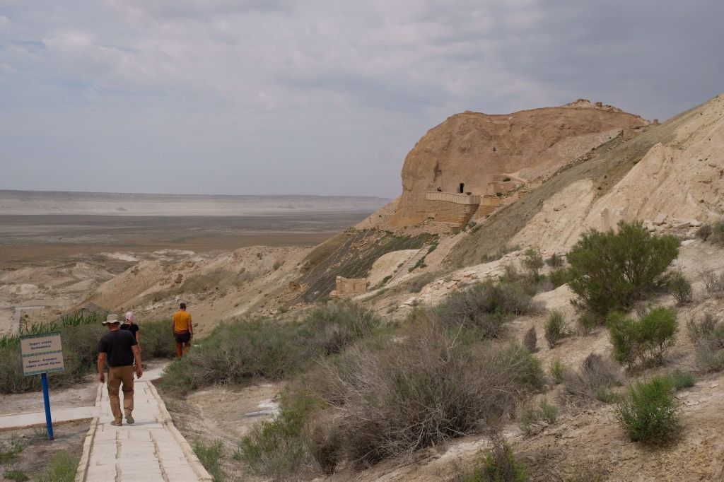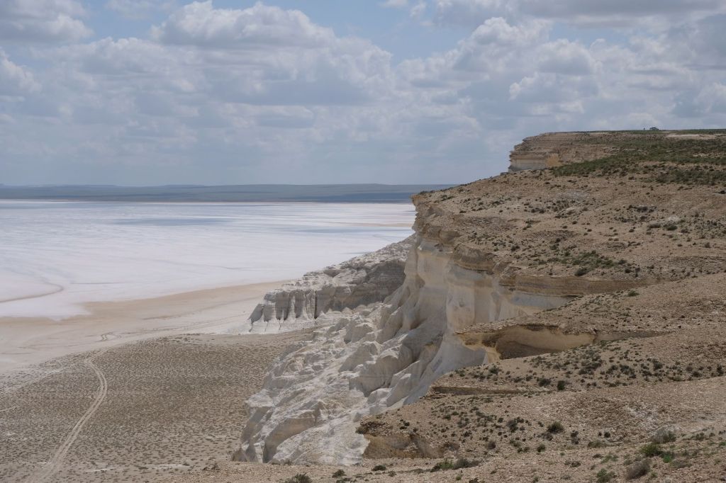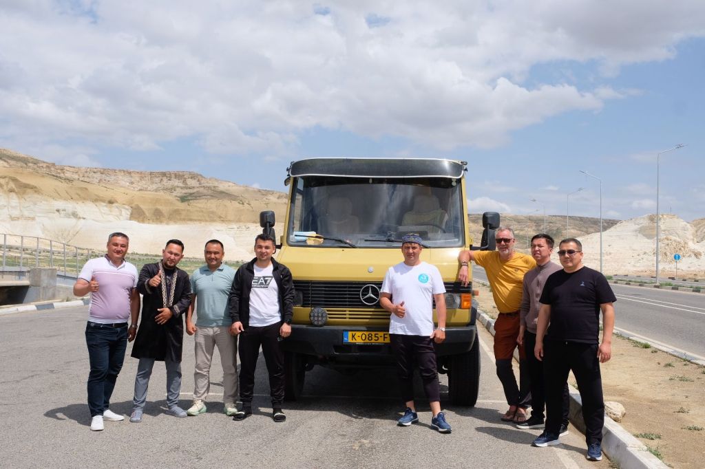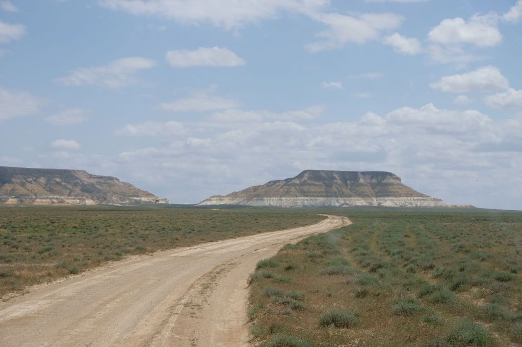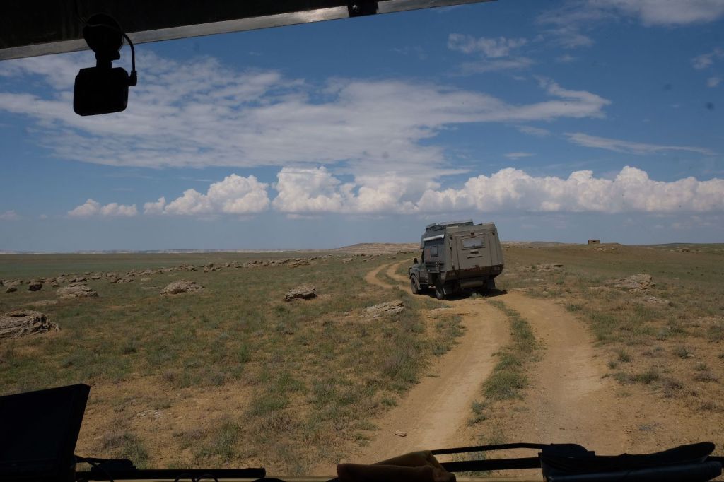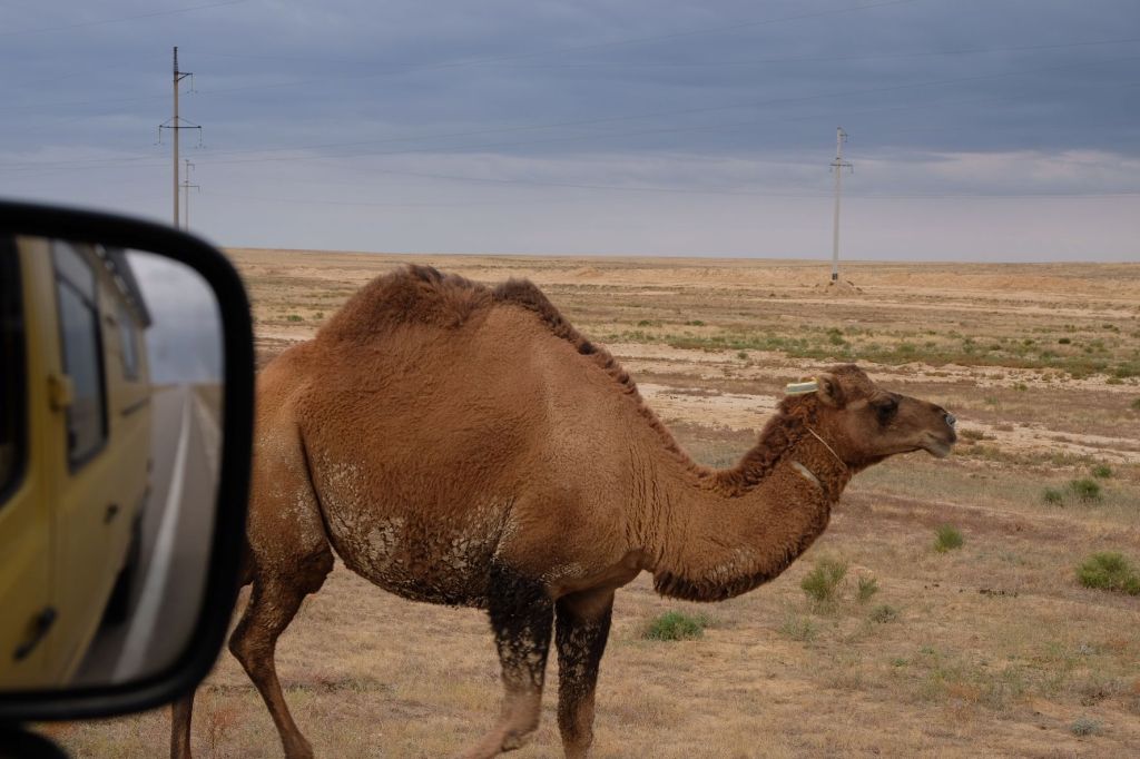 Op 20 september rijden we van Aktobe een lang rit van 400 km over de eindeloze steppen. En eigenlijk heeft ook dat wel wat. Af en toe zien we kamelen, maar ook groepjes combines die de eindeloze vlaktes met graan in formatie maaien, een fraai gezicht. Ik heb gelezen dat de weg van Muchir naar Qulsary inmiddels asfalt is geworden en dan zouden we het Akkermesh plateau kunnen bezoeken. We vinden het begin van de weg, maar al snel zijn er twee bypasses door een soort fesh-fesh zand. Hmmm, geen goed idee. We draaien om en vinden een plekje in het dorp waar we wat beschut staan van de felle wind. Het duurt niet lang of er komt een dame langs met een telefoon in haar hand. We mogen niet op het parkeerterrein van het schooltje staan, maar ze willen ons naar een betere plek begeleiden. We rijden achter haar man aan, die ze heeft opgetrommeld, en we worden naar het plaatselijke wegrestaurant gereden. Ach ja, geen topplek, maar we doen het er mee. Ik maak een lekker visje met zoete aardappelpuree en salade. Na he ontbijt rijden we in de miezerregen naar Atyrau, een grote stad met veel olie-industrie. We wassen de Chef in een wasstraat, waarbij we de eigenaar iedere keer moeten vragen om met z’n telefoon digitaal te betalen. Hij begrijpt niet helemaal dat we eerst willen afspuiten, dan sop en dan nog afspoelen. Zal best, maar onze Chef glimt weer als vanouds! Als we de stad verder inrijden, raakt een man aan de kant van de weg in vervoering als ie ons ziet. Het filmpje is van de dashcam en kort, maar je ziet duidelijk dat hij een hartje maakt als we langsrijden. We parkeren in het Retro Park en krijgen dan ook gezelschap van Duitsers met een grote MAN-vrachtwagen. We kletsen wat en wandelen dan via het park, langs de rivier naar de plaatselijk mall, waar ook weer niets te beleven valt. We eten echt Kazachs bij Sarqyt. Ik eet mijn favoriete salade met krokante aubergine en een gestoofde runderrib. Joost waagt zich aan een gerecht met merg en een enorm stuk lamsstoofvlees. We drinken er een alcoholvrije mojito limonade bij, want moslims schenken geen alcohol! Het was heerlijk.